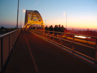 July 20th, 2002 86th Nijmegen Four Day March That ham sandwich may have tasted of eternity at the time, there are moments in life when reality forces you to adjust your experience of it. Last season I had gained twenty kilos through walking. I'd resolved not to blame myself for that for a full year, because it was partly caused by the fact that, after 21 years of chainsmoking, I had quit doing that. But that year had passed by now. So when, this time, I stepped onto the Wedren in the very early morning, there was no sandwich for me. But this was tuesday morning's reality.