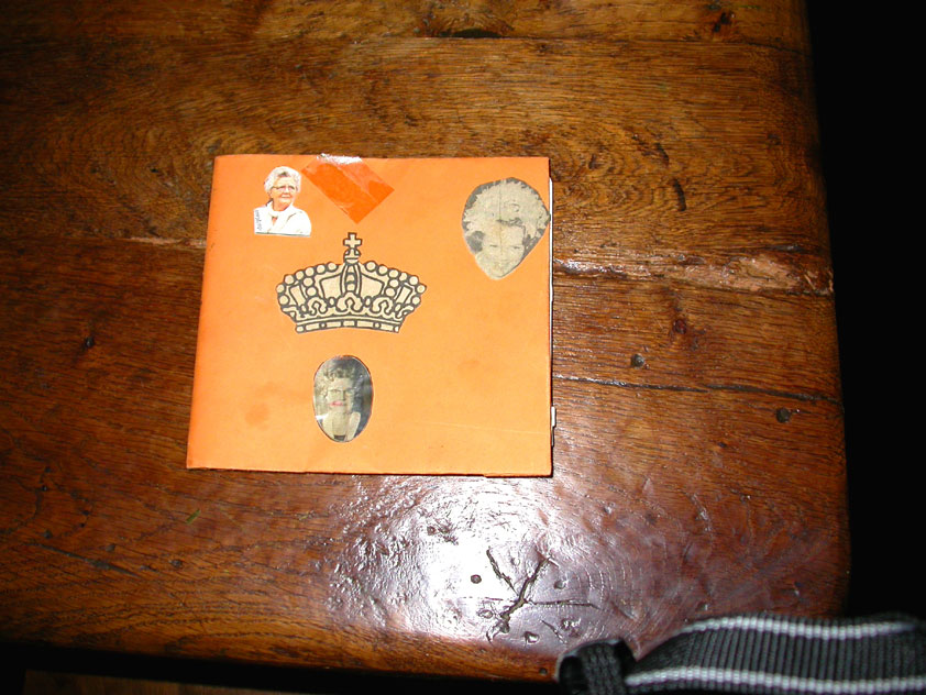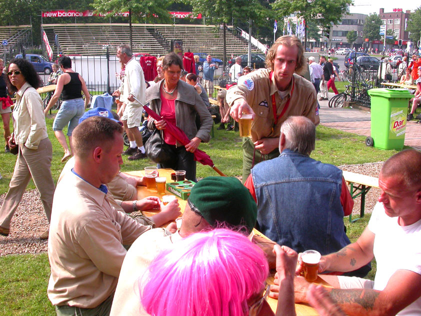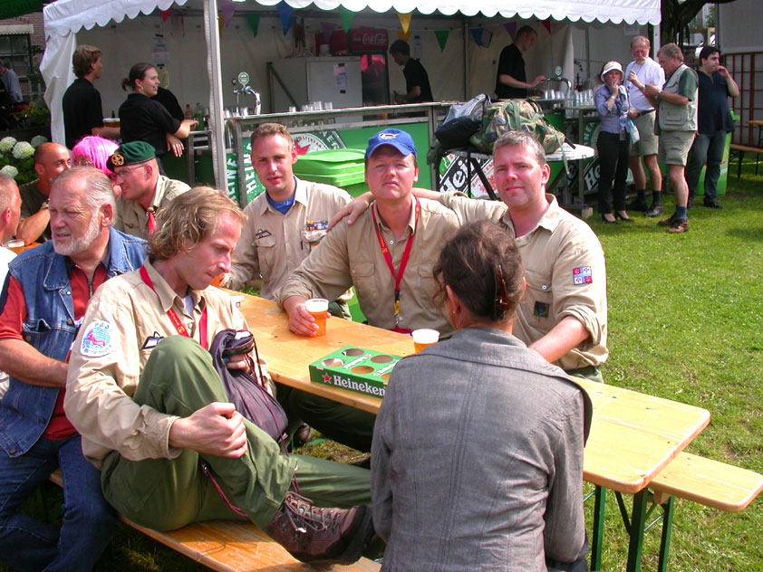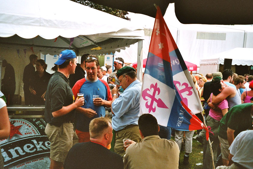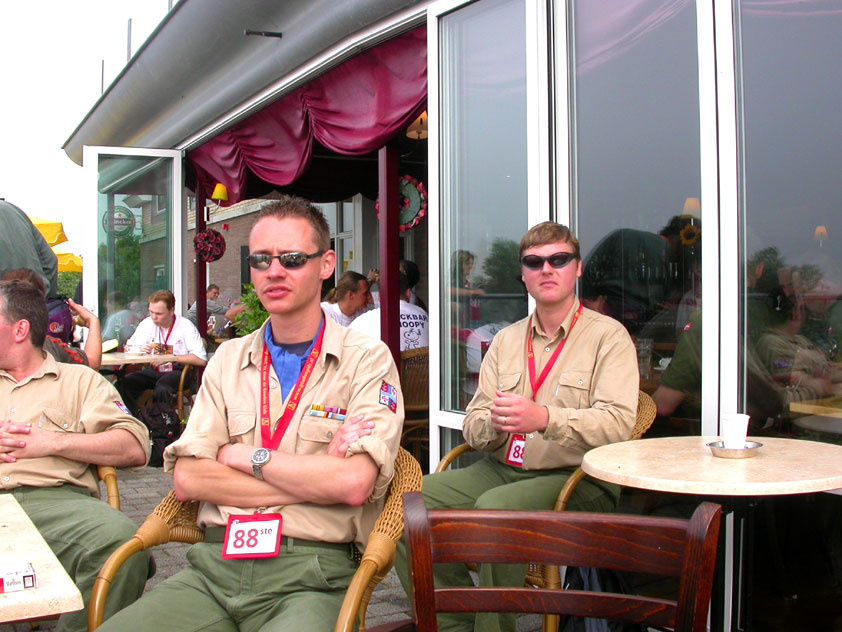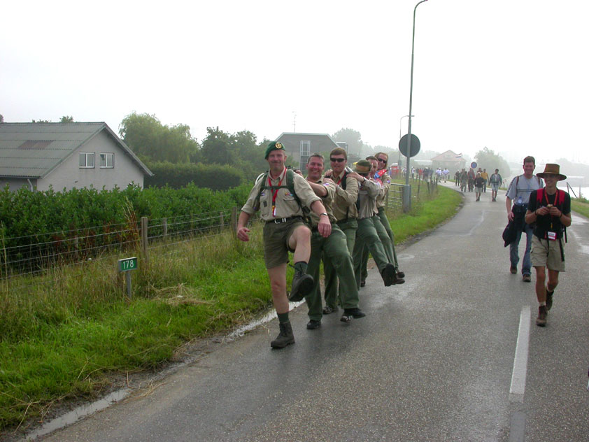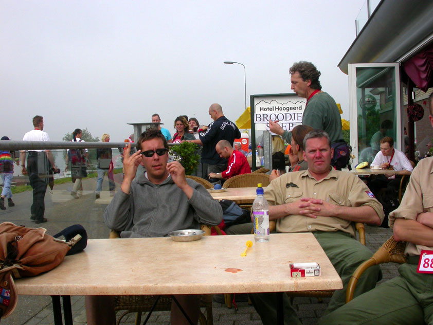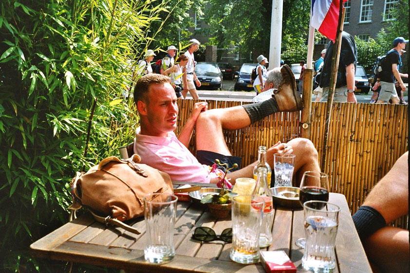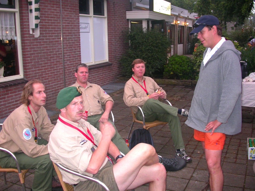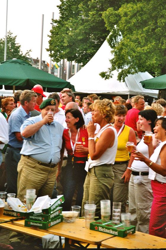 July 24th, 2004 88th Nijmegen Four Day March Nijmegen was a dramatic affair this year, even before we'd lifted a foot. This wasn't due to the Four Day Marches, but to the wedding of Rijkman & Derkman. Of, more precisely and better, to what followed it. The fights about it had not yet been resolved, namely. And I had, twice over, tried to convene the meeting, loudly demanded by some, but had to conclude, both times, that ultimately, there was not enough interest in it. So when that meeting didn't take place for the second time in a row, and I had, from that, concluded it would not take place at all, I decided that, because I had hitherto, being the chairman of the Wandelsoc., kept my personal opinion about the whole affair to myself (I was to organize that meeting after all, so I thought it wise to save my personal opinion for that meeting), now I could no longer do so at that meeting, I should give it now, and did so by way of an email, in which I not only called Ronald Fischer, but Henk van der Schelden, Peter Weij and Fred Regts too, everything under the sun. Day 0 This created a lot of bad blood on, particularly, the latter two's part. Not entirely unjustly so, I found after some contemplation, and so, as we met eachother at the Vereeniging on Monday afternoon, I offered them my apologies for calling them names in that mail, and for forgetting to stipulate that Fred was one of those who had been willing to have that meeting. Those apologies set the tone of that afternoon. Because as Theodoor Snodendroom and Bert van Prijzen, Second and First Friend of the Wandelsoc., looked at it all amused and approvingly, with Jasper Nales (who did not march along this year, because he was to late to enroll, but could not escape the Four Day Marches' Fever, and thus did come around to piss up at the Vereeniging, with Ralfie, who did march along), today became the Day of Atonement, and all infighting disappeared under the beered-out afternoon sun (not in the least because Ronald Fischer exerted himself in getting beer for everyone, and did not contradict Barend's remark that this was Fischer's way of apologizing). Apparently, the Four Day Marches, in all their horrific beauty, exact this respect for them: that all energy is needed for them, and there is therefore neither time, nor place for distracting argument. That won't be the case for long then, anymore. Since if it is up to people like Taeke van der Meer (Taeke is the unbelievable asshole who arranged that, come next year, men between 15 and 50 years of age no longer have to march 50 km for their cross, but only 40, and who dared to have the judge substantiate this with equality between men and women - and I am all for emancipation, but they should have made those women march the 50; enough of them do anyway, and toning down the distance for men devaluates the achievement of the brave who have, in decades past, proven to be better men than Taeke van der Meer, whom I find a shootable bastard, and with that I do NOT mean that I think he should be shot, because I OPPOSE violence, but that that 'shootable' is the sentiment that rushes through me when I hear his name because I am correspondingly angry, but nevertheless I am, in Holland, no longer allowed, since Fortuyn, to say that Taeke van der Meer, who is a shootable bastard, is a shootable bastard, one gets fired for this nowadays, in this blasted country that goes to the dogs thanks to the right-wing mob, is my personal opinion, but all that aside) the Four Day Marches will shortly be a festive parade for sissies. Good. Then at least we can turn our minds to more serious matters, like bashing eachother's heads in over a lack of beertent. Where was I? Oh yes, the Friday night. Utterly sociable, therefore. And not just at the Vereeniging. Because even at the Holy Mother Prakke's home, on the van Heemstralaan in Arnhem, where Jochem, Max, Henk, Raymond, Lourens and I stayed for the duration of the Four Day Marches, it was a pleasant and sociable reunion. To which splendour was added by a gift on behalf of us all, Jochem's brother Mark included, to Lous Prakke: a new cast-iron grid, for her fireplace. And then we had a great time, I myself partly because a booklet appeared on the table, about our Royal House, once glued together and written by Jochem - who definitely did not want its existence to be made public, whereupon I decided to photograph all its pages and put them on the Internet. It's cute, namely. Day 1 The next morning, very early on it, Lous treated us to eggs and bacon, in the kitchen. Won-der-ful. I was so taken aback by it, that I forgot to take my camera along. But this was a good thing, for it might otherwise not have survived. It was raining cats and dogs, namely, at the beginning of this Day Of Lent. There was therefore much complaining about this, nineteen to the dozen, by the legion-of-sissies, but I found it a pleasant vexation, that distracted me somewhat from what I knew was awaiting me: trouble, given my not fully healed blisters and skinscrapes.