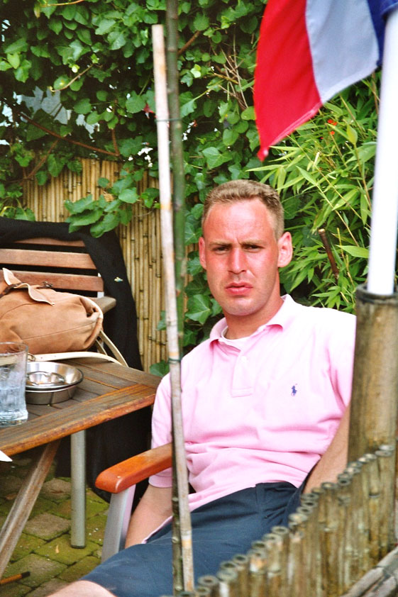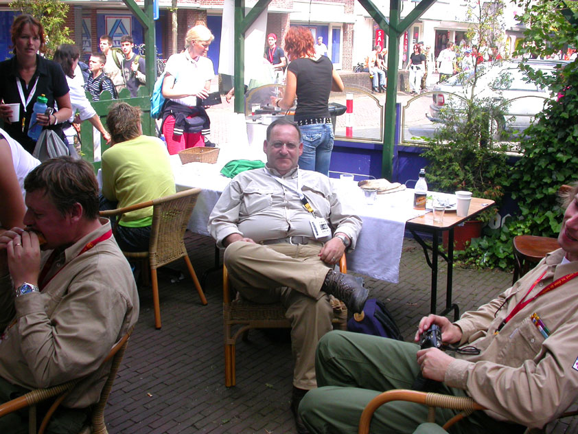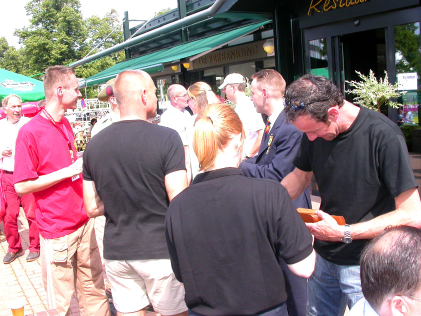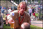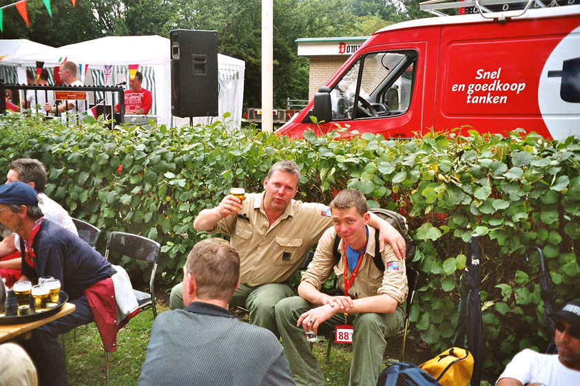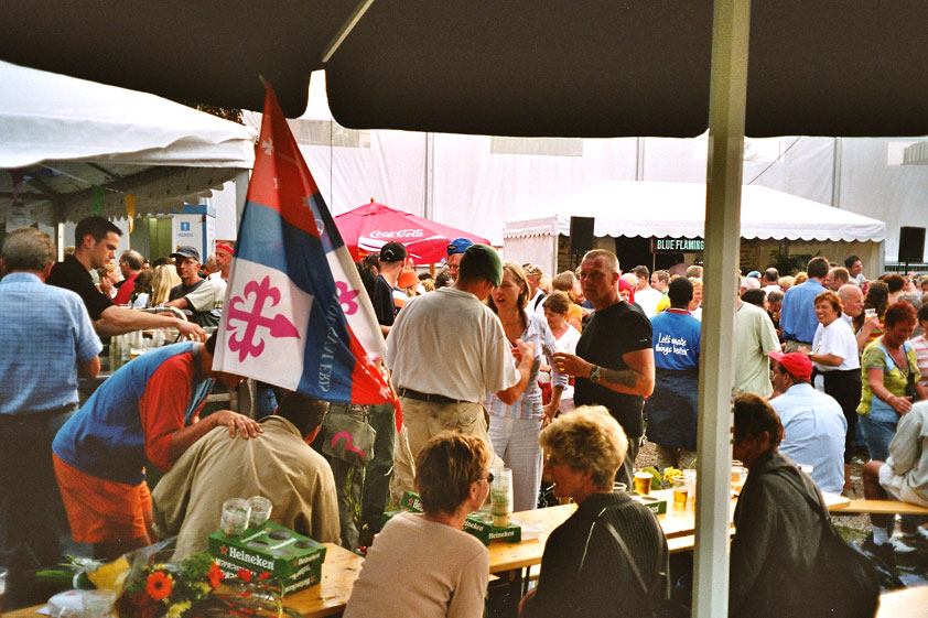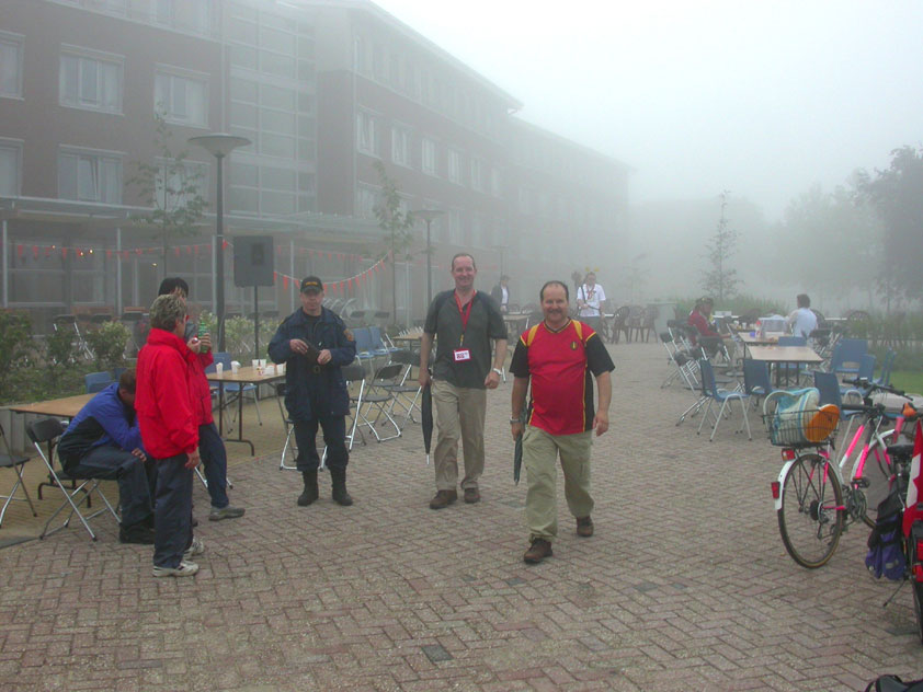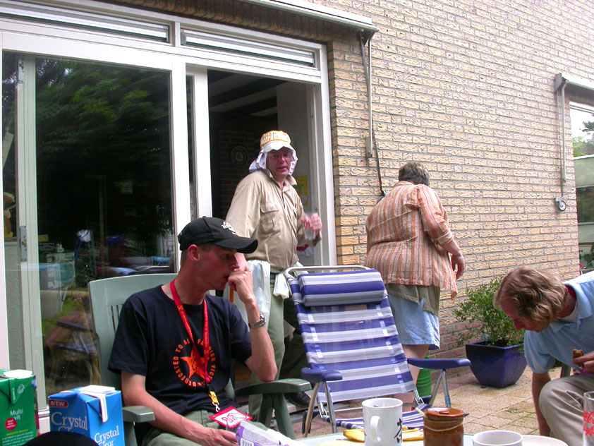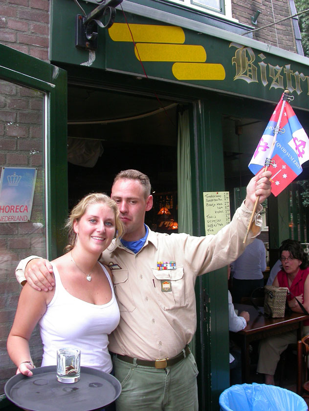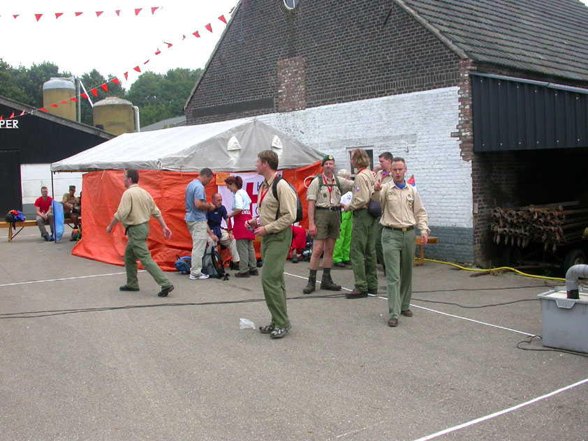 July 24th, 2004 88th Nijmegen Four Day March Nijmegen was a dramatic affair this year, even before we'd lifted a foot. This wasn't due to the Four Day Marches, but to the wedding of Rijkman & Derkman. Of, more precisely and better, to what followed it. The fights about it had not yet been resolved, namely. And I had, twice over, tried to convene the meeting, loudly demanded by some, but had to conclude, both times, that ultimately, there was not enough interest in it. So when that meeting didn't take place for the second time in a row, and I had, from that, concluded it would not take place at all, I decided that, because I had hitherto, being the chairman of the Wandelsoc., kept my personal opinion about the whole affair to myself (I was to organize that meeting after all, so I thought it wise to save my personal opinion for that meeting), now I could no longer do so at that meeting, I should give it now, and did so by way of an email, in which I not only called Ronald Fischer, but Henk van der Schelden, Peter Weij and Fred Regts too, everything under the sun. Day 0 This created a lot of bad blood on, particularly, the latter two's part. Not entirely unjustly so, I found after some contemplation, and so, as we met eachother at the Vereeniging on Monday afternoon, I offered them my apologies for calling them names in that mail, and for forgetting to stipulate that Fred was one of those who had been willing to have that meeting. Those apologies set the tone of that afternoon. Because as Theodoor Snodendroom and Bert van Prijzen, Second and First Friend of the Wandelsoc., looked at it all amused and approvingly, with Jasper Nales (who did not march along this year, because he was to late to enroll, but could not escape the Four Day Marches' Fever, and thus did come around to piss up at the Vereeniging, with Ralfie, who did march along), today became the Day of Atonement, and all infighting disappeared under the beered-out afternoon sun (not in the least because Ronald Fischer exerted himself in getting beer for everyone, and did not contradict Barend's remark that this was Fischer's way of apologizing). Apparently, the Four Day Marches, in all their horrific beauty, exact this respect for them: that all energy is needed for them, and there is therefore neither time, nor place for distracting argument. That won't be the case for long then, anymore. Since if it is up to people like Taeke van der Meer (Taeke is the unbelievable asshole who arranged that, come next year, men between 15 and 50 years of age no longer have to march 50 km for their cross, but only 40, and who dared to have the judge substantiate this with equality between men and women - and I am all for emancipation, but they should have made those women march the 50; enough of them do anyway, and toning down the distance for men devaluates the achievement of the brave who have, in decades past, proven to be better men than Taeke van der Meer, whom I find a shootable bastard, and with that I do NOT mean that I think he should be shot, because I OPPOSE violence, but that that 'shootable' is the sentiment that rushes through me when I hear his name because I am correspondingly angry, but nevertheless I am, in Holland, no longer allowed, since Fortuyn, to say that Taeke van der Meer, who is a shootable bastard, is a shootable bastard, one gets fired for this nowadays, in this blasted country that goes to the dogs thanks to the right-wing mob, is my personal opinion, but all that aside) the Four Day Marches will shortly be a festive parade for sissies. Good. Then at least we can turn our minds to more serious matters, like bashing eachother's heads in over a lack of beertent. Where was I? Oh yes, the Friday night. Utterly sociable, therefore. And not just at the Vereeniging. Because even at the Holy Mother Prakke's home, on the van Heemstralaan in Arnhem, where Jochem, Max, Henk, Raymond, Lourens and I stayed for the duration of the Four Day Marches, it was a pleasant and sociable reunion. To which splendour was added by a gift on behalf of us all, Jochem's brother Mark included, to Lous Prakke: a new cast-iron grid, for her fireplace. And then we had a great time, I myself partly because a booklet appeared on the table, about our Royal House, once glued together and written by Jochem - who definitely did not want its existence to be made public, whereupon I decided to photograph all its pages and put them on the Internet. It's cute, namely. Day 1 The next morning, very early on it, Lous treated us to eggs and bacon, in the kitchen. Won-der-ful. I was so taken aback by it, that I forgot to take my camera along. But this was a good thing, for it might otherwise not have survived. It was raining cats and dogs, namely, at the beginning of this Day Of Lent. There was therefore much complaining about this, nineteen to the dozen, by the legion-of-sissies, but I found it a pleasant vexation, that distracted me somewhat from what I knew was awaiting me: trouble, given my not fully healed blisters and skinscrapes.