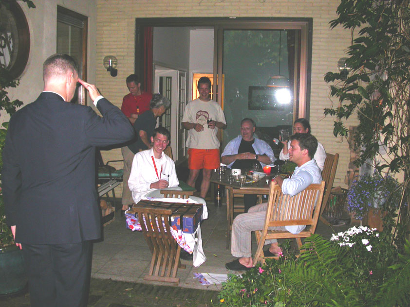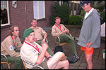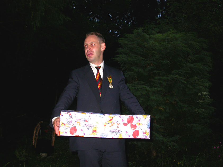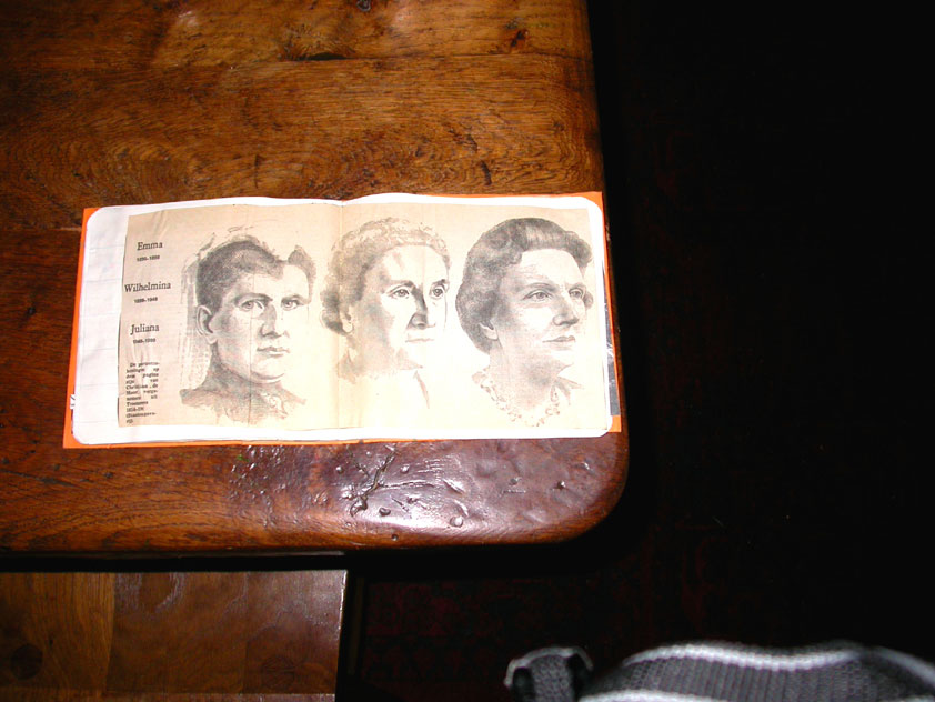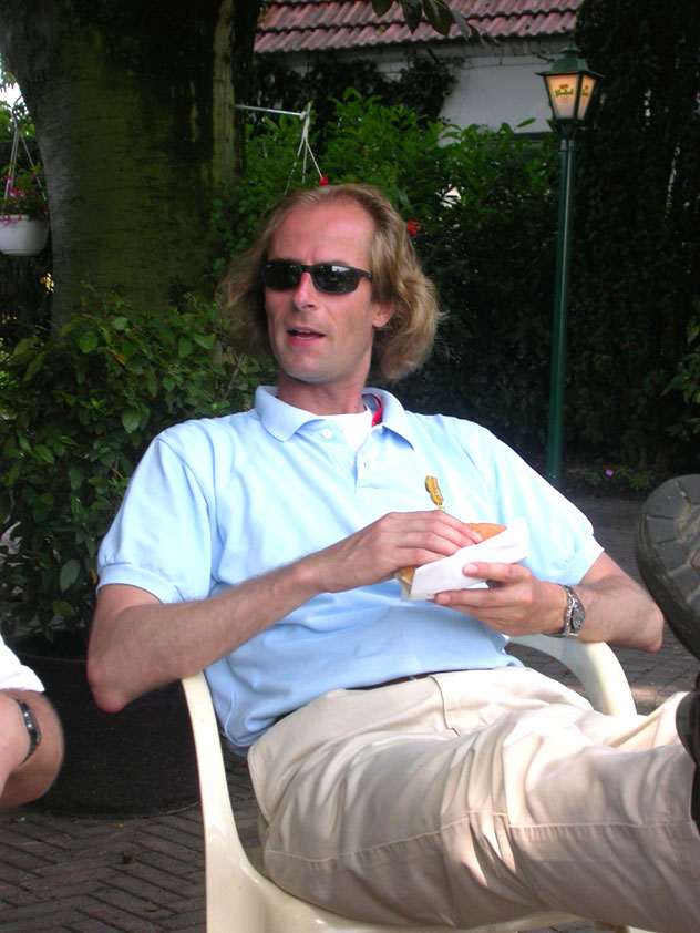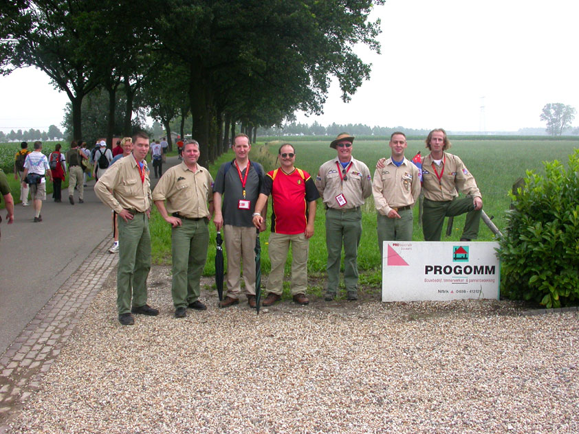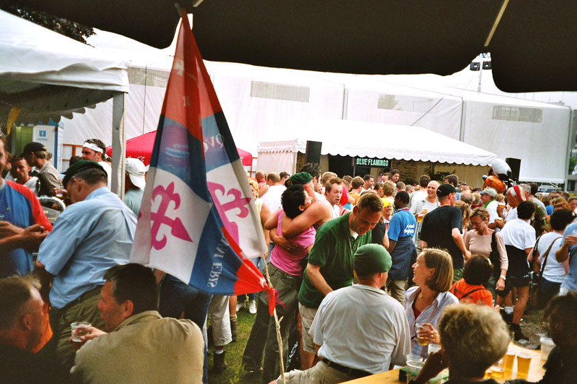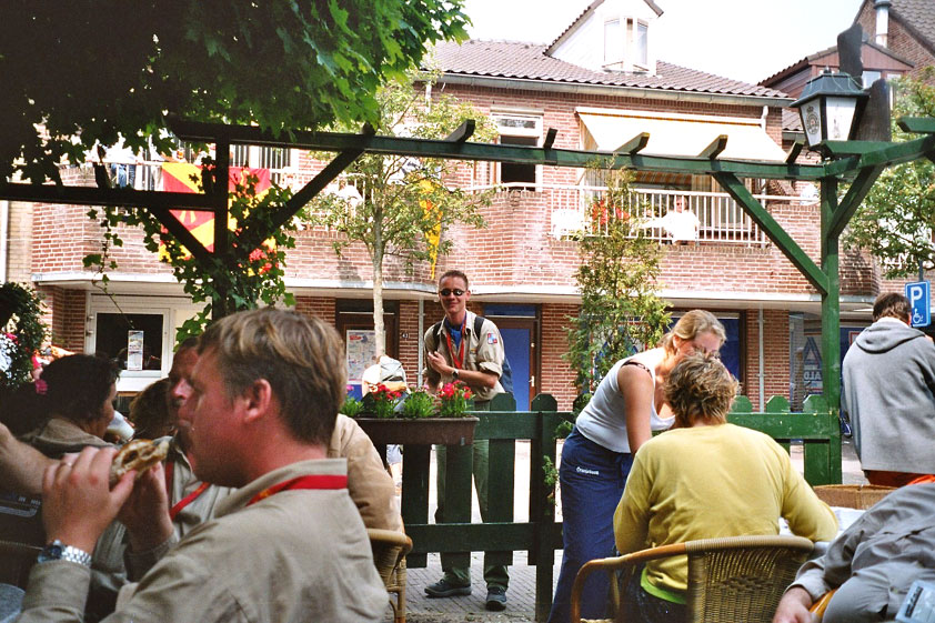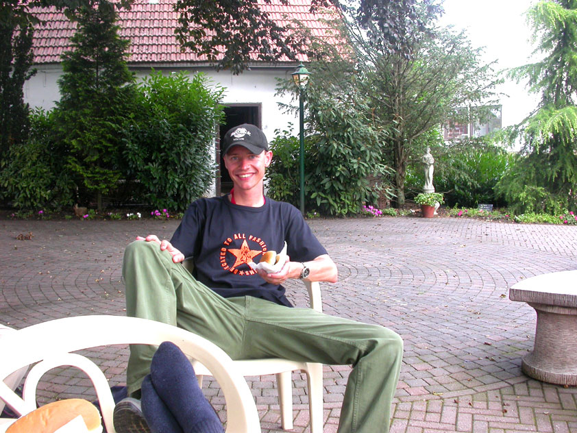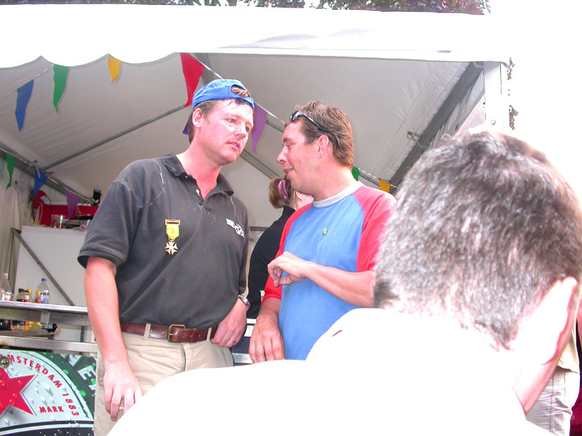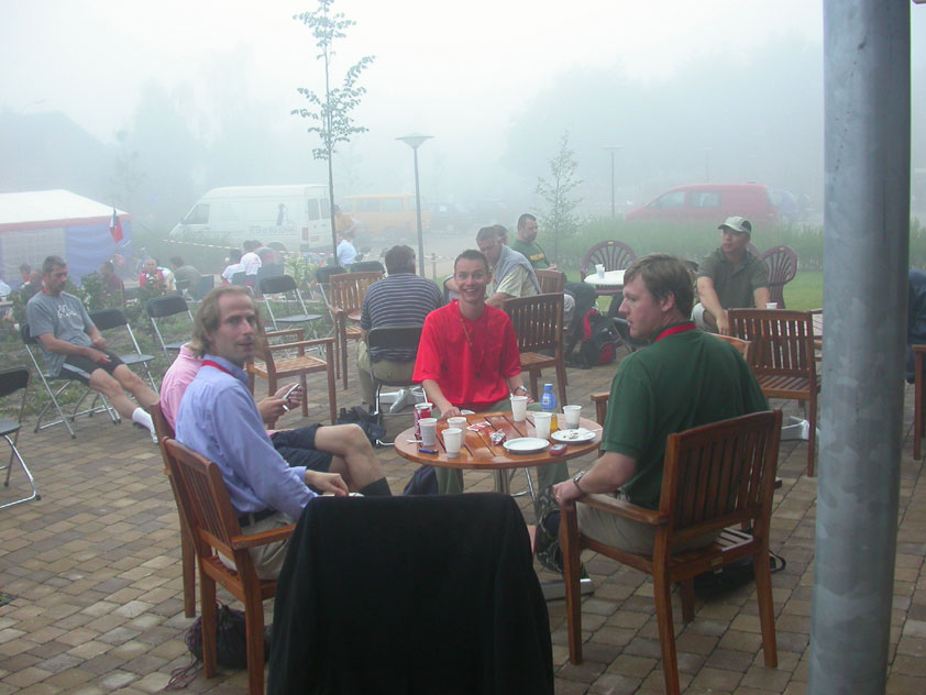 July 24th, 2004 88th Nijmegen Four Day March Nijmegen was a dramatic affair this year, even before we'd lifted a foot. This wasn't due to the Four Day Marches, but to the wedding of Rijkman & Derkman. Of, more precisely and better, to what followed it. The fights about it had not yet been resolved, namely. And I had, twice over, tried to convene the meeting, loudly demanded by some, but had to conclude, both times, that ultimately, there was not enough interest in it. So when that meeting didn't take place for the second time in a row, and I had, from that, concluded it would not take place at all, I decided that, because I had hitherto, being the chairman of the Wandelsoc., kept my personal opinion about the whole affair to myself (I was to organize that meeting after all, so I thought it wise to save my personal opinion for that meeting), now I could no longer do so at that meeting, I should give it now, and did so by way of an email, in which I not only called Ronald Fischer, but Henk van der Schelden, Peter Weij and Fred Regts too, everything under the sun. Day 0 This created a lot of bad blood on, particularly, the latter two's part. Not entirely unjustly so, I found after some contemplation, and so, as we met eachother at the Vereeniging on Monday afternoon, I offered them my apologies for calling them names in that mail, and for forgetting to stipulate that Fred was one of those who had been willing to have that meeting. Those apologies set the tone of that afternoon. Because as Theodoor Snodendroom and Bert van Prijzen, Second and First Friend of the Wandelsoc., looked at it all amused and approvingly, with Jasper Nales (who did not march along this year, because he was to late to enroll, but could not escape the Four Day Marches' Fever, and thus did come around to piss up at the Vereeniging, with Ralfie, who did march along), today became the Day of Atonement, and all infighting disappeared under the beered-out afternoon sun (not in the least because Ronald Fischer exerted himself in getting beer for everyone, and did not contradict Barend's remark that this was Fischer's way of apologizing). Apparently, the Four Day Marches, in all their horrific beauty, exact this respect for them: that all energy is needed for them, and there is therefore neither time, nor place for distracting argument. That won't be the case for long then, anymore. Since if it is up to people like Taeke van der Meer (Taeke is the unbelievable asshole who arranged that, come next year, men between 15 and 50 years of age no longer have to march 50 km for their cross, but only 40, and who dared to have the judge substantiate this with equality between men and women - and I am all for emancipation, but they should have made those women march the 50; enough of them do anyway, and toning down the distance for men devaluates the achievement of the brave who have, in decades past, proven to be better men than Taeke van der Meer, whom I find a shootable bastard, and with that I do NOT mean that I think he should be shot, because I OPPOSE violence, but that that 'shootable' is the sentiment that rushes through me when I hear his name because I am correspondingly angry, but nevertheless I am, in Holland, no longer allowed, since Fortuyn, to say that Taeke van der Meer, who is a shootable bastard, is a shootable bastard, one gets fired for this nowadays, in this blasted country that goes to the dogs thanks to the right-wing mob, is my personal opinion, but all that aside) the Four Day Marches will shortly be a festive parade for sissies. Good. Then at least we can turn our minds to more serious matters, like bashing eachother's heads in over a lack of beertent. Where was I? Oh yes, the Friday night. Utterly sociable, therefore. And not just at the Vereeniging. Because even at the Holy Mother Prakke's home, on the van Heemstralaan in Arnhem, where Jochem, Max, Henk, Raymond, Lourens and I stayed for the duration of the Four Day Marches, it was a pleasant and sociable reunion. To which splendour was added by a gift on behalf of us all, Jochem's brother Mark included, to Lous Prakke: a new cast-iron grid, for her fireplace. And then we had a great time, I myself partly because a booklet appeared on the table, about our Royal House, once glued together and written by Jochem - who definitely did not want its existence to be made public, whereupon I decided to photograph all its pages and put them on the Internet. It's cute, namely. Day 1 The next morning, very early on it, Lous treated us to eggs and bacon, in the kitchen. Won-der-ful. I was so taken aback by it, that I forgot to take my camera along. But this was a good thing, for it might otherwise not have survived. It was raining cats and dogs, namely, at the beginning of this Day Of Lent. There was therefore much complaining about this, nineteen to the dozen, by the legion-of-sissies, but I found it a pleasant vexation, that distracted me somewhat from what I knew was awaiting me: trouble, given my not fully healed blisters and skinscrapes.