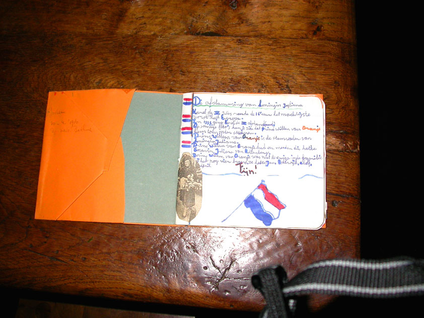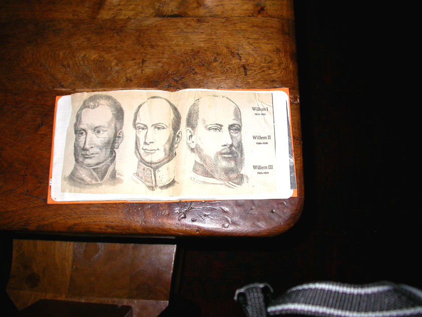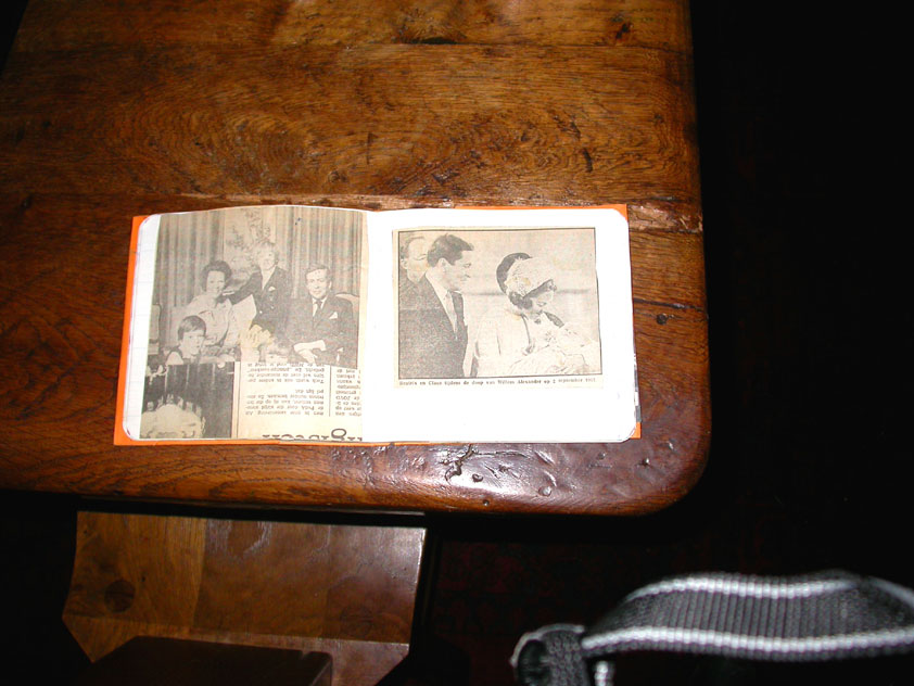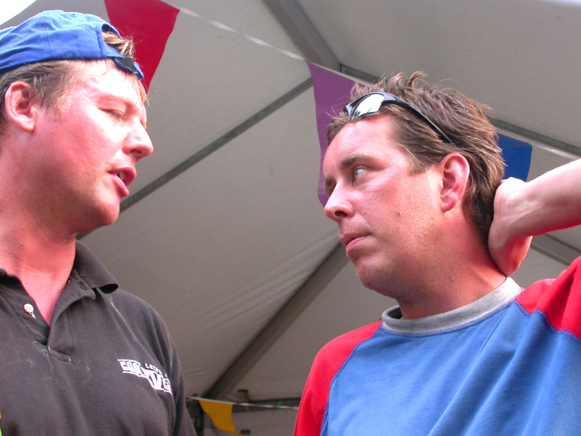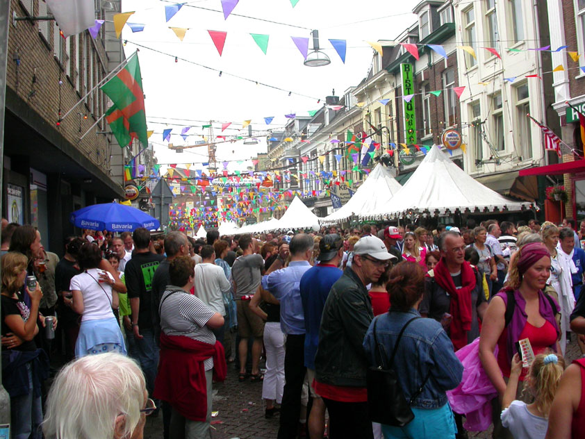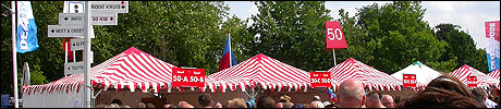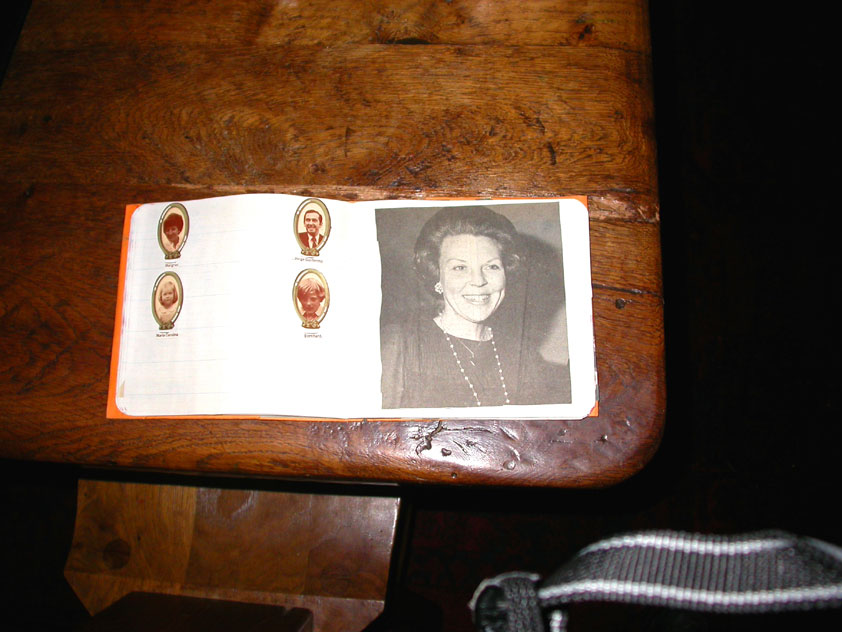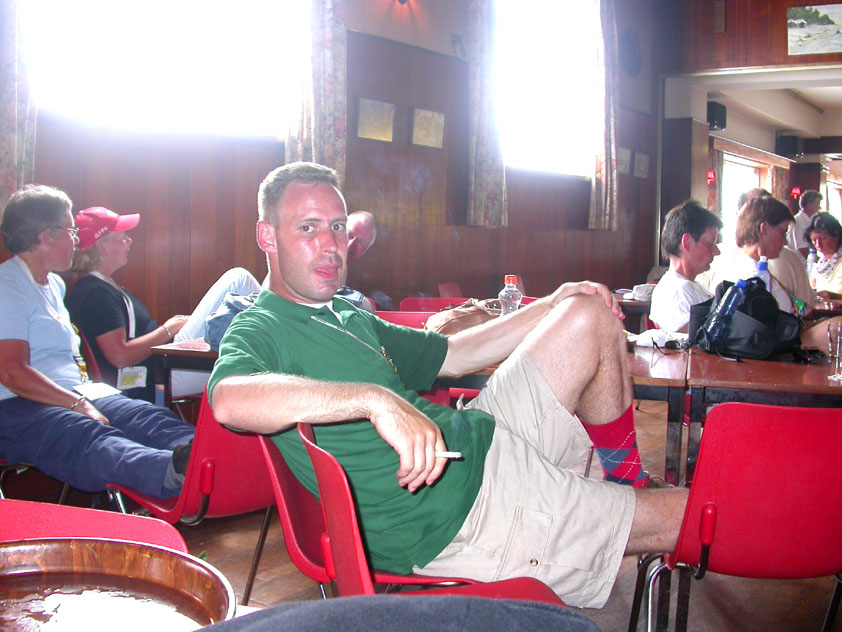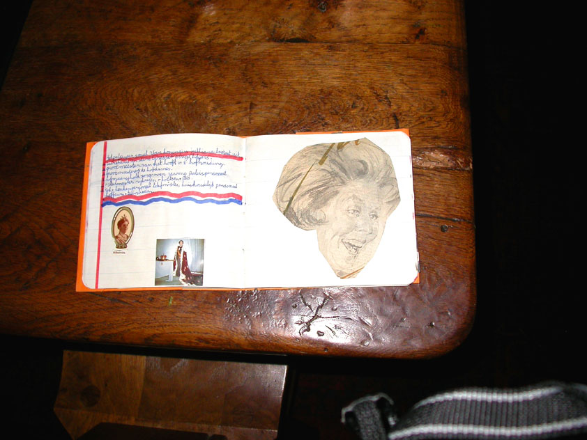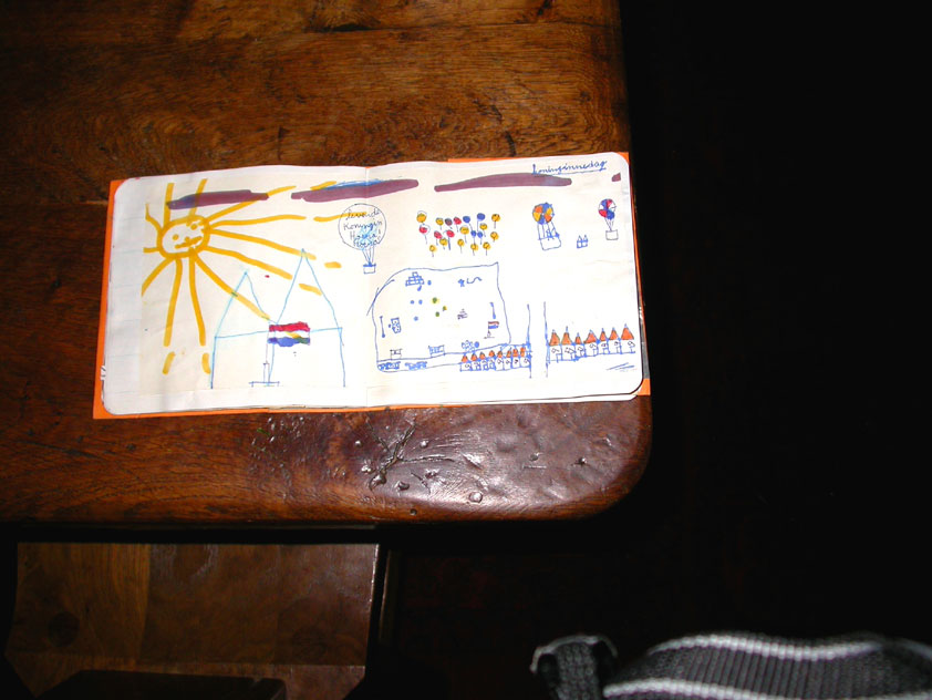 July 24th, 2004 88th Nijmegen Four Day March Nijmegen was a dramatic affair this year, even before we'd lifted a foot. This wasn't due to the Four Day Marches, but to the wedding of Rijkman & Derkman. Of, more precisely and better, to what followed it. The fights about it had not yet been resolved, namely. And I had, twice over, tried to convene the meeting, loudly demanded by some, but had to conclude, both times, that ultimately, there was not enough interest in it. So when that meeting didn't take place for the second time in a row, and I had, from that, concluded it would not take place at all, I decided that, because I had hitherto, being the chairman of the Wandelsoc., kept my personal opinion about the whole affair to myself (I was to organize that meeting after all, so I thought it wise to save my personal opinion for that meeting), now I could no longer do so at that meeting, I should give it now, and did so by way of an email, in which I not only called Ronald Fischer, but Henk van der Schelden, Peter Weij and Fred Regts too, everything under the sun. Day 0 This created a lot of bad blood on, particularly, the latter two's part. Not entirely unjustly so, I found after some contemplation, and so, as we met eachother at the Vereeniging on Monday afternoon, I offered them my apologies for calling them names in that mail, and for forgetting to stipulate that Fred was one of those who had been willing to have that meeting. Those apologies set the tone of that afternoon. Because as Theodoor Snodendroom and Bert van Prijzen, Second and First Friend of the Wandelsoc., looked at it all amused and approvingly, with Jasper Nales (who did not march along this year, because he was to late to enroll, but could not escape the Four Day Marches' Fever, and thus did come around to piss up at the Vereeniging, with Ralfie, who did march along), today became the Day of Atonement, and all infighting disappeared under the beered-out afternoon sun (not in the least because Ronald Fischer exerted himself in getting beer for everyone, and did not contradict Barend's remark that this was Fischer's way of apologizing). Apparently, the Four Day Marches, in all their horrific beauty, exact this respect for them: that all energy is needed for them, and there is therefore neither time, nor place for distracting argument. That won't be the case for long then, anymore. Since if it is up to people like Taeke van der Meer (Taeke is the unbelievable asshole who arranged that, come next year, men between 15 and 50 years of age no longer have to march 50 km for their cross, but only 40, and who dared to have the judge substantiate this with equality between men and women - and I am all for emancipation, but they should have made those women march the 50; enough of them do anyway, and toning down the distance for men devaluates the achievement of the brave who have, in decades past, proven to be better men than Taeke van der Meer, whom I find a shootable bastard, and with that I do NOT mean that I think he should be shot, because I OPPOSE violence, but that that 'shootable' is the sentiment that rushes through me when I hear his name because I am correspondingly angry, but nevertheless I am, in Holland, no longer allowed, since Fortuyn, to say that Taeke van der Meer, who is a shootable bastard, is a shootable bastard, one gets fired for this nowadays, in this blasted country that goes to the dogs thanks to the right-wing mob, is my personal opinion, but all that aside) the Four Day Marches will shortly be a festive parade for sissies. Good. Then at least we can turn our minds to more serious matters, like bashing eachother's heads in over a lack of beertent. Where was I? Oh yes, the Friday night. Utterly sociable, therefore. And not just at the Vereeniging. Because even at the Holy Mother Prakke's home, on the van Heemstralaan in Arnhem, where Jochem, Max, Henk, Raymond, Lourens and I stayed for the duration of the Four Day Marches, it was a pleasant and sociable reunion. To which splendour was added by a gift on behalf of us all, Jochem's brother Mark included, to Lous Prakke: a new cast-iron grid, for her fireplace. And then we had a great time, I myself partly because a booklet appeared on the table, about our Royal House, once glued together and written by Jochem - who definitely did not want its existence to be made public, whereupon I decided to photograph all its pages and put them on the Internet. It's cute, namely. Day 1 The next morning, very early on it, Lous treated us to eggs and bacon, in the kitchen. Won-der-ful. I was so taken aback by it, that I forgot to take my camera along. But this was a good thing, for it might otherwise not have survived. It was raining cats and dogs, namely, at the beginning of this Day Of Lent. There was therefore much complaining about this, nineteen to the dozen, by the legion-of-sissies, but I found it a pleasant vexation, that distracted me somewhat from what I knew was awaiting me: trouble, given my not fully healed blisters and skinscrapes.