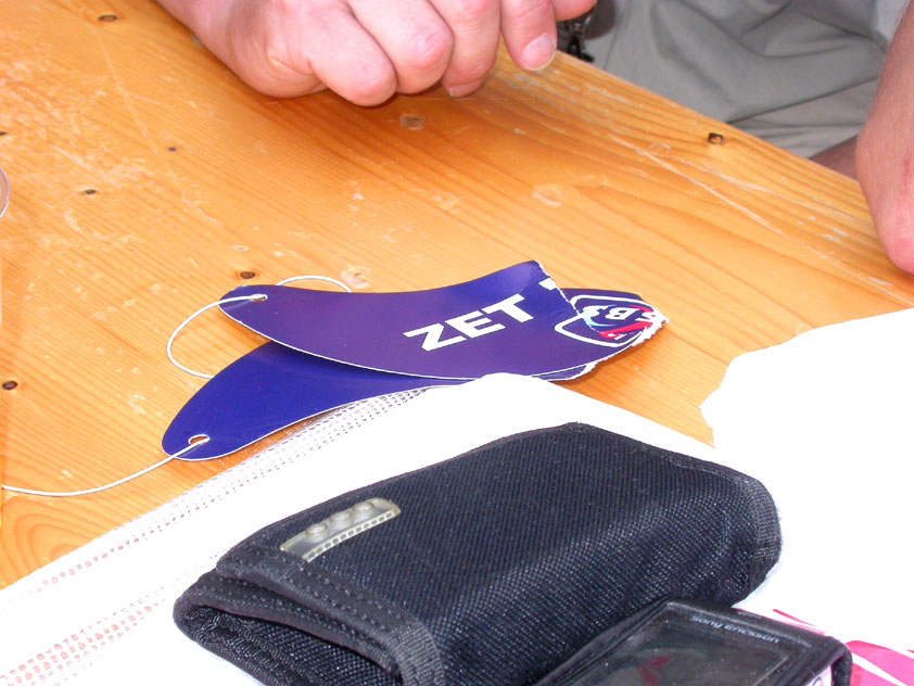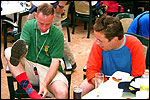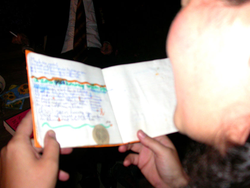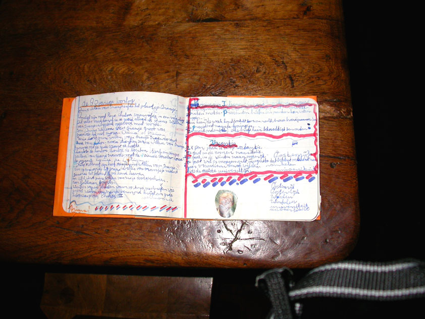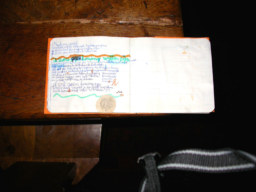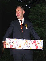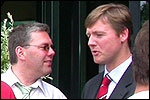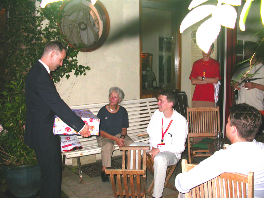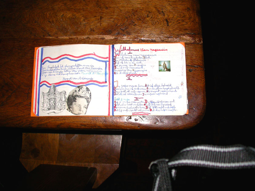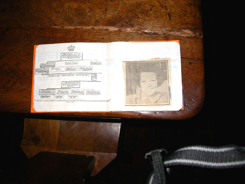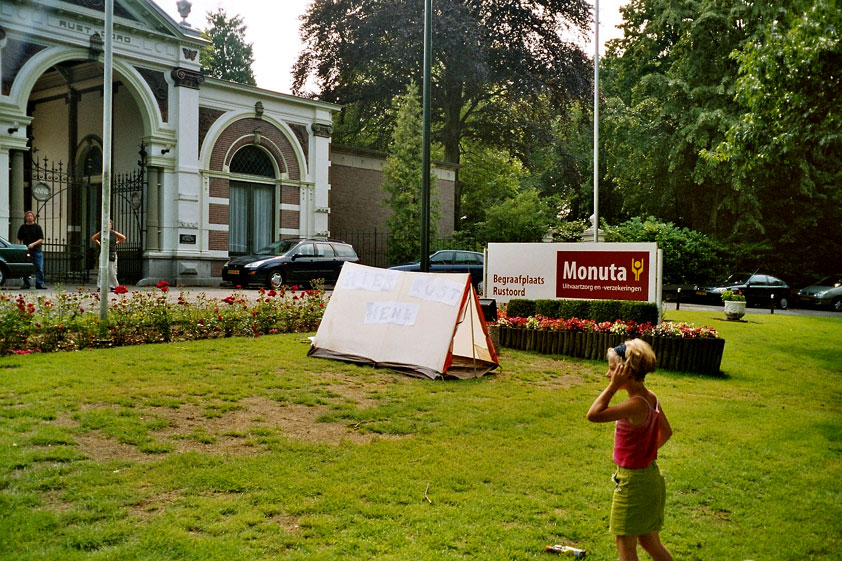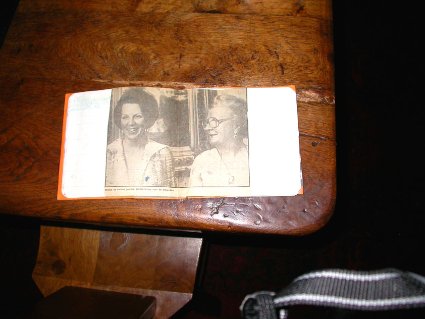 July 24th, 2004 88th Nijmegen Four Day March Nijmegen was a dramatic affair this year, even before we'd lifted a foot. This wasn't due to the Four Day Marches, but to the wedding of Rijkman & Derkman. Of, more precisely and better, to what followed it. The fights about it had not yet been resolved, namely. And I had, twice over, tried to convene the meeting, loudly demanded by some, but had to conclude, both times, that ultimately, there was not enough interest in it. So when that meeting didn't take place for the second time in a row, and I had, from that, concluded it would not take place at all, I decided that, because I had hitherto, being the chairman of the Wandelsoc., kept my personal opinion about the whole affair to myself (I was to organize that meeting after all, so I thought it wise to save my personal opinion for that meeting), now I could no longer do so at that meeting, I should give it now, and did so by way of an email, in which I not only called Ronald Fischer, but Henk van der Schelden, Peter Weij and Fred Regts too, everything under the sun. Day 0 This created a lot of bad blood on, particularly, the latter two's part. Not entirely unjustly so, I found after some contemplation, and so, as we met eachother at the Vereeniging on Monday afternoon, I offered them my apologies for calling them names in that mail, and for forgetting to stipulate that Fred was one of those who had been willing to have that meeting. Those apologies set the tone of that afternoon. Because as Theodoor Snodendroom and Bert van Prijzen, Second and First Friend of the Wandelsoc., looked at it all amused and approvingly, with Jasper Nales (who did not march along this year, because he was to late to enroll, but could not escape the Four Day Marches' Fever, and thus did come around to piss up at the Vereeniging, with Ralfie, who did march along), today became the Day of Atonement, and all infighting disappeared under the beered-out afternoon sun (not in the least because Ronald Fischer exerted himself in getting beer for everyone, and did not contradict Barend's remark that this was Fischer's way of apologizing). Apparently, the Four Day Marches, in all their horrific beauty, exact this respect for them: that all energy is needed for them, and there is therefore neither time, nor place for distracting argument. That won't be the case for long then, anymore. Since if it is up to people like Taeke van der Meer (Taeke is the unbelievable asshole who arranged that, come next year, men between 15 and 50 years of age no longer have to march 50 km for their cross, but only 40, and who dared to have the judge substantiate this with equality between men and women - and I am all for emancipation, but they should have made those women march the 50; enough of them do anyway, and toning down the distance for men devaluates the achievement of the brave who have, in decades past, proven to be better men than Taeke van der Meer, whom I find a shootable bastard, and with that I do NOT mean that I think he should be shot, because I OPPOSE violence, but that that 'shootable' is the sentiment that rushes through me when I hear his name because I am correspondingly angry, but nevertheless I am, in Holland, no longer allowed, since Fortuyn, to say that Taeke van der Meer, who is a shootable bastard, is a shootable bastard, one gets fired for this nowadays, in this blasted country that goes to the dogs thanks to the right-wing mob, is my personal opinion, but all that aside) the Four Day Marches will shortly be a festive parade for sissies. Good. Then at least we can turn our minds to more serious matters, like bashing eachother's heads in over a lack of beertent. Where was I? Oh yes, the Friday night. Utterly sociable, therefore. And not just at the Vereeniging. Because even at the Holy Mother Prakke's home, on the van Heemstralaan in Arnhem, where Jochem, Max, Henk, Raymond, Lourens and I stayed for the duration of the Four Day Marches, it was a pleasant and sociable reunion. To which splendour was added by a gift on behalf of us all, Jochem's brother Mark included, to Lous Prakke: a new cast-iron grid, for her fireplace. And then we had a great time, I myself partly because a booklet appeared on the table, about our Royal House, once glued together and written by Jochem - who definitely did not want its existence to be made public, whereupon I decided to photograph all its pages and put them on the Internet. It's cute, namely. Day 1 The next morning, very early on it, Lous treated us to eggs and bacon, in the kitchen. Won-der-ful. I was so taken aback by it, that I forgot to take my camera along. But this was a good thing, for it might otherwise not have survived. It was raining cats and dogs, namely, at the beginning of this Day Of Lent. There was therefore much complaining about this, nineteen to the dozen, by the legion-of-sissies, but I found it a pleasant vexation, that distracted me somewhat from what I knew was awaiting me: trouble, given my not fully healed blisters and skinscrapes.