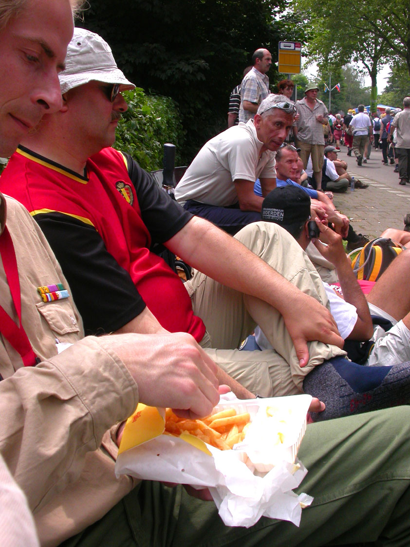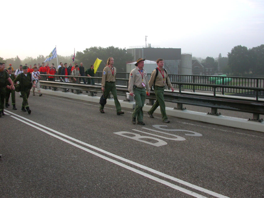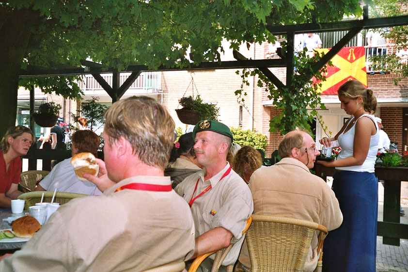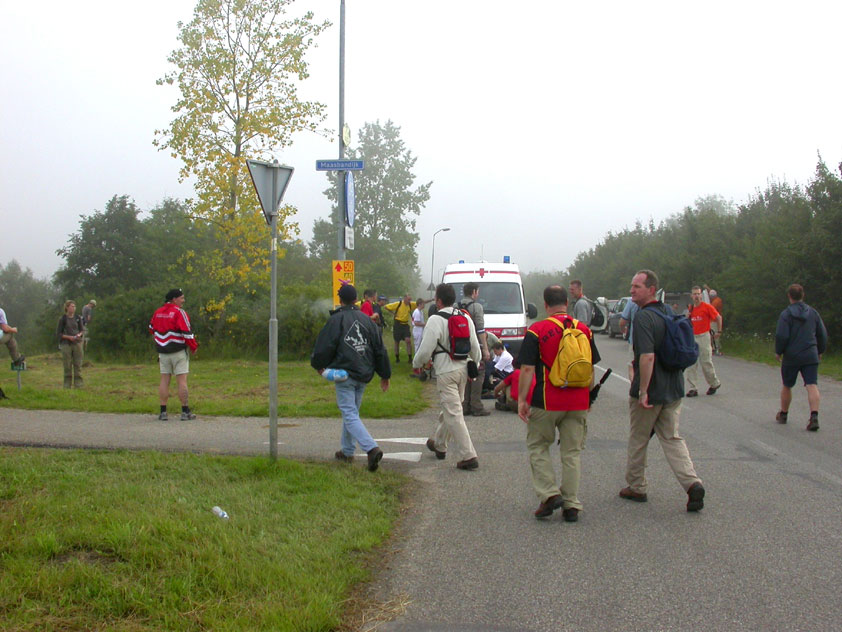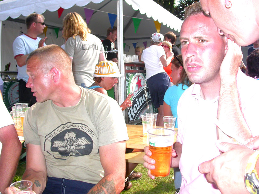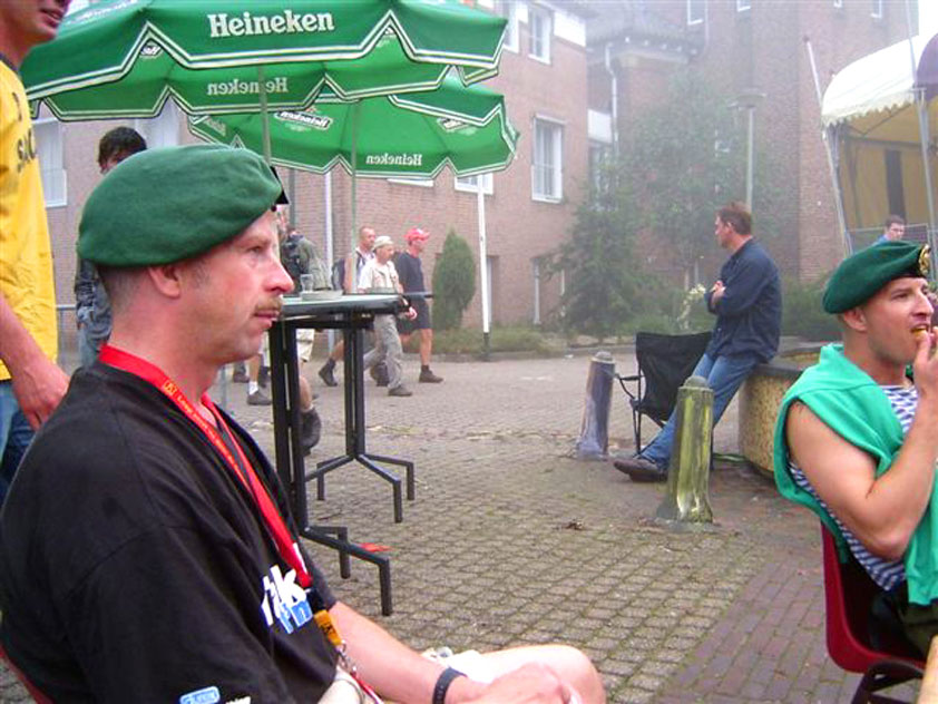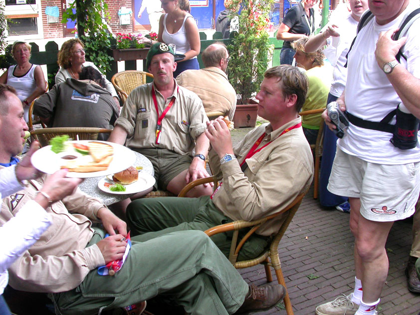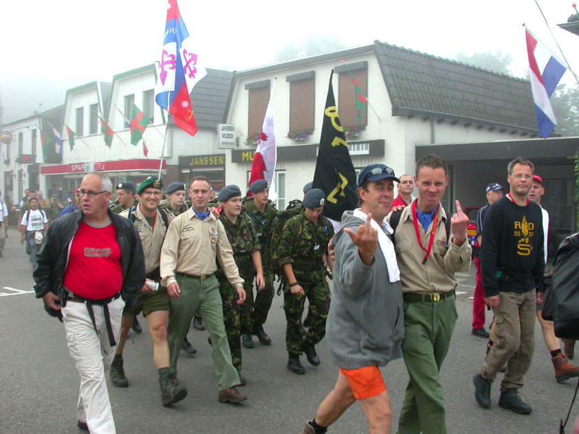 I believe everyone behind him warned him to take it easier, that day - but Lourens knew better, and finished a long way before the combined Four Day Marches' experience of Albert van Geyningen (22x), Ted Snodendroom (15x), Bert van Prijzen (13x), Henk van der Schelden (12x), Marco van Zijntergen (3x), Jochem Prakke (2x), Raymond de Gisser (1x), and myself (3x). An impressive feat, I cannot put it any other way. Day 2 The next day (following another eggs-and-bacon breakfast in Arnhem, but this time I didn't forget my camera) I rode to the start with Max again. He'd set himself the goal of completing two days of 40 km, and was therefore nicely on the way to achieving that target. Myself, I hoped, of course, that he'd turn out to be able to do more, and would manage to pin his first Four Day Marches' cross on by the end of this week, but most of all, I was glad he was there at all anyway. The day of Wijchen began better than the previous one, because it largely remained dry (it was raining profusely before we left Arnhem, but of that, only a diminishing drop remained by the time we were in Nijmegen). But that was about all, where 'good' was concerned. Because shortly after the start, The Tent, Where People Work (for years, there was a sign in it reading 'For lack of personnel, people work here') was missing, this year. And so we were forced to, for coffee, soup and rolls, divert, for the first time in our Four Day Marches' history, to Cafe-Restaurant ''t Mirakel' (which, by the way, did a fine job, as a Quality Rest, since it also offered an inside, with spacious and clean sanitary facilities). Once we'd gotten over the astonishment caused by this discourteous disappearance, we rounded the field by 'Hart van Hatert', which, during a recent practice march, we had so wickedly crossed, and made our way to the overpass across the A73. We remembered Ome Jan, evilly leaded for his wasteworthy coffee, who no longer offered rest here, and stamped on to the RET-rest before Alverna. Completely lost in thought, I unfortunately missed it, so I had to make do with a low garden wall in Alverna (where I was accosted, by the by, in an extremely friendly way, by the garden owner, who supplied me with cushions and liquorice) upon which I then waited for the rest. This was pleasant, because it enabled me to greet a lot of acquaintances. Liz Marquart-Scholtz, for instance, passed here (my kind of luck), I saw Pieter Spaan and Henk Bakx striding by, and (shortly after I'd let Peter, Henk, Jochem, Raymond, Fred, Toon, Albert and Marco walk on, so I could wait for Ted and Bert for a moment) my gaze fell upon Henk Warring, whom I hadn't seen since Viborg last year (and that was just before his posting to Al-Muthanna in Iraq)! Joyful reunion, albeit short. He was doing well, although he was still busy processing his experiences in Iraq. "It was a good mission, but much went wrong", was his befittingly guarded observation. As I waited for Ted and Bert, I then had a great time, on the one hand because of the rivalry between a group of homosexuals marching along (who were resting behind me) and passing military ("Bunch of fags!" "Heeeyyy, helloooooowww, shall I give you a good fuck up the ass, darling boy?" - quickly disappearing soldiers, you can imagine), and on the other hand because of the misplaced respect a Wandelsoc.-uniform full of ribbons produces. Chest forward, chin up, and every passing detachment thinks, in reaction to your nod, to be facing a high-ranking soldier, and so straightens into parade pace, head proudly turned right. Not always hilarious, for gripping at times, as in the case of, for instance, the so much maligned Americans, marching along here nonetheless. Great value, for your "Good morning America". That I waited for Ted and Bert, had a real reason too, by the way. For me, it was important to join them for the bit of course that was to come now, and that we had had to wait for for two years: the Maasbandijk, from Balgoij to Niftrik, namely. Cursed stretch along which, in 2002, I almost fainted, and would therefore have wanted to have my revanche in 2003, when it was removed from the course by the March Leadership on account of the heat, bunch of sis-sies, sis-sies, sis-sies! This time, there was none of that: I got my dyke, to our threefold pleasure. And not only to ours. For at Hotel Restaurant Hoogeerd, the place that in 2003, despite the March Management, had not had to forego its yearly earnings (as owner Jo Lepoutre explained to us recently) we not only found Raymond, Barend, Ronald, Albert, Jochem, Henk and Marco, but also German reservist Marc Poelen, with whom I had done the Castlebar two weeks before, and owner Jo Lepoutre, who stated he found it an honour to be able to greet us once more. Entirely likewise, good Sir, entirely likewise. His personnel, too, remembered us joyfully, so it was a pleasant ado, there behind the tomato soup. Moreover, the First Aiders at Hotel Restaurant Hoogeerd this year had had some serious work: they had namely just looked at Lourens E. Dinger ankle, who proceeded to inform me by telephone, that he was in Niftrik by now, but would drop out on account of tendon troubles, today. Well. Nothing wrong, eh? By the time that, in Niftrik, we did indeed run into him, he still denied having walked too fast on the first day. Sure, kiddo. 71 Years of Four Day Marches' experience carefully takes things slower than you do, but you don't walk too fast. No, kiddo. As Chairman of the Wandelsoc., I then say this: we, as a Society, guarantee a Four Day Marches' cross, provided we are listened to, and our WHOLE curriculum is completed. Lourens E. Dinger did neither. Lourens E. Dinger concludes his first Four Day March, the 2004 one, without a Four Day Marches' cross. I. Rest. My. Fucking. Case. Having therefore given him a hiding ("You're a disgrace to our Society!", because this kind of running is exactly that, to my opinion, just as bad as the 'walking alternate speeds'