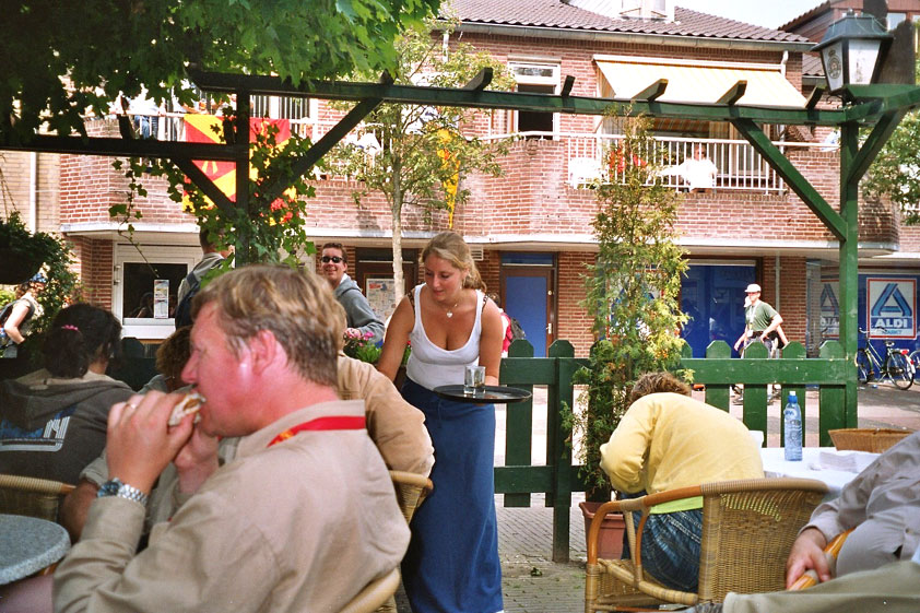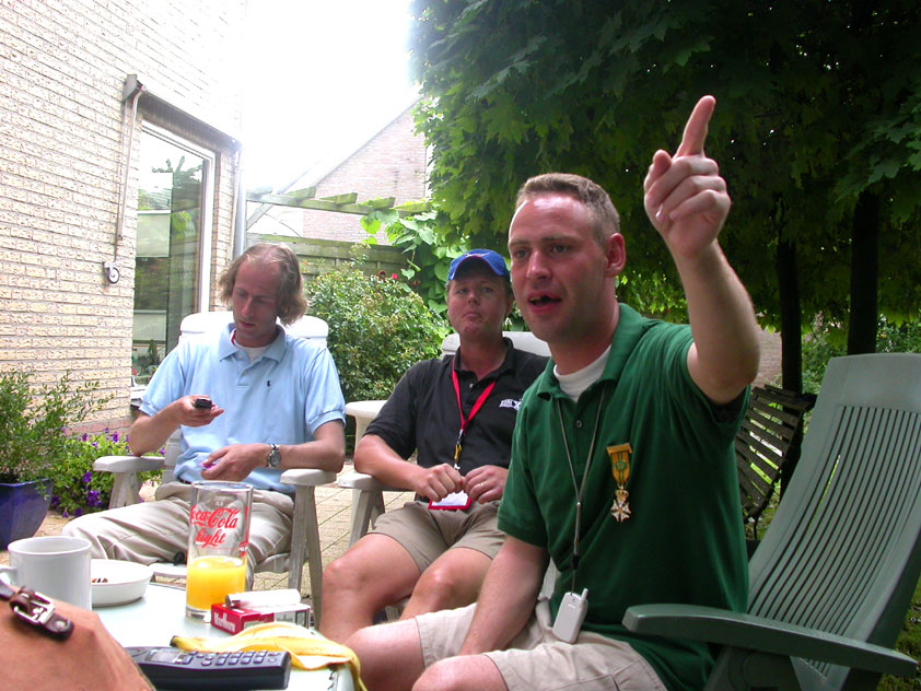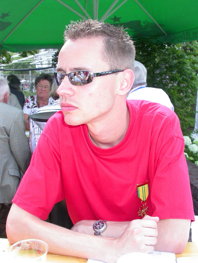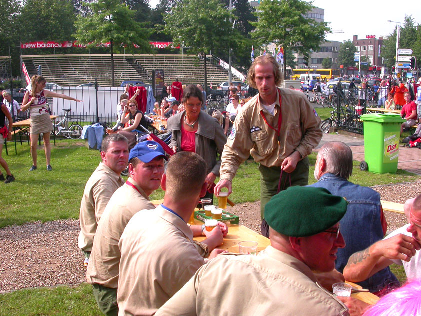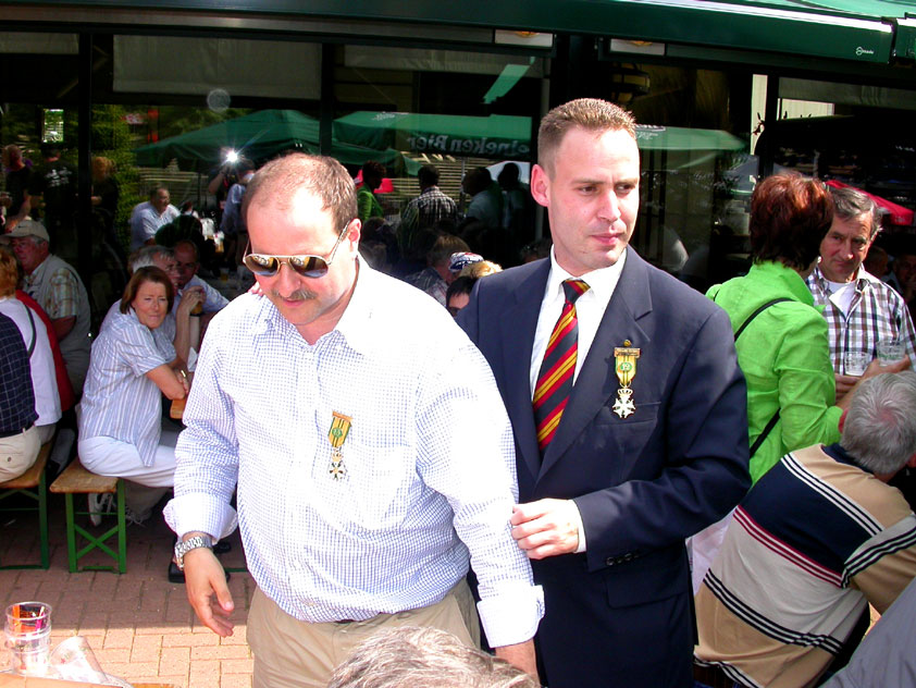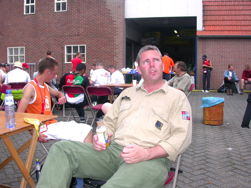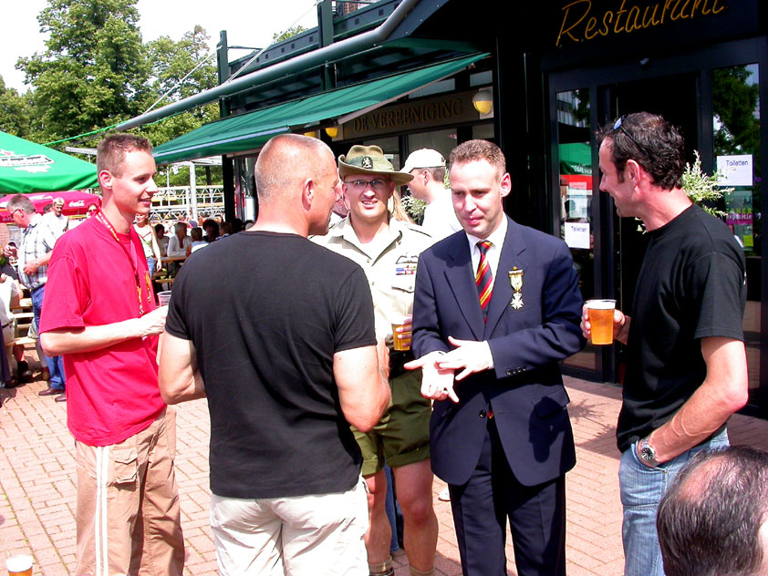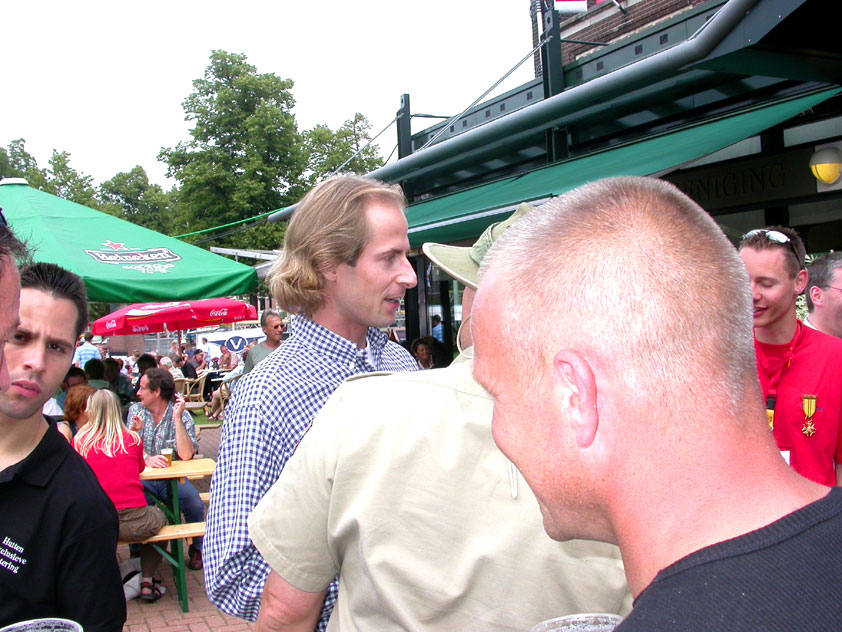 I believe everyone behind him warned him to take it easier, that day - but Lourens knew better, and finished a long way before the combined Four Day Marches' experience of Albert van Geyningen (22x), Ted Snodendroom (15x), Bert van Prijzen (13x), Henk van der Schelden (12x), Marco van Zijntergen (3x), Jochem Prakke (2x), Raymond de Gisser (1x), and myself (3x). An impressive feat, I cannot put it any other way. Day 2 The next day (following another eggs-and-bacon breakfast in Arnhem, but this time I didn't forget my camera) I rode to the start with Max again. He'd set himself the goal of completing two days of 40 km, and was therefore nicely on the way to achieving that target. Myself, I hoped, of course, that he'd turn out to be able to do more, and would manage to pin his first Four Day Marches' cross on by the end of this week, but most of all, I was glad he was there at all anyway. The day of Wijchen began better than the previous one, because it largely remained dry (it was raining profusely before we left Arnhem, but of that, only a diminishing drop remained by the time we were in Nijmegen). But that was about all, where 'good' was concerned. Because shortly after the start, The Tent, Where People Work (for years, there was a sign in it reading 'For lack of personnel, people work here') was missing, this year. And so we were forced to, for coffee, soup and rolls, divert, for the first time in our Four Day Marches' history, to Cafe-Restaurant ''t Mirakel' (which, by the way, did a fine job, as a Quality Rest, since it also offered an inside, with spacious and clean sanitary facilities). Once we'd gotten over the astonishment caused by this discourteous disappearance, we rounded the field by 'Hart van Hatert', which, during a recent practice march, we had so wickedly crossed, and made our way to the overpass across the A73. We remembered Ome Jan, evilly leaded for his wasteworthy coffee, who no longer offered rest here, and stamped on to the RET-rest before Alverna. Completely lost in thought, I unfortunately missed it, so I had to make do with a low garden wall in Alverna (where I was accosted, by the by, in an extremely friendly way, by the garden owner, who supplied me with cushions and liquorice) upon which I then waited for the rest. This was pleasant, because it enabled me to greet a lot of acquaintances. Liz Marquart-Scholtz, for instance, passed here (my kind of luck), I saw Pieter Spaan and Henk Bakx striding by, and (shortly after I'd let Peter, Henk, Jochem, Raymond, Fred, Toon, Albert and Marco walk on, so I could wait for Ted and Bert for a moment) my gaze fell upon Henk Warring, whom I hadn't seen since Viborg last year (and that was just before his posting to Al-Muthanna in Iraq)! Joyful reunion, albeit short. He was doing well, although he was still busy processing his experiences in Iraq. "It was a good mission, but much went wrong", was his befittingly guarded observation. As I waited for Ted and Bert, I then had a great time, on the one hand because of the rivalry between a group of homosexuals marching along (who were resting behind me) and passing military ("Bunch of fags!" "Heeeyyy, helloooooowww, shall I give you a good fuck up the ass, darling boy?" - quickly disappearing soldiers, you can imagine), and on the other hand because of the misplaced respect a Wandelsoc.-uniform full of ribbons produces. Chest forward, chin up, and every passing detachment thinks, in reaction to your nod, to be facing a high-ranking soldier, and so straightens into parade pace, head proudly turned right. Not always hilarious, for gripping at times, as in the case of, for instance, the so much maligned Americans, marching along here nonetheless. Great value, for your "Good morning America". That I waited for Ted and Bert, had a real reason too, by the way. For me, it was important to join them for the bit of course that was to come now, and that we had had to wait for for two years: the Maasbandijk, from Balgoij to Niftrik, namely. Cursed stretch along which, in 2002, I almost fainted, and would therefore have wanted to have my revanche in 2003, when it was removed from the course by the March Leadership on account of the heat, bunch of sis-sies, sis-sies, sis-sies! This time, there was none of that: I got my dyke, to our threefold pleasure. And not only to ours. For at Hotel Restaurant Hoogeerd, the place that in 2003, despite the March Management, had not had to forego its yearly earnings (as owner Jo Lepoutre explained to us recently) we not only found Raymond, Barend, Ronald, Albert, Jochem, Henk and Marco, but also German reservist Marc Poelen, with whom I had done the Castlebar two weeks before, and owner Jo Lepoutre, who stated he found it an honour to be able to greet us once more. Entirely likewise, good Sir, entirely likewise. His personnel, too, remembered us joyfully, so it was a pleasant ado, there behind the tomato soup. Moreover, the First Aiders at Hotel Restaurant Hoogeerd this year had had some serious work: they had namely just looked at Lourens E. Dinger ankle, who proceeded to inform me by telephone, that he was in Niftrik by now, but would drop out on account of tendon troubles, today. Well. Nothing wrong, eh? By the time that, in Niftrik, we did indeed run into him, he still denied having walked too fast on the first day. Sure, kiddo. 71 Years of Four Day Marches' experience carefully takes things slower than you do, but you don't walk too fast. No, kiddo. As Chairman of the Wandelsoc., I then say this: we, as a Society, guarantee a Four Day Marches' cross, provided we are listened to, and our WHOLE curriculum is completed. Lourens E. Dinger did neither. Lourens E. Dinger concludes his first Four Day March, the 2004 one, without a Four Day Marches' cross. I. Rest. My. Fucking. Case. Having therefore given him a hiding ("You're a disgrace to our Society!", because this kind of running is exactly that, to my opinion, just as bad as the 'walking alternate speeds'