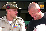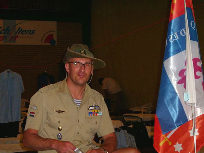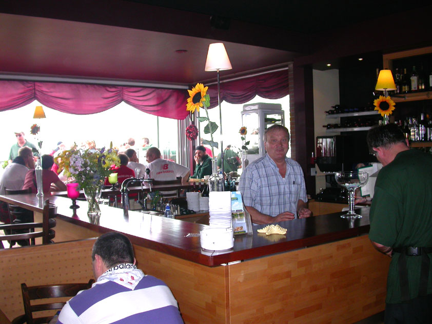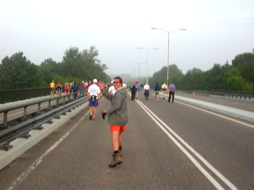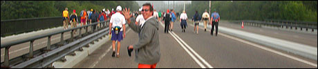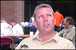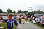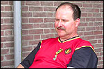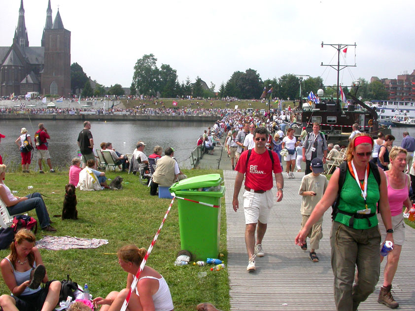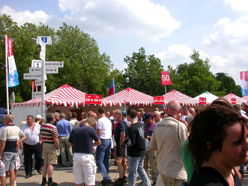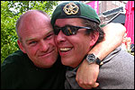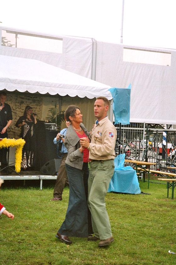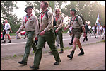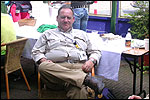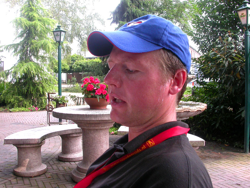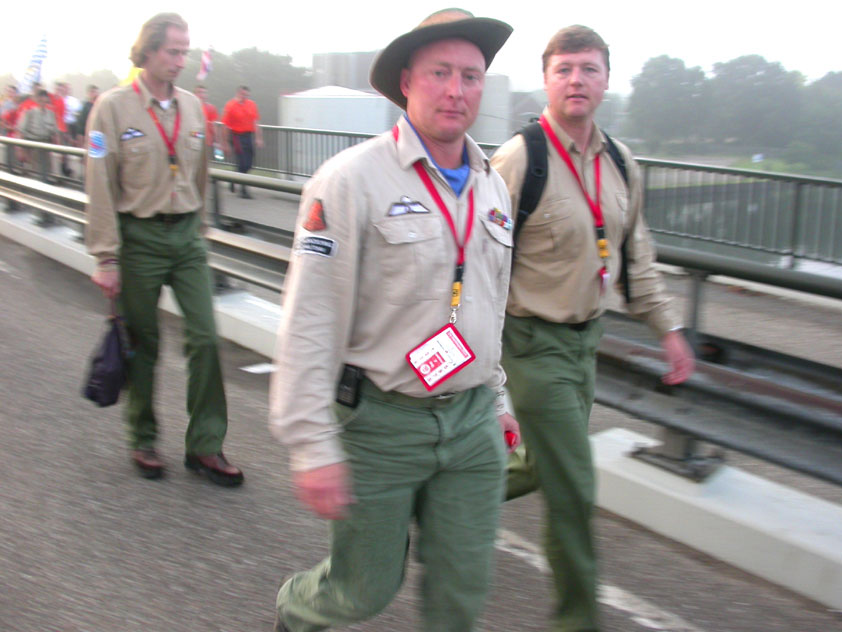 I believe everyone behind him warned him to take it easier, that day - but Lourens knew better, and finished a long way before the combined Four Day Marches' experience of Albert van Geyningen (22x), Ted Snodendroom (15x), Bert van Prijzen (13x), Henk van der Schelden (12x), Marco van Zijntergen (3x), Jochem Prakke (2x), Raymond de Gisser (1x), and myself (3x). An impressive feat, I cannot put it any other way. Day 2 The next day (following another eggs-and-bacon breakfast in Arnhem, but this time I didn't forget my camera) I rode to the start with Max again. He'd set himself the goal of completing two days of 40 km, and was therefore nicely on the way to achieving that target. Myself, I hoped, of course, that he'd turn out to be able to do more, and would manage to pin his first Four Day Marches' cross on by the end of this week, but most of all, I was glad he was there at all anyway. The day of Wijchen began better than the previous one, because it largely remained dry (it was raining profusely before we left Arnhem, but of that, only a diminishing drop remained by the time we were in Nijmegen). But that was about all, where 'good' was concerned. Because shortly after the start, The Tent, Where People Work (for years, there was a sign in it reading 'For lack of personnel, people work here') was missing, this year. And so we were forced to, for coffee, soup and rolls, divert, for the first time in our Four Day Marches' history, to Cafe-Restaurant ''t Mirakel' (which, by the way, did a fine job, as a Quality Rest, since it also offered an inside, with spacious and clean sanitary facilities). Once we'd gotten over the astonishment caused by this discourteous disappearance, we rounded the field by 'Hart van Hatert', which, during a recent practice march, we had so wickedly crossed, and made our way to the overpass across the A73. We remembered Ome Jan, evilly leaded for his wasteworthy coffee, who no longer offered rest here, and stamped on to the RET-rest before Alverna. Completely lost in thought, I unfortunately missed it, so I had to make do with a low garden wall in Alverna (where I was accosted, by the by, in an extremely friendly way, by the garden owner, who supplied me with cushions and liquorice) upon which I then waited for the rest. This was pleasant, because it enabled me to greet a lot of acquaintances. Liz Marquart-Scholtz, for instance, passed here (my kind of luck), I saw Pieter Spaan and Henk Bakx striding by, and (shortly after I'd let Peter, Henk, Jochem, Raymond, Fred, Toon, Albert and Marco walk on, so I could wait for Ted and Bert for a moment) my gaze fell upon Henk Warring, whom I hadn't seen since Viborg last year (and that was just before his posting to Al-Muthanna in Iraq)! Joyful reunion, albeit short. He was doing well, although he was still busy processing his experiences in Iraq. "It was a good mission, but much went wrong", was his befittingly guarded observation. As I waited for Ted and Bert, I then had a great time, on the one hand because of the rivalry between a group of homosexuals marching along (who were resting behind me) and passing military ("Bunch of fags!" "Heeeyyy, helloooooowww, shall I give you a good fuck up the ass, darling boy?" - quickly disappearing soldiers, you can imagine), and on the other hand because of the misplaced respect a Wandelsoc.-uniform full of ribbons produces. Chest forward, chin up, and every passing detachment thinks, in reaction to your nod, to be facing a high-ranking soldier, and so straightens into parade pace, head proudly turned right. Not always hilarious, for gripping at times, as in the case of, for instance, the so much maligned Americans, marching along here nonetheless. Great value, for your "Good morning America". That I waited for Ted and Bert, had a real reason too, by the way. For me, it was important to join them for the bit of course that was to come now, and that we had had to wait for for two years: the Maasbandijk, from Balgoij to Niftrik, namely. Cursed stretch along which, in 2002, I almost fainted, and would therefore have wanted to have my revanche in 2003, when it was removed from the course by the March Leadership on account of the heat, bunch of sis-sies, sis-sies, sis-sies! This time, there was none of that: I got my dyke, to our threefold pleasure. And not only to ours. For at Hotel Restaurant Hoogeerd, the place that in 2003, despite the March Management, had not had to forego its yearly earnings (as owner Jo Lepoutre explained to us recently) we not only found Raymond, Barend, Ronald, Albert, Jochem, Henk and Marco, but also German reservist Marc Poelen, with whom I had done the Castlebar two weeks before, and owner Jo Lepoutre, who stated he found it an honour to be able to greet us once more. Entirely likewise, good Sir, entirely likewise. His personnel, too, remembered us joyfully, so it was a pleasant ado, there behind the tomato soup. Moreover, the First Aiders at Hotel Restaurant Hoogeerd this year had had some serious work: they had namely just looked at Lourens E. Dinger ankle, who proceeded to inform me by telephone, that he was in Niftrik by now, but would drop out on account of tendon troubles, today. Well. Nothing wrong, eh? By the time that, in Niftrik, we did indeed run into him, he still denied having walked too fast on the first day. Sure, kiddo. 71 Years of Four Day Marches' experience carefully takes things slower than you do, but you don't walk too fast. No, kiddo. As Chairman of the Wandelsoc., I then say this: we, as a Society, guarantee a Four Day Marches' cross, provided we are listened to, and our WHOLE curriculum is completed. Lourens E. Dinger did neither. Lourens E. Dinger concludes his first Four Day March, the 2004 one, without a Four Day Marches' cross. I. Rest. My. Fucking. Case. Having therefore given him a hiding ("You're a disgrace to our Society!", because this kind of running is exactly that, to my opinion, just as bad as the 'walking alternate speeds'