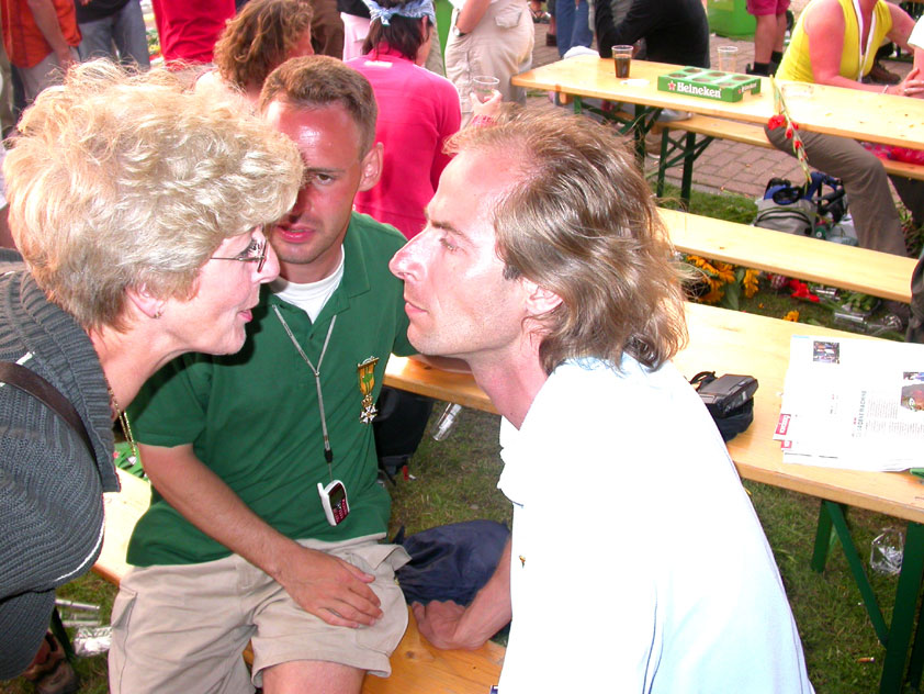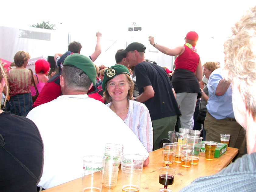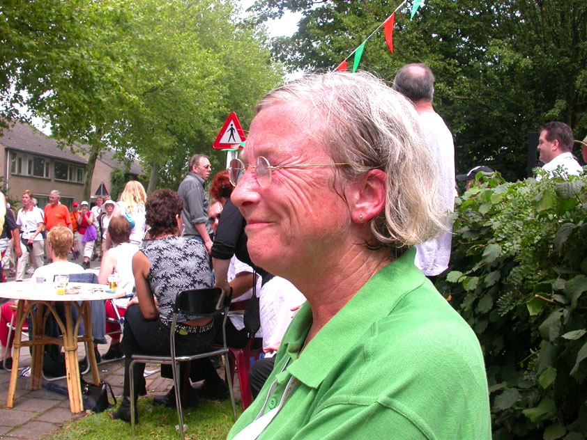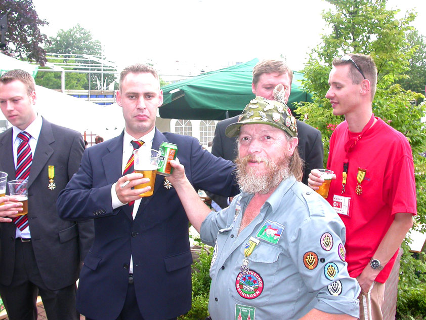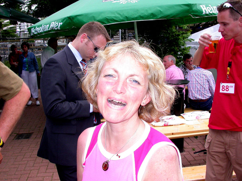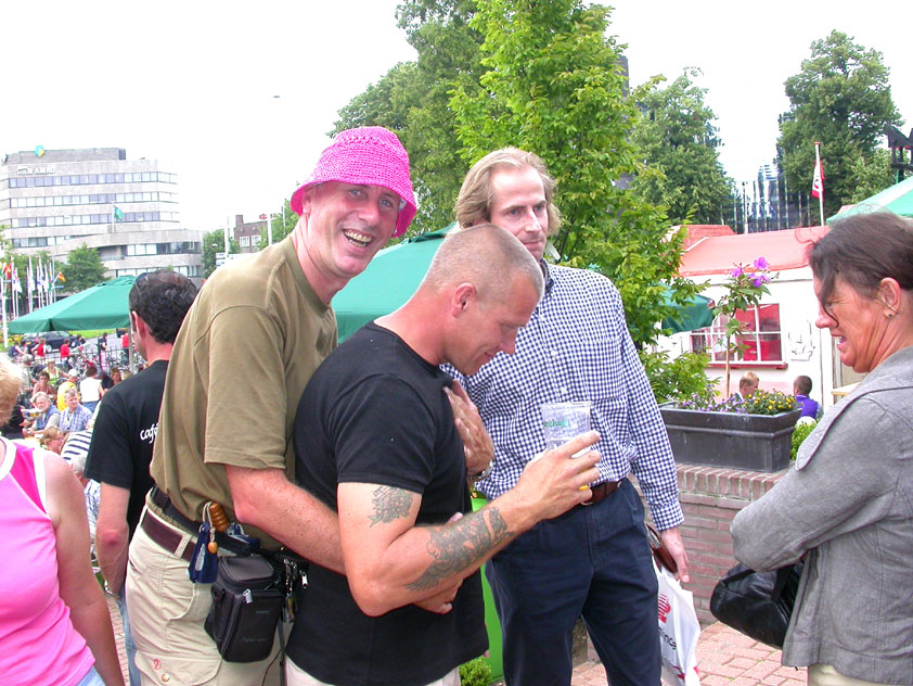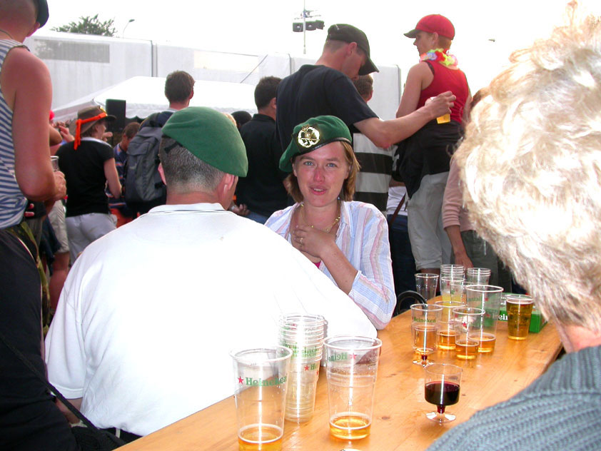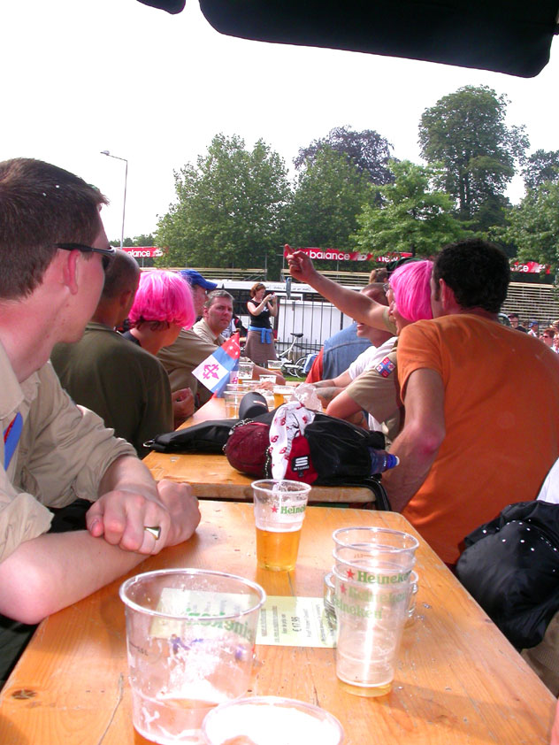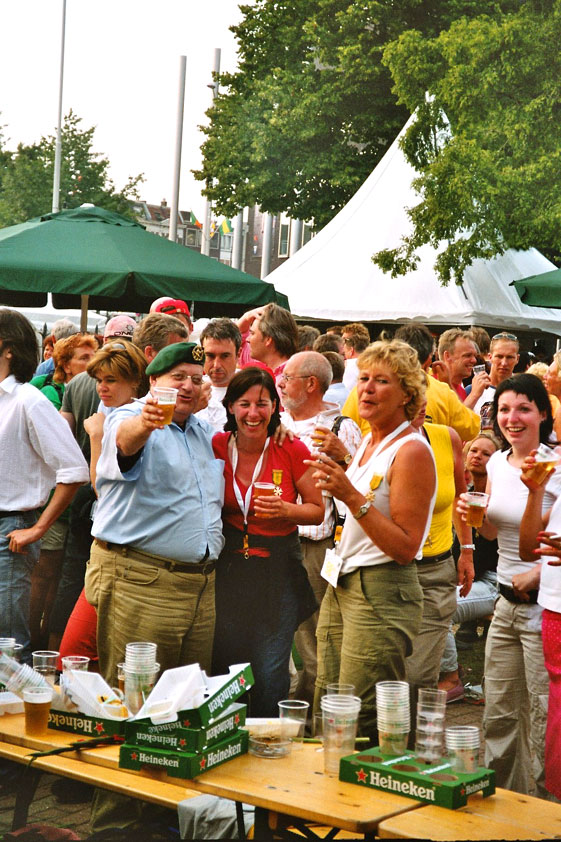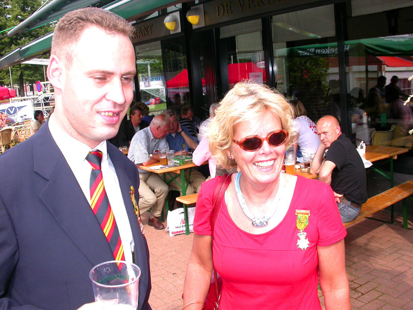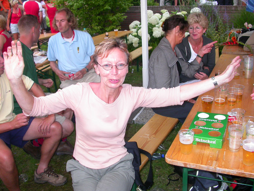 And especially not if that burgomaster is Guusje ter Horst. That, namely, is the most important handsake of the marching annum, because it means your Four Day March is complete. And so it was now, but more so: for those words, "Thank you, Guusje", the most beautiful ones of my walking season, were hard-won this year. I kissed her hand crying. That hand, by the way, the March Management did not get from me, this time over, because they hadn't earned it. Disgusting bunch of mismanagers. Immediately afterwards, I was accosted from the right by what turned out to be Fischer. Bravo! He'd stepped on very calmly, had taken shorter rests than we had, and finished here, in a way that would have become Lourens Dinger. And boy, were we exhausted, the both of us. It was a fucking awful Four Day March, this year. And the hardest I've walked so far (not strange, when you realize that this one was dubbed the hardest since 1927 - but can someone explain to me why, if this Four Day March was the hardest since 1927, they deducted 10 k from it last year?). With bleeding feet, but one pathetic thumbtack with a '4' on it the richer, I therefore fell into Bert's arms crying, at the Vereeniging. This to the astonishment of Marjon (the darling got me my first half litre of beer, I shall never be able to repay her), who as a native to Nijmegen had after all never been so close to a group of Four Day Marchers. And so Bert explained it to her: "He only does that when he's happy, you know". And that, by itself, was true too. Because as we congratulated eachother on the victory gained, and the debeering commenced in the front garden of the Vereeniging, we had to conclude that, although this was a hard and nasty Four Day March, walkingwise, we could, other than that, as Society and Friends Of, look back at a very successful week. This was certainly true for Ronald Fischer, who with his gaining of the Four Day Marches' cross rehabilitated himself in the eyes of many, with respect to his misconduct, whether alleged or not, and for Barend Rijkman, who was wasted, but happy. That his freshly wed wife Annelies appeared here will certainly have contributed to that (and I thought it was a class act of hers).