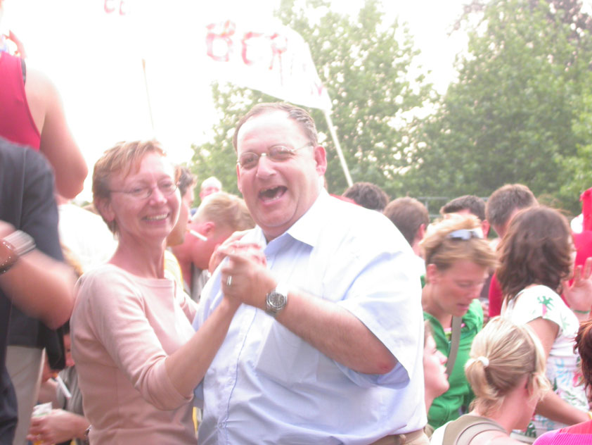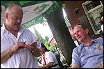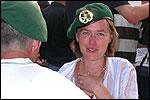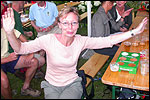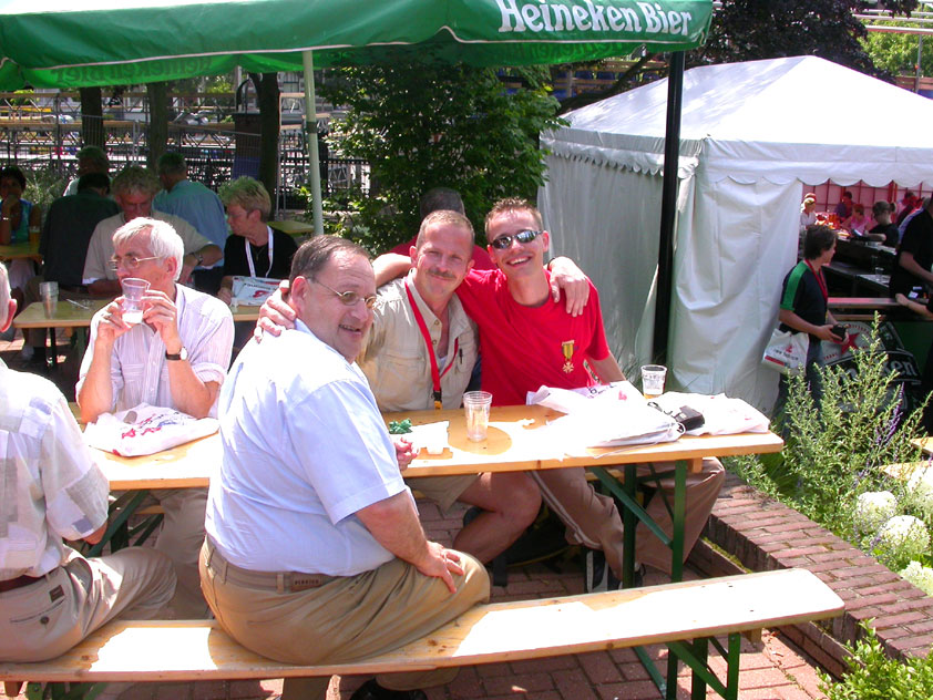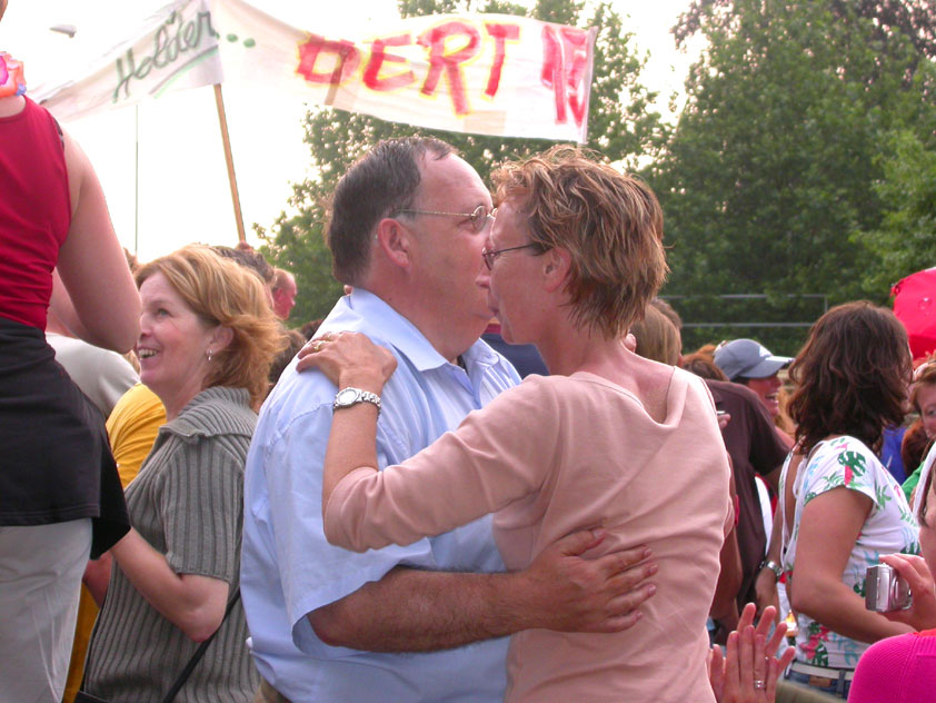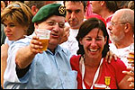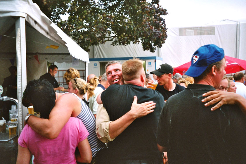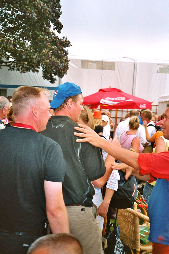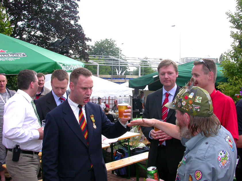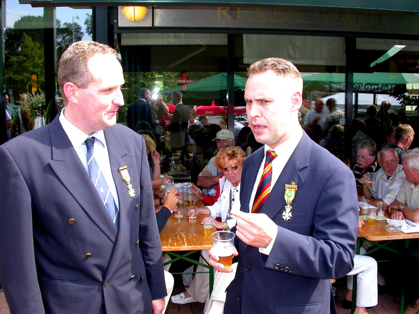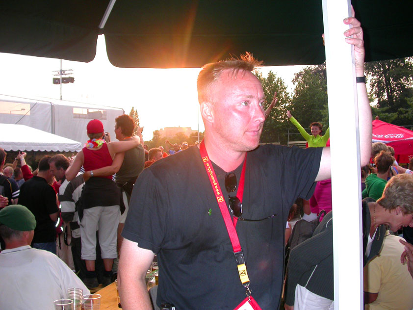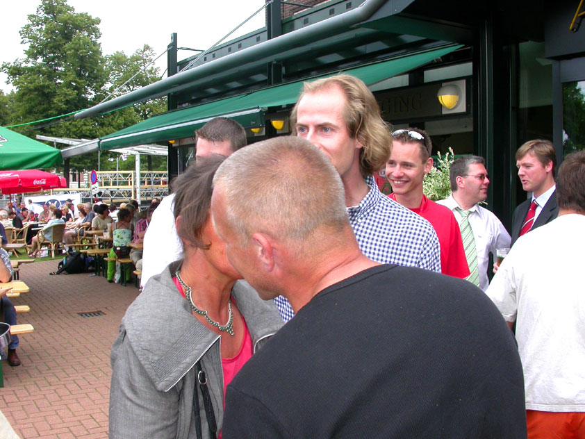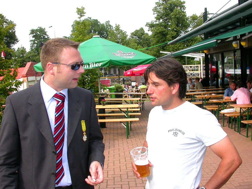 And especially not if that burgomaster is Guusje ter Horst. That, namely, is the most important handsake of the marching annum, because it means your Four Day March is complete. And so it was now, but more so: for those words, "Thank you, Guusje", the most beautiful ones of my walking season, were hard-won this year. I kissed her hand crying. That hand, by the way, the March Management did not get from me, this time over, because they hadn't earned it. Disgusting bunch of mismanagers. Immediately afterwards, I was accosted from the right by what turned out to be Fischer. Bravo! He'd stepped on very calmly, had taken shorter rests than we had, and finished here, in a way that would have become Lourens Dinger. And boy, were we exhausted, the both of us. It was a fucking awful Four Day March, this year. And the hardest I've walked so far (not strange, when you realize that this one was dubbed the hardest since 1927 - but can someone explain to me why, if this Four Day March was the hardest since 1927, they deducted 10 k from it last year?). With bleeding feet, but one pathetic thumbtack with a '4' on it the richer, I therefore fell into Bert's arms crying, at the Vereeniging. This to the astonishment of Marjon (the darling got me my first half litre of beer, I shall never be able to repay her), who as a native to Nijmegen had after all never been so close to a group of Four Day Marchers. And so Bert explained it to her: "He only does that when he's happy, you know". And that, by itself, was true too. Because as we congratulated eachother on the victory gained, and the debeering commenced in the front garden of the Vereeniging, we had to conclude that, although this was a hard and nasty Four Day March, walkingwise, we could, other than that, as Society and Friends Of, look back at a very successful week. This was certainly true for Ronald Fischer, who with his gaining of the Four Day Marches' cross rehabilitated himself in the eyes of many, with respect to his misconduct, whether alleged or not, and for Barend Rijkman, who was wasted, but happy. That his freshly wed wife Annelies appeared here will certainly have contributed to that (and I thought it was a class act of hers).