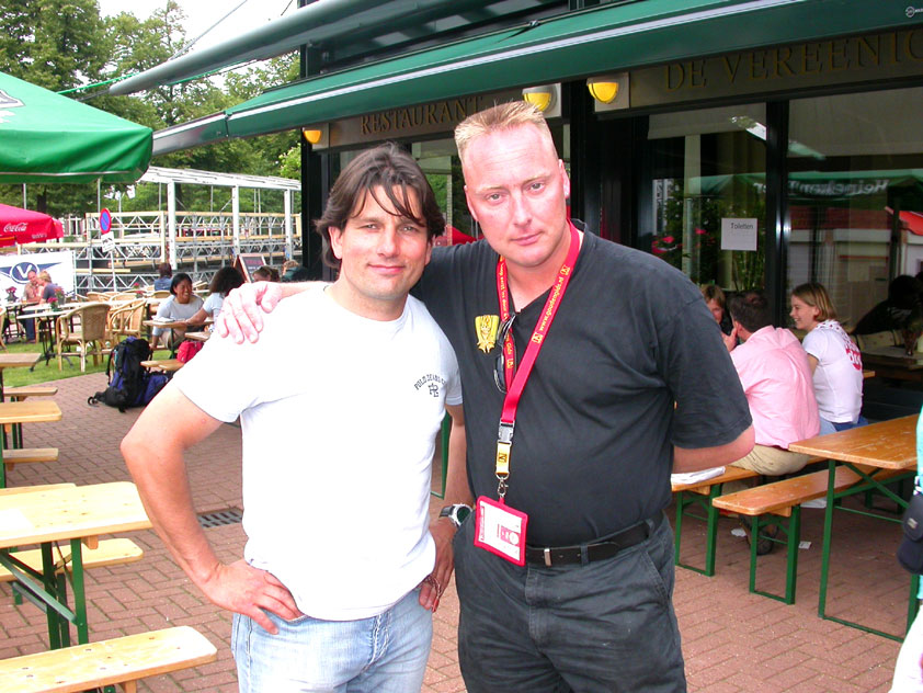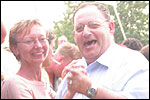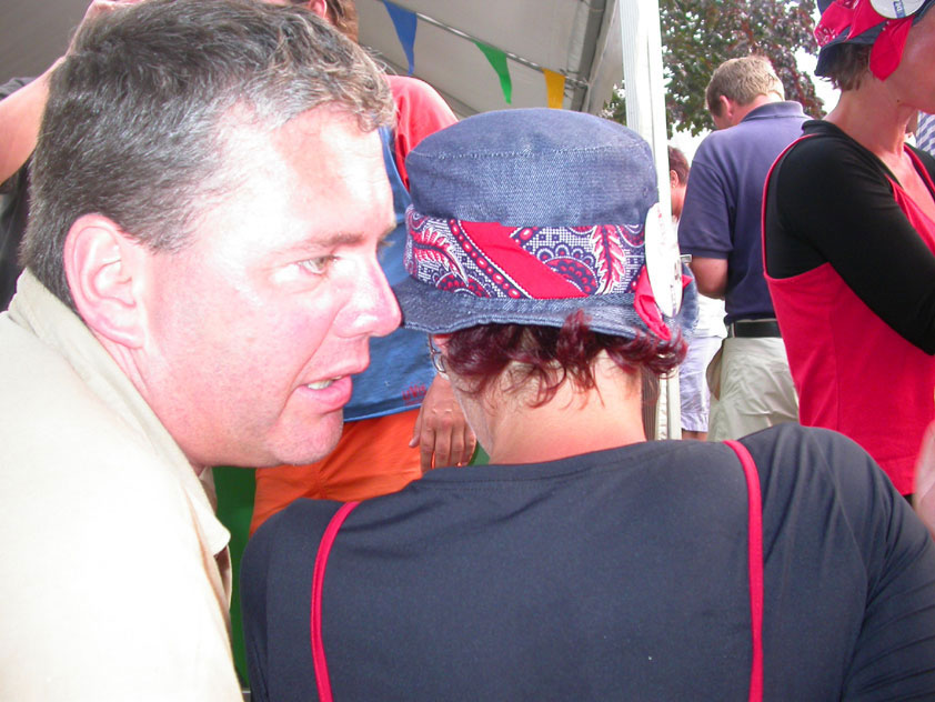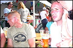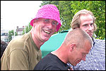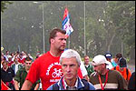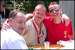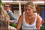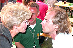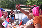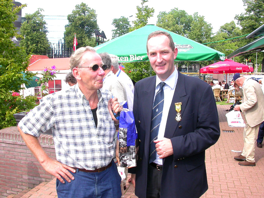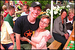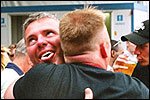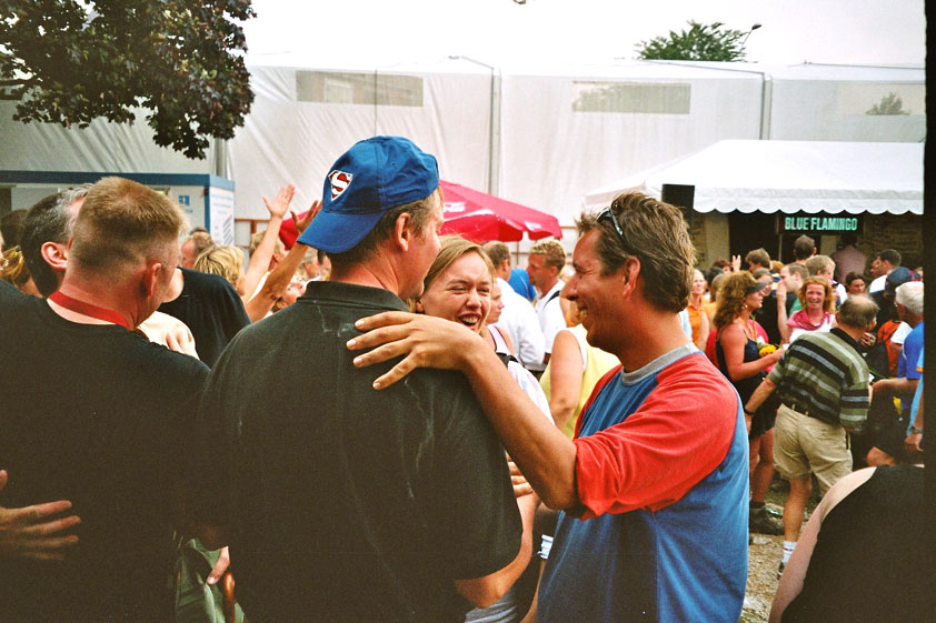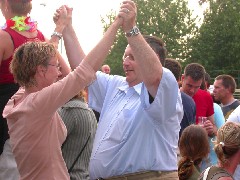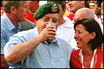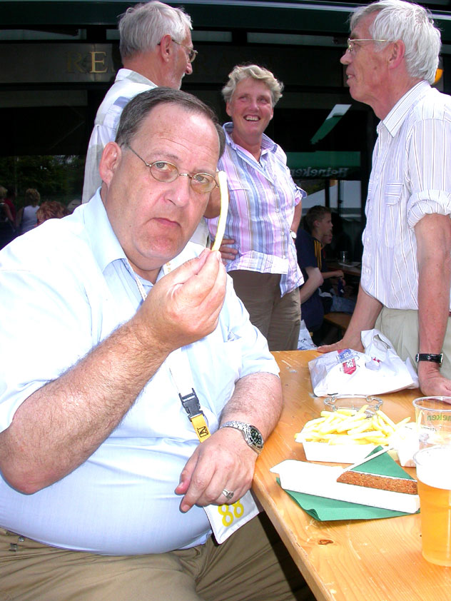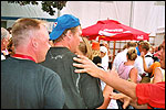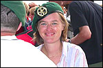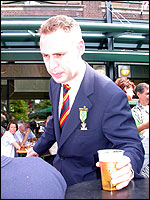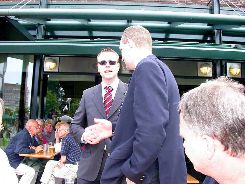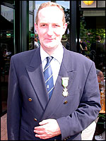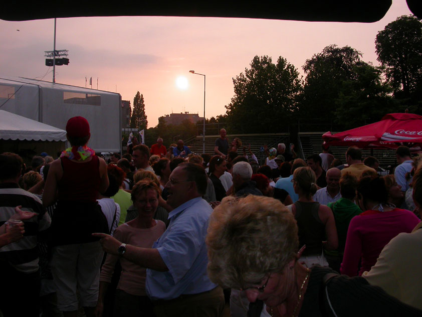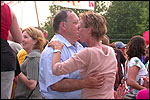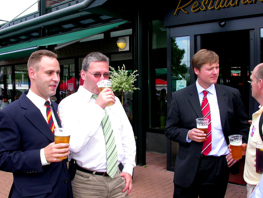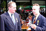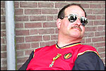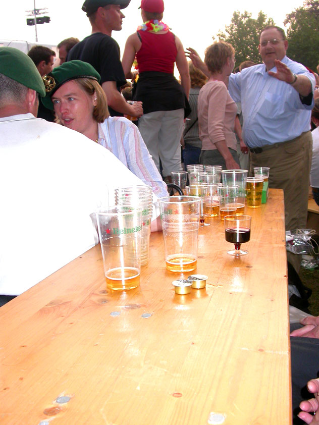 And especially not if that burgomaster is Guusje ter Horst. That, namely, is the most important handsake of the marching annum, because it means your Four Day March is complete. And so it was now, but more so: for those words, "Thank you, Guusje", the most beautiful ones of my walking season, were hard-won this year. I kissed her hand crying. That hand, by the way, the March Management did not get from me, this time over, because they hadn't earned it. Disgusting bunch of mismanagers. Immediately afterwards, I was accosted from the right by what turned out to be Fischer. Bravo! He'd stepped on very calmly, had taken shorter rests than we had, and finished here, in a way that would have become Lourens Dinger. And boy, were we exhausted, the both of us. It was a fucking awful Four Day March, this year. And the hardest I've walked so far (not strange, when you realize that this one was dubbed the hardest since 1927 - but can someone explain to me why, if this Four Day March was the hardest since 1927, they deducted 10 k from it last year?). With bleeding feet, but one pathetic thumbtack with a '4' on it the richer, I therefore fell into Bert's arms crying, at the Vereeniging. This to the astonishment of Marjon (the darling got me my first half litre of beer, I shall never be able to repay her), who as a native to Nijmegen had after all never been so close to a group of Four Day Marchers. And so Bert explained it to her: "He only does that when he's happy, you know". And that, by itself, was true too. Because as we congratulated eachother on the victory gained, and the debeering commenced in the front garden of the Vereeniging, we had to conclude that, although this was a hard and nasty Four Day March, walkingwise, we could, other than that, as Society and Friends Of, look back at a very successful week. This was certainly true for Ronald Fischer, who with his gaining of the Four Day Marches' cross rehabilitated himself in the eyes of many, with respect to his misconduct, whether alleged or not, and for Barend Rijkman, who was wasted, but happy. That his freshly wed wife Annelies appeared here will certainly have contributed to that (and I thought it was a class act of hers).