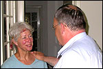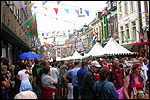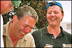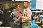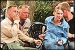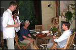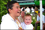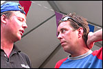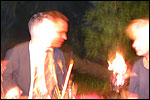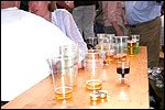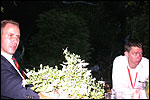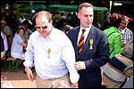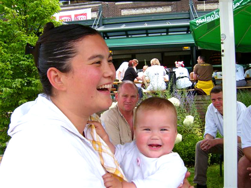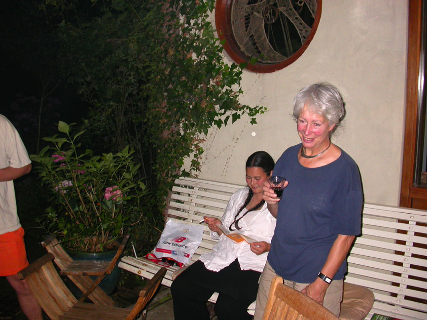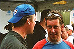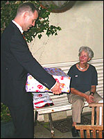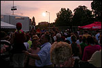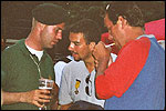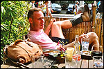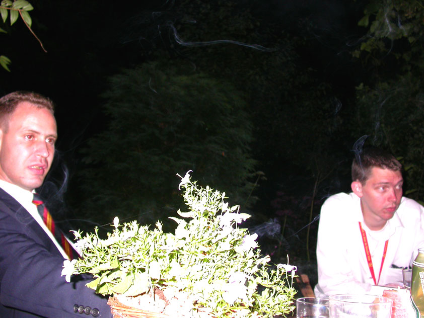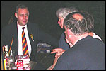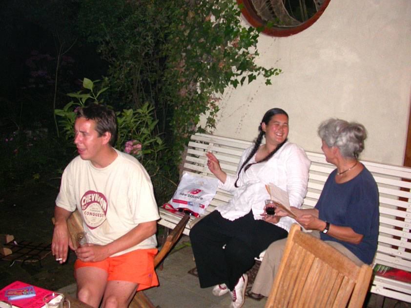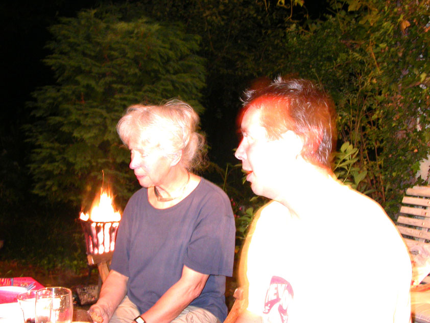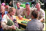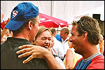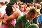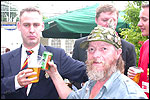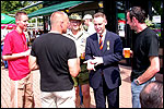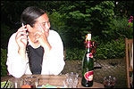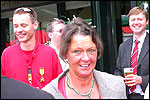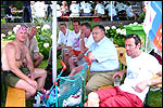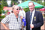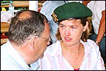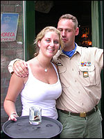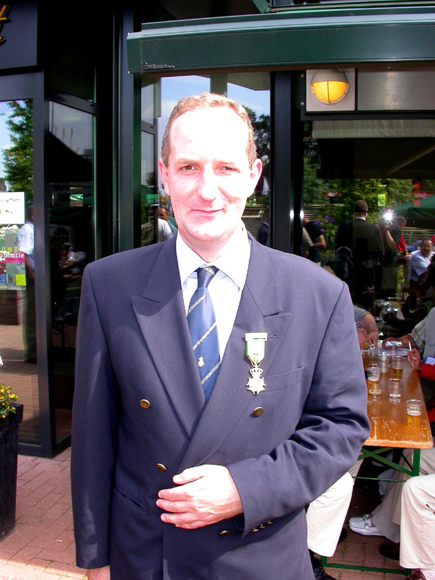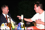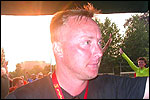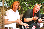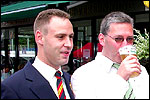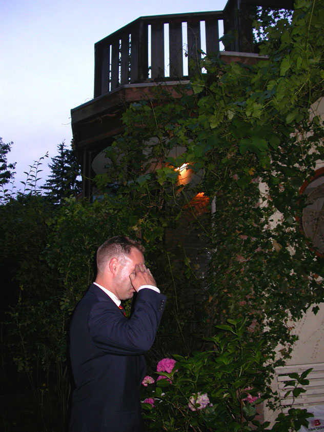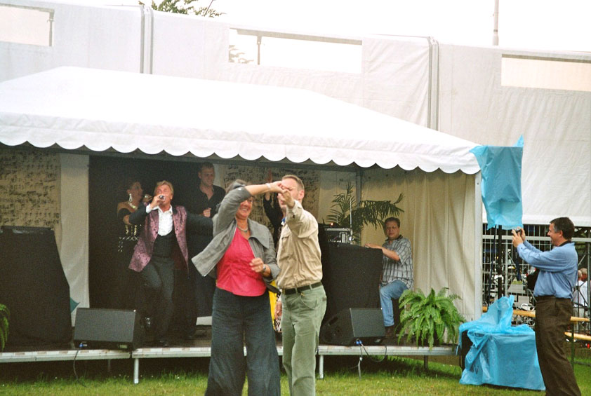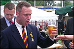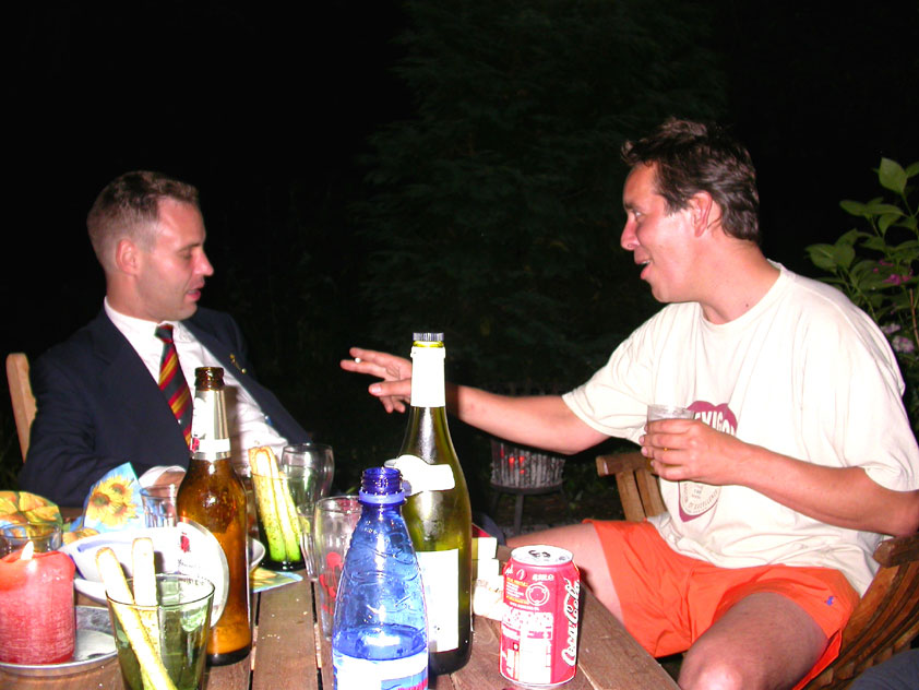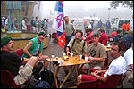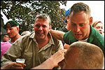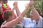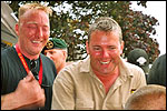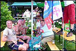 And especially not if that burgomaster is Guusje ter Horst. That, namely, is the most important handsake of the marching annum, because it means your Four Day March is complete. And so it was now, but more so: for those words, "Thank you, Guusje", the most beautiful ones of my walking season, were hard-won this year. I kissed her hand crying. That hand, by the way, the March Management did not get from me, this time over, because they hadn't earned it. Disgusting bunch of mismanagers. Immediately afterwards, I was accosted from the right by what turned out to be Fischer. Bravo! He'd stepped on very calmly, had taken shorter rests than we had, and finished here, in a way that would have become Lourens Dinger. And boy, were we exhausted, the both of us. It was a fucking awful Four Day March, this year. And the hardest I've walked so far (not strange, when you realize that this one was dubbed the hardest since 1927 - but can someone explain to me why, if this Four Day March was the hardest since 1927, they deducted 10 k from it last year?). With bleeding feet, but one pathetic thumbtack with a '4' on it the richer, I therefore fell into Bert's arms crying, at the Vereeniging. This to the astonishment of Marjon (the darling got me my first half litre of beer, I shall never be able to repay her), who as a native to Nijmegen had after all never been so close to a group of Four Day Marchers. And so Bert explained it to her: "He only does that when he's happy, you know". And that, by itself, was true too. Because as we congratulated eachother on the victory gained, and the debeering commenced in the front garden of the Vereeniging, we had to conclude that, although this was a hard and nasty Four Day March, walkingwise, we could, other than that, as Society and Friends Of, look back at a very successful week. This was certainly true for Ronald Fischer, who with his gaining of the Four Day Marches' cross rehabilitated himself in the eyes of many, with respect to his misconduct, whether alleged or not, and for Barend Rijkman, who was wasted, but happy. That his freshly wed wife Annelies appeared here will certainly have contributed to that (and I thought it was a class act of hers).