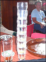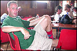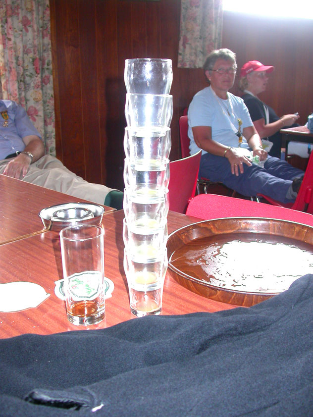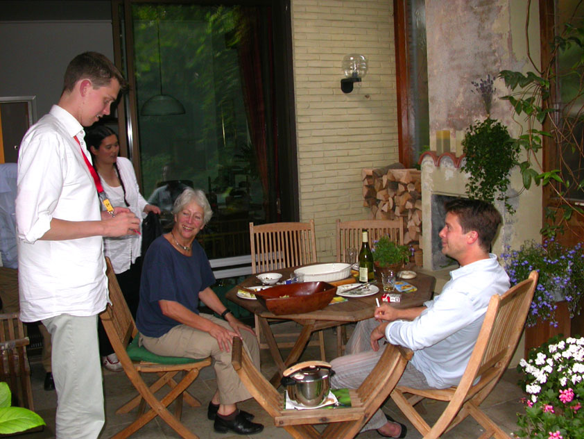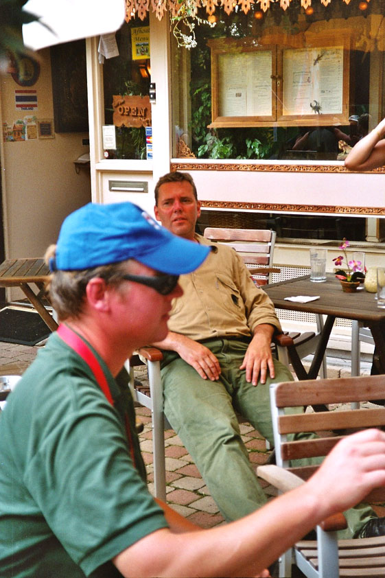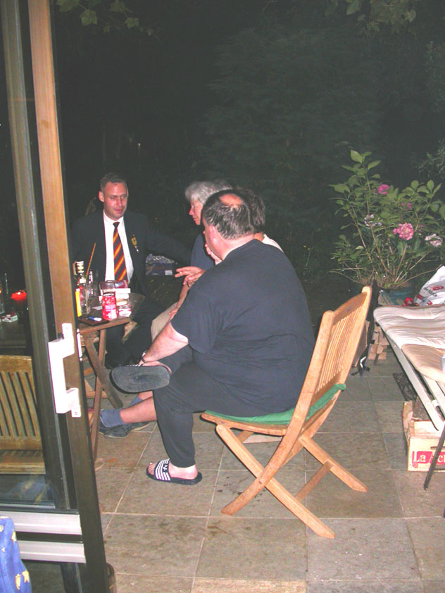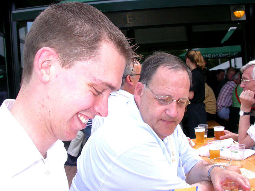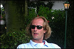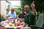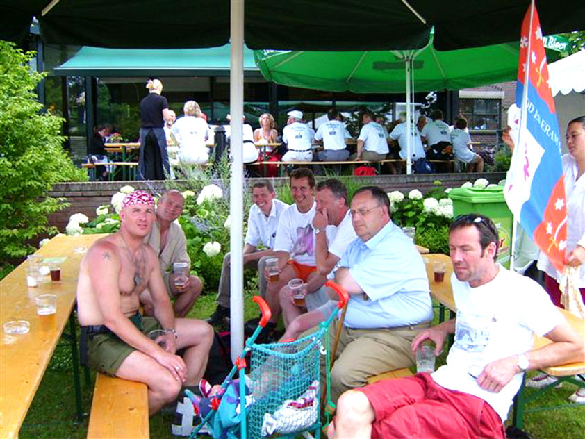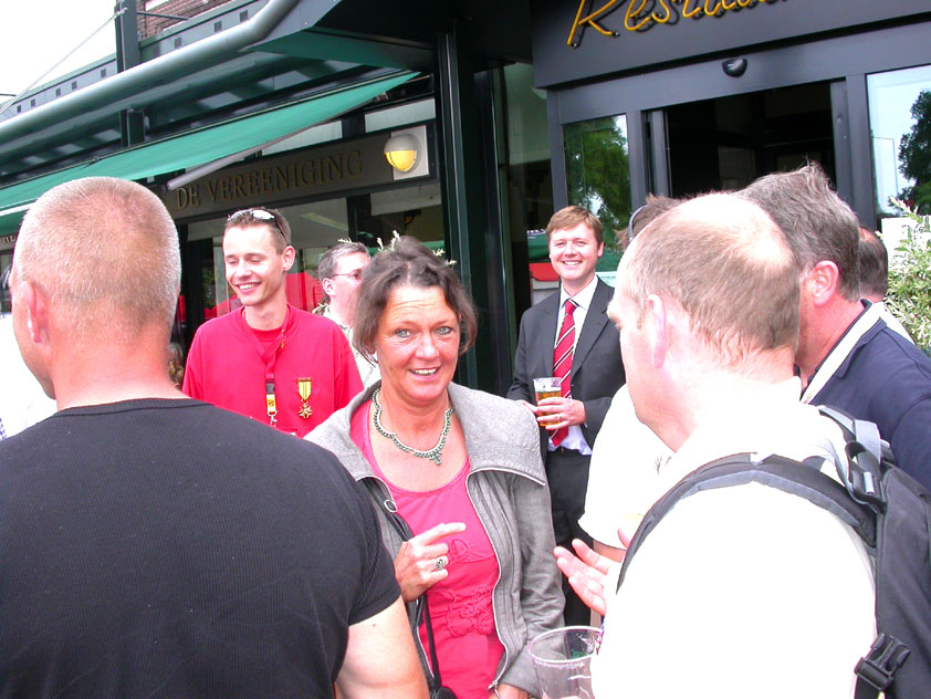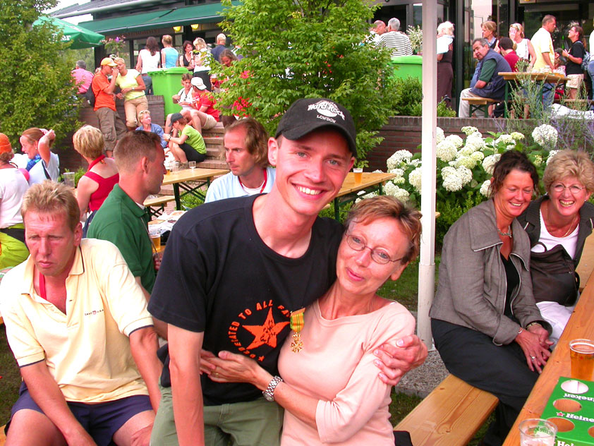 There were more who did that, by the by: there was Marjan, for instance, the operation chamber assistant we knew from the MESA - and the mothers of Marco van Zijntergen, Henk van der Schelden and Raymond de Gisser (who could therefore be there to experience his triumph - for where Raymond had just about finished crawlingly last year, having almost dropped out on the third day, he now stood at the finish reasonably fit). This also went for Jan Middelkoop, who so tragically dropped out only last year, on account of back injury, convinced this year that he will do the fifty next year, because "that 40 was easy". It was, and became, a pleasant party (because the Vereeniging afterwards, THAT's a place where there's everything to laugh about), and remained so until I took off for Arnhem in a taxi. Because after three litres of beer, I completely collapsed. So I called that taxi from the hallway of the Vereeniging. But because it didn't appear to show up any time soon, I decided to recruit my good cousin, for an evil trick. And so I rang him, with the request to call me a second cab. Interesting which one would be there first. This turned out to be a fine plan, for my cousin's one was there within two minutes. And that driver not only was very happy with the ride (because he hadn't been informed yet, that the ride would not go to Nijmegen railway station, but to the van Heemstralaan in Arnhem), but also pleasantly surprised by my ten euro tip. "Are you sure?" "Yes. I only do this once a year, and you've just made me very happy." I could bloody well kiss Lous, when I fell over her doorstep limping, at last. What a relief. A footbath and shower later I went to lie down for a bit, on the bed, to recuperate from Lydia's lasagna (the row with Jochem had been settled, so that we gladly learned that she'd made that lasagna so wonderfully spicy with cayenne- and regular pepper).