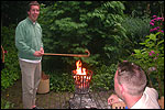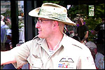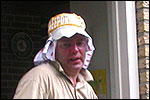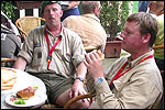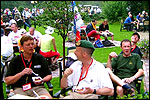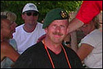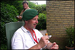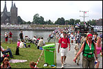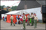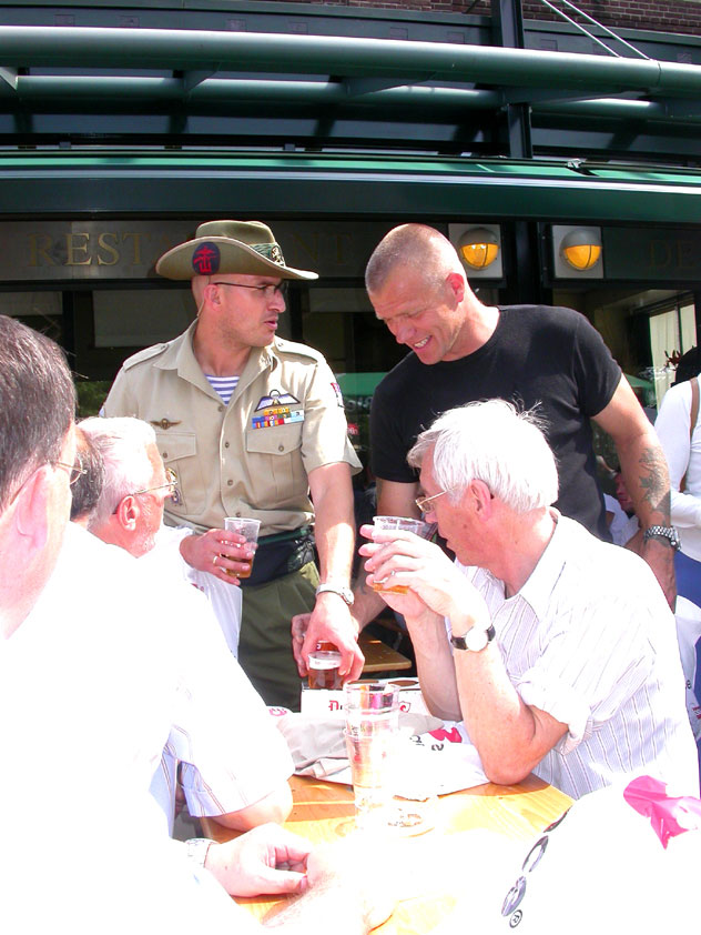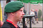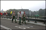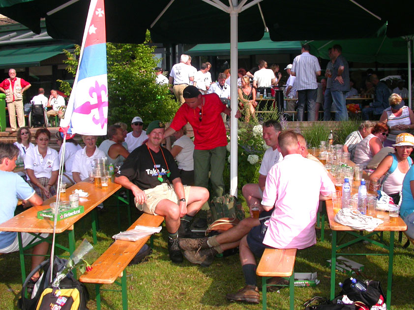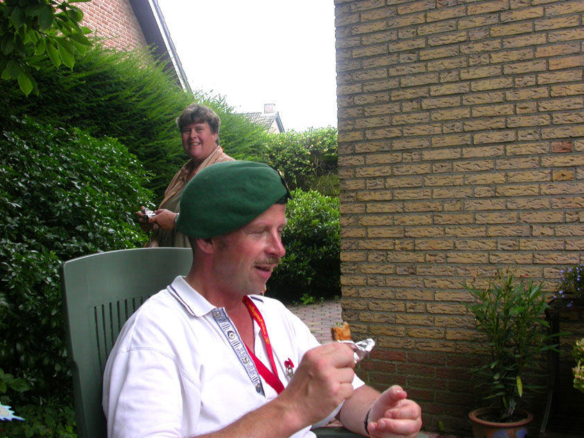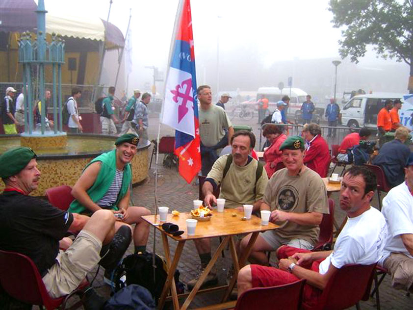 And today wasn't only hard, but very humid too. And this, coupled with the warmth, which was less heavy than last year, but nevertheless not small, played major tricks on us: we were sweating like pigs, today, and kept on doing so, via Gilwell St. Walrick, Overasselt and Grave (just before it, I went into another raging fit, because the organisers had, because of the rainpuddles on it, decided to remove the concrete road-through-the-corn, which I always greatly look forward to, from the course, and to send us along the Maasdyke instead), until, at Schelden's instigation, we inserted an extra rest, without Ted and Bert (who already were completely bodily muddled by the interruptions of their regular schedule of quality rests, the poor lads), in the garden of Dick van Kuppevelt, dentist in Grave (but garden in Gassel), friend of Jan Middelkoop's, for former commando too. And just like they did only recently, he and his wife welcomed us extremely warmly, and did everything to replenish our heavily drained reserves of fluids. Won-der-ful people, and because they did so without us having Jan with us (who was after all doing the 40 k, and therefore walking to Beers not via Gassel, but through Linden) made it all the more wonderful yet. Very wonderful too, was the arrival of Ronald Fischer here. He had by now decked himself out with a do-it-yourself kepi, making him look like the legionair he never was: the North-African variety, namely. Fitting, though, for by now it no longer only was humid, but blastedly hot too, because the sun had broken through. A kind of pressure cooker, to walk through, and so Fischer was having a hard time because of it, on this, his first Four Day March. All of us were having a hard time, by the by. For sheer folly I went and sang some, ont hte long road to Beers. I worked my way through the traditional Jerusalem (I always sing that at this point, namely, for the everpresent British teams), and Kodachrome/Maybellene, the latter to the amusement of a platoon of Americans. Thank God, we did get to Beers, where I stormed into the Arms furious, discerned Ted and Bert, and flung my waterproof bag-with-belongings on the table before their amused eyes. Out of me then came, by and large, the fourth alinea of this report: an elongated stream of curses, directed at sissies in general, and Taeke van der Meer in particular. There. That was a relief. Ted and Bert had been here longer of course, so they already left again, but I could not go another pace without fluid replenishment, so I drank four orange juices in single gulps. This to the amusement of a small kid at the bar. "You must be very thirsty." Too damn right. Had I not had that juice, I would probably have fallen over. For which Bert was hoping, who by now predicted I would not make it to the finish line if I kept my coat on. Taking it off was not an option in any case, of course, that is, not before I'd have passed the pontoon bridge in Cuijk (which I look upon as the finish of my Four Day March, after all, because it is the last distinguished feature in the landscape before the real finish, and I find that whole Via Gladiola an irritating aberration). And we weren't there yet. Since we were, as said, in Beers. And like I already said in the report of the practice march which recently took us along the same bit: the road to Café De Bond, in Cuijk, is short, but always seems long, because of its monotonousness. And so it again was today, after, in Beers, I'd passed a tired, but still smiling Bernd (the reservist I'd met in Ireland) sitting by the roadside, as well as the spot where, in 2002, I'd taken a wrong turn with Marco van Zijntergen and had thus unwillingly lengthened the march with the 10 k that was deducted from the course the year after, and so Café De Bond didn't come a second too soon for me. There, we had the traditional croquette rolls, battled the wasps, and I took a wise decision: because this Four Day Marches' edition, due to the rain on day 1 and, in particular, the level of humidity thereafter, was now on record as the hardest since 1927, I felt I had an excuse to, after the pontoon bridge in Cuijk, take off my coat. And so I did, after I'd walked through the centre of Cuijk, and across that pontoon bridge (and had kissed the pontoon bridge midway, because I always do that too, it is the grandest moment in my marching year). What followed was the long trek to hall 'bowling-around-the-corner' in Malden (the thing is actually called 'De Molen', or 'The Mill', but is much more recognizable by a sign on its outer wall, with the former on it). We arrived there as a group, and tiredly fell into the waiting chairs in the back room. I drank seven orange juices there, and then prepared myself for the finish. On that last stretch, in keeping with tradition, I lost sight of the group and, just so much in keeping with tradition, my self-control. I can't stand it at all, having to, while your stiff legs are on fire, diverge for morons who think the party is more important than the march, and who dance the sirtaki jigging about squarely in the middle of the street you have to walk down - so you're forced to divert or hold back and the razor-sharp stabs of pain remorselessly whack through your limbs.