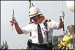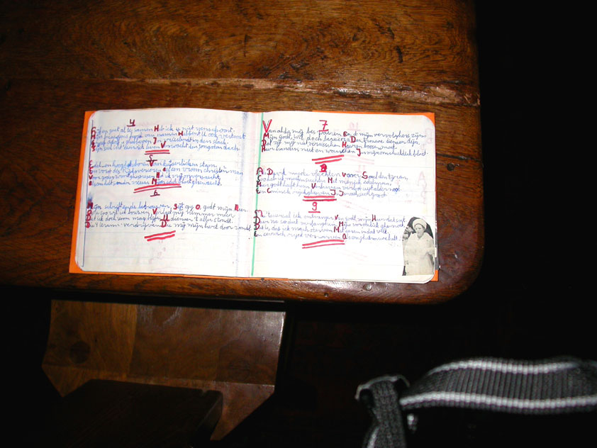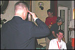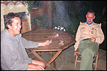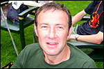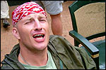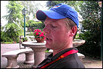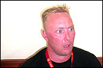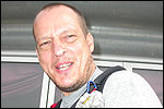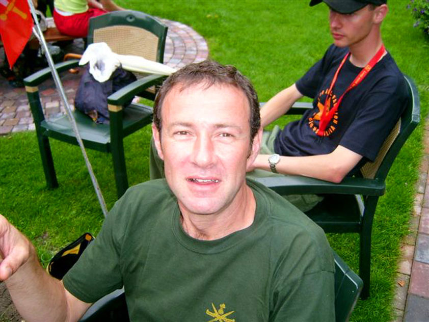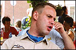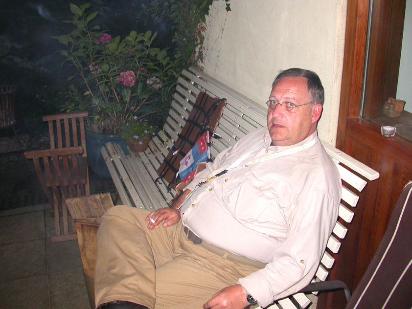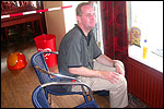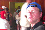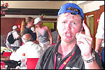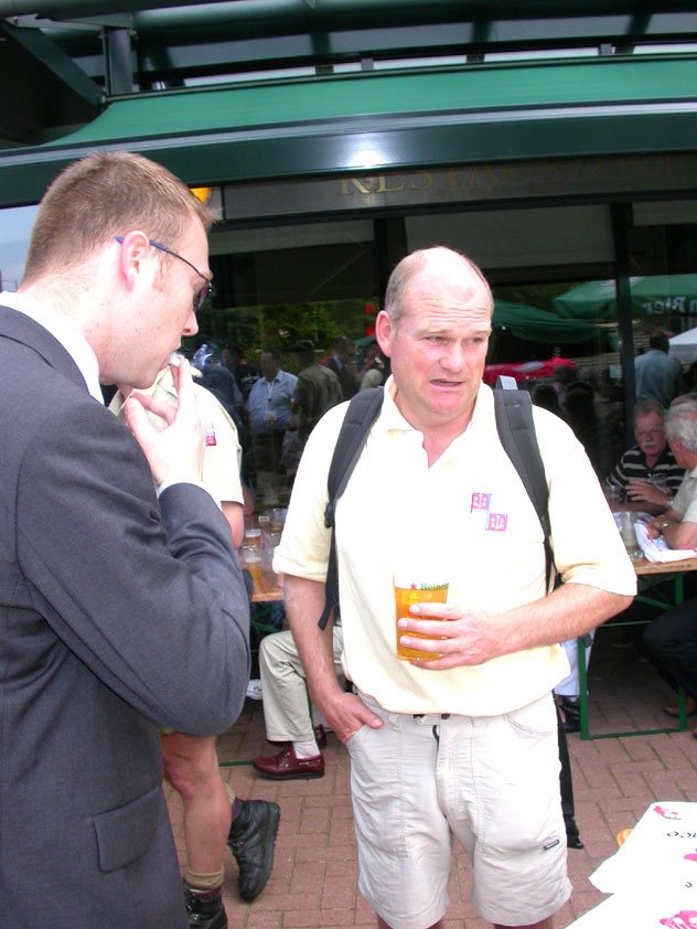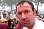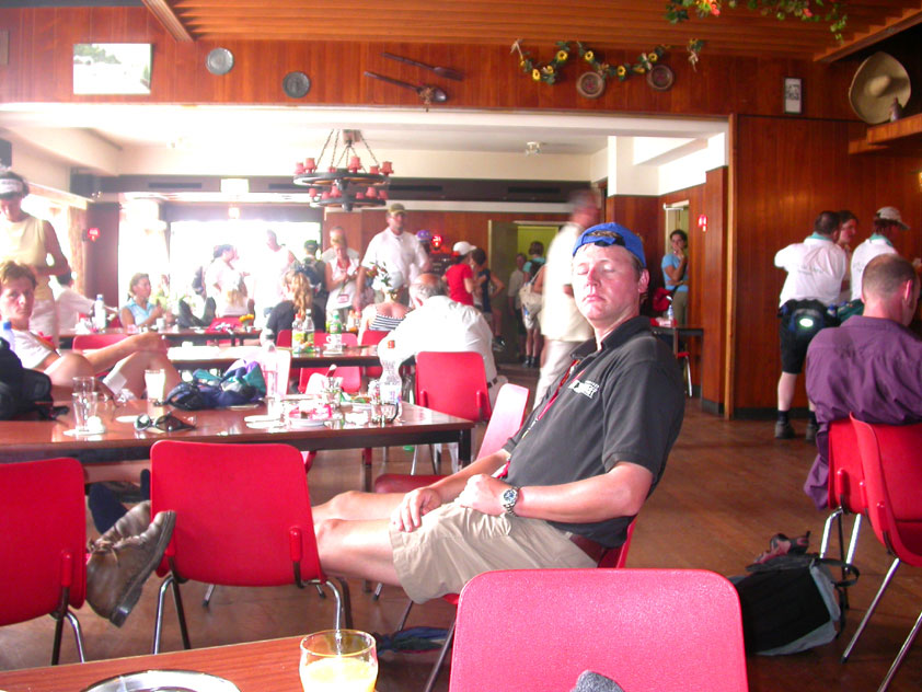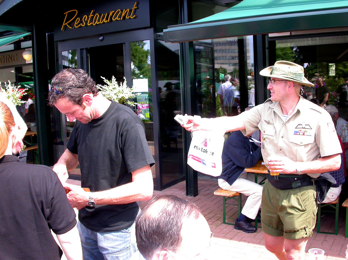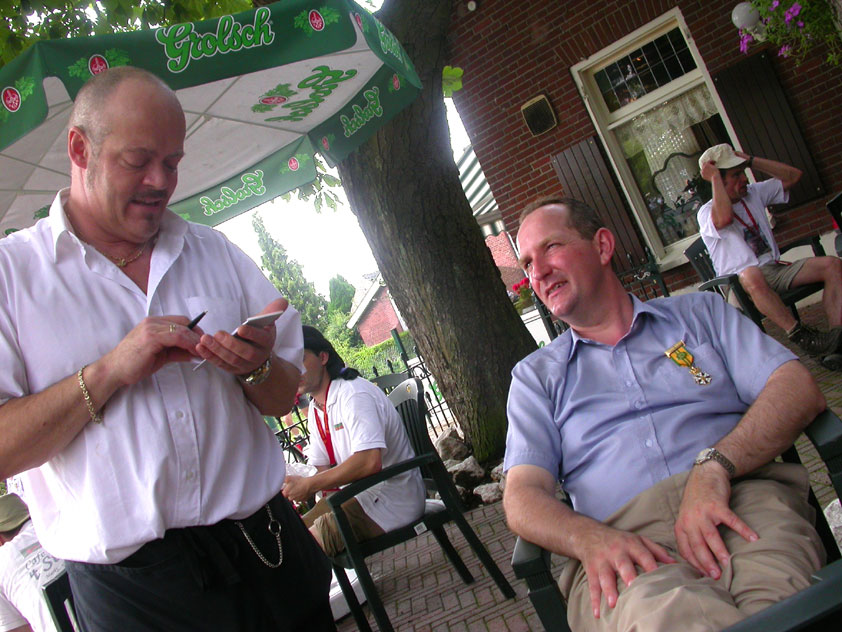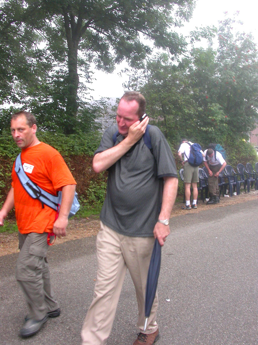 Thankfully, there was a calm female fellow walker of wiser age than mine, who managed to quieten me (and in so doing, bought me a beer, gesture that I naturally reciprocated): she did not, like me, only come to this canteen for three years yet, on the second day of the Four Day Marches, but for twelve years already. I couldn't but acknowledge that she therefore factually was hit much harder than myself, and so respectfully shut up. After I'd briefly positioned myself on the far side of the road, beside Schelden, who'd by then had struck up a conversation with two locals, father and daughter, they told us, moreover, how it had all come to be: the owner of the Moustache had been shot, in a family drama, along with his whole family (and the bar that stood there right now was from a cafe in the village, bravely trying to make up for the loss). The exploitation of resting areas during the Four Day Marches turns out to be a life-threatening pursuit. All the more we will therefore, in future, treat those who take the chance and risk their own lives to alleviate our need, with respect and gratitude. Yes. Well. But now first, onward, through Weurt, back to the Wedren. This all went well, with the festive gay-parade in the In de Betouw- and van Welderen-streets for finale (the Rio-feel was oldfashioned again, although I couldn't escape the impression that the great humidity tempered the fury somewhat). And at the terrace of the Vereeniging an utterly contiguous party was celebrated, with the Hague Cabaret, and two fellow marcherettes, Anita en Elvira, clad in pink wigs, who got to enjoy quite some attention from the Soc.. Back at the van Heemstralaan in Arnhem, the afterdinner was a pleasant one. Lous, together with Lydia and Lanca, supplied us with soup and toast, and Max showed off his t-shirt ('Solidary with Israel, against terror, for peace'), which he'd brought along in case Al Qaeda would make good on its threat against the military partaking in the Four Day Marches, which thankfully hadn't happened yet - an of extra security measures we had, during these first two days, experienced little: it could have been a great deal worse. Day 3 On the day of Groesbeek (following a renewed eggs-and-bacon breakfast in Arnhem, supplied by Lydia, this time, and a ride with her to Nijmegen, because Max was still asleep, this despite his promise to drive me to the start, made the previous day - but I didn't mind so much, since Lydia was driving the rest anyway, and had one place to spare) we were finally compensated for what had been done to us. For although the Tent, Where People Work, was missing again - so that, in the morning, I had to go without my mates, and take up station on a cold traffic island, with my Red Bull - today, thankfully, there turned out to be 1 quality rest in the Four Day Marches' course that was not only preserved, but plainly improved: Old Pensioners' Home the Maldenburch, in Malden. The newly developed part of the building, which is beautiful, had done no harm to the immense friendliness and warmth with which the nursing staff receives one there, not to mention the prices, of food and drink (1 euro per coffee). And the peaceful quiet! I swear to you: the Maldenburch is the best kept secret of the Four Day Marches, and we may be thankful for its undiscovery, for as long as it takes. I'd like to pension myself off there. With one's Four Day Marches' cross on, sit on that terrace during the day of Groesbeek, making sarcastic remarks about 'my day and age'. Won-der-ful. Bert apparently had even once experienced it there, such an old inhabitant with heavily laden cross-on-the-chest. The new development had by the way also produced a neat display case, inside, with paraphernalia from the Four Day Marches' history (very old crosses, for instance, although Ted noted that there sneakily was an Apeldoorn amongst them, whereupon he explained to Barend Rijkman that it's not done to wear that thing, among the Soc., because it is a decoration of a schismatic organization that has dissociated itself from the Mother of all Marches in a sordid manner). On the dyke, from there to Molenhoek, Bert proceeded to expound his fascist sympathies. I didn't believe a word of it, and called him a wouldbe-general with a little tank for wet dream. Nonsense abounded, and it swiftly gained weight. By Mook, namely, I was taken for a long ride by Mr. Fischer, R.. He called me and spoke: "I have dropped out". Great was my fury. I believe I loudly shouted for two-and-a-half-minutes on end, to the joy of Bert, Ted and a platoon of British police officers, passed while cursing. "Who's the one that fuc-king served in the Legion here?!? You, or what!?! And me, parking my lazy ass on an Amsterdam terrace for years, DO finish this march, but you don't?!? WHAT KIND OF BULLSHIT IS THIS?!!? Even if I'd have to crawl across that finishline bleeding from multiple wounds, this is the fucking Four Day March, get that?!?" I was so confounded that, for shock, I passed Mook without noticing - barring one streetcorner on which Huissen, renowned marching military man, lately from the Irish, supplied me with hipwhiskey once more; and shortly after that, en route to Plasmolen, even Ted and Bert decided to attempt to persuade Fischer to finish the march after all. "Mr. van Reenen says he was putting it mildly, just there, his criticism." You fucking bet, Teddie, you fucking well bet. Good thing that Bert reminded me that this was an exceptional moment for shooting a new picture for my collection 'Calling Teddy', a collection of photos begun in 2001, of Ted with the mobile phone he so despises - I would have forgotten, in all the excitement, otherwise. Ronald, meanwhile, was unyielding. It was too late already, because he was in the First Aid-car, en route to Nijmegen. Two minutes later, it turned out he was lying, because we overtook him as he calmly trod forward along the dyke. From which I then, by way of punishment, pushed him down. 