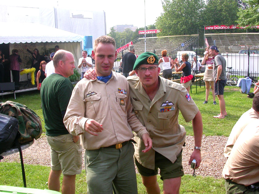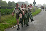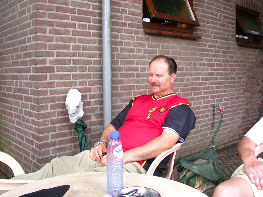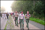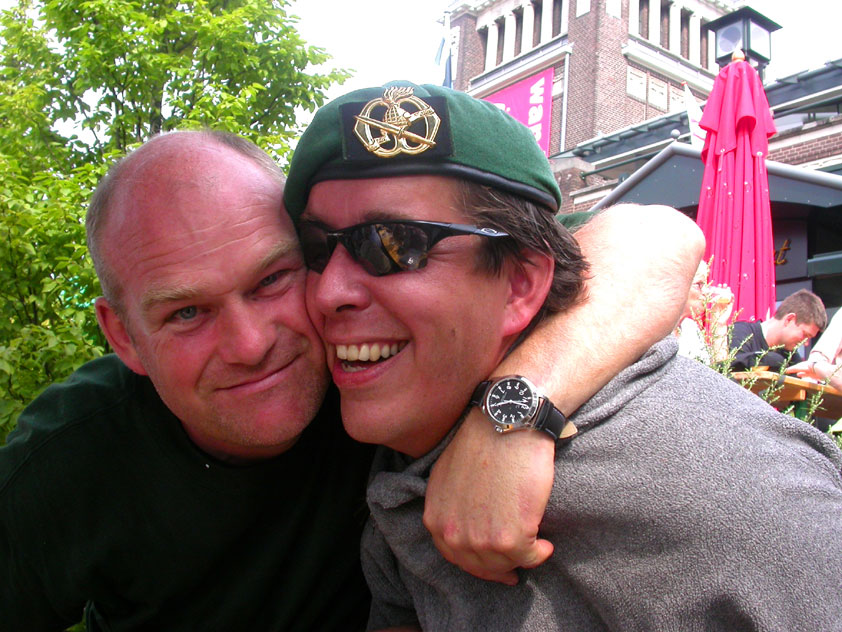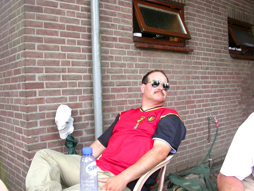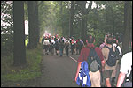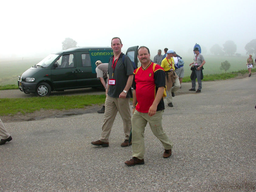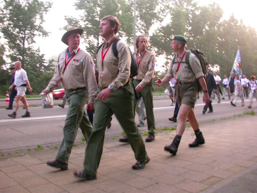 Day 5 I awoke the following afternoon. Considerably damaged (the total amounted to eight blisters, and I haven't had swellings so bad since my second MESA), but quite a bit refreshed. Today was a beautiful day. Not just because it was wonderfully warm summer weather, suddenly without the humidity of the bygone days, but also because of the past week. I therefore quite contentedly said goodbye to Lous and Jochem (expressing the wish to be able to meet Lous at the Airborne in Oosterbeek again), and drove to Groesbeek with Max, where we stopped to visit my cousin, his very pregnant girlfriend Kirsten, and their daughter Inge. Pleasant finale, to a week that went excellently. In Utrecht, we proceeded to deliver Schelden's luggage to Interpay, where he'd already gotten back to work, together with Raymond de Gisser, and then we finally made for home. Where my poor feet and ankles finally got the freedom they were promised, and so swelled to gargantuesque proportions. Whilst writing this it is twenty hours since that stopped - and we write, whilst writing this, August 8th, so two full weeks after the Four Day March (that I only write this report now, is because we've marched so much, in the previous months, that I had five reports to write in two weeks). Preliminary ending to the hardest marching season that I've yet had the pleasure to experience. These are great times. To your health gentlemen, excellent walking there. Bornem, dammit, awaits. |