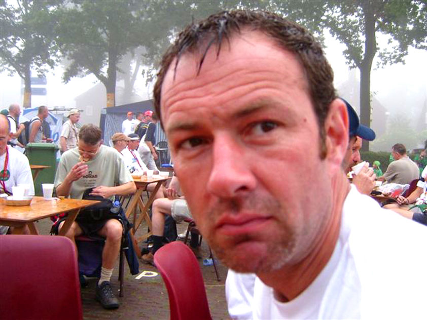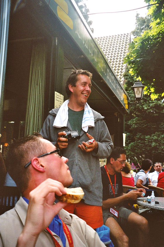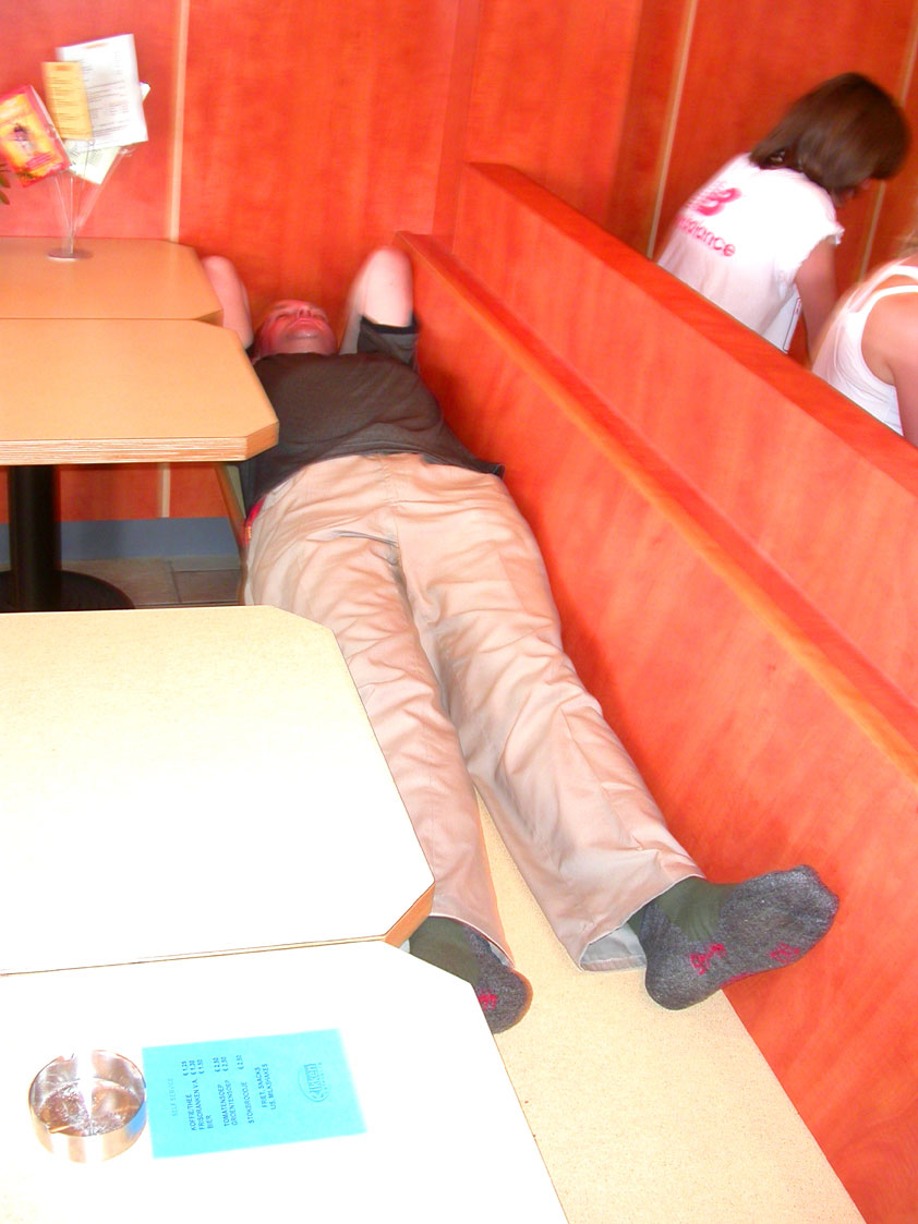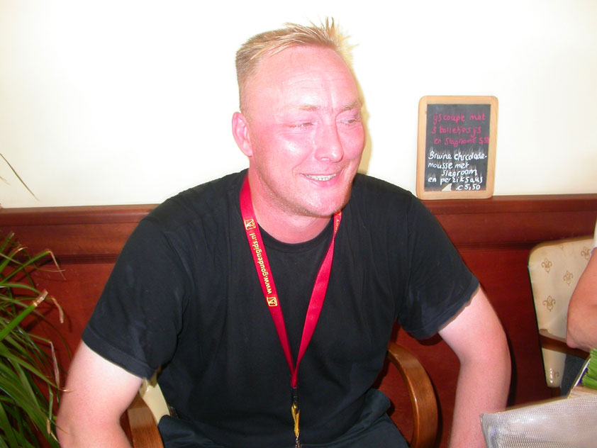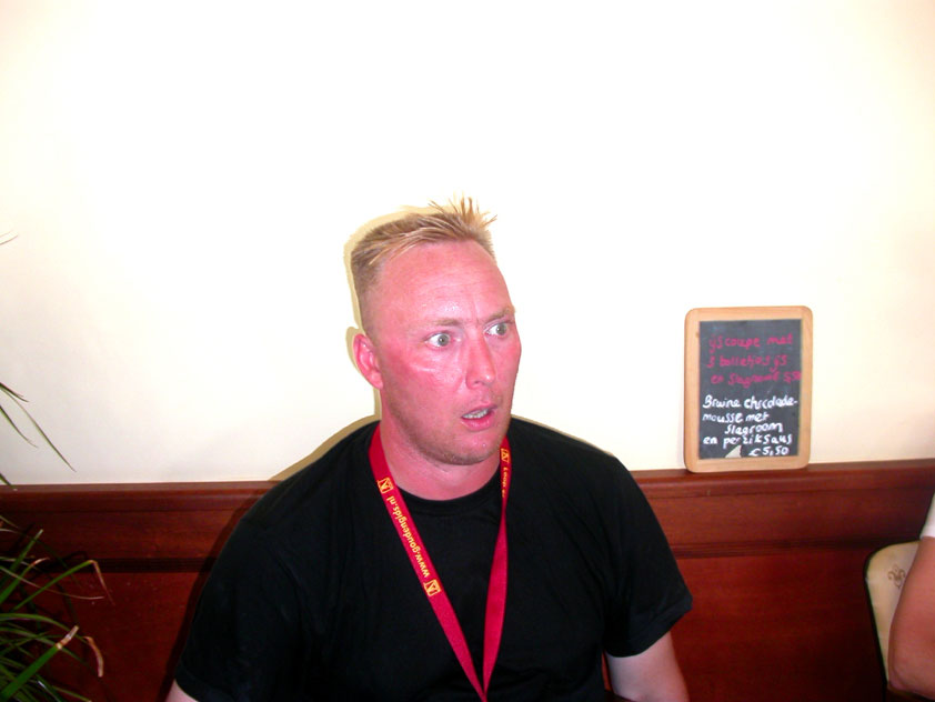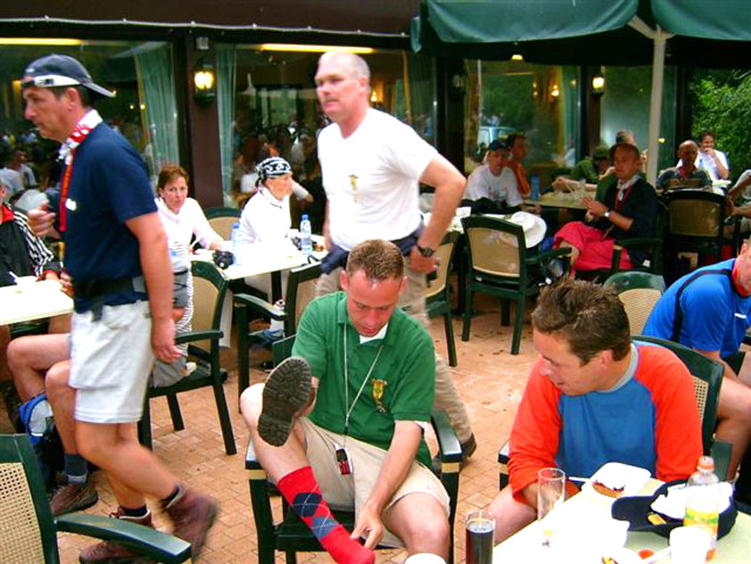 The fish cookies had not run out at all, by the way, because Baan Isaan's staff is smart, and had therefore taken precautionary measures after we'd managed, last year, to conjure the sign 'Out of fish cookies' onto the window. We grinningly ate our way through some six portions of them, and I drank one-and-a-half litres of beer there. At five to five, Marco, Marjon, Henk, Ronald, Barend and I finished contentedly, and hit the beer at the terrace of the Vereeniging. Back in Arnhem, besides a footbath-with-BioTex, soup, toast and crackers from Lous, an ex-cel-lent lasagna-by-Lydia followed. Unfortunately, she then had an argument with Jochem. No idea about what, but it meant, in any case, that we had to go almost an entire day without knowing that she'd made that lasagna so wonderfully spicy with cayenne- and regular pepper. Moreover, it made her leave for Haarlem, with Lanca and Coco. A pity for Jochem in particular, of course, but it saddened us greatly too. Day 4 The next morning, therefore, we were presented with the eggs and bacon at breakfast, by Jochem. This, I then again found an enjoyable gesture. As I found today, as a whole, enjoyable anyway. Logically too, because it was the fourth day, the one of the finish. And I needed it badly, because I had six blisters by now (of which two, very nastily, were atop both my large toes) and bad skinscrapes. Different than yesterday, I nonetheless decided not to tape everything up today, but to give it as much air as possible, partly because my feet and ankles had swollen by now, and plaster stuck onto it wouldn't therefore have enough room, and would sooner create new blisters than prevent them. This would turn out, by the end of the day, to not be a bad strategy, although today naturally was hard enough to make matters worse.