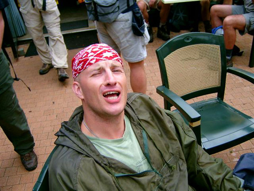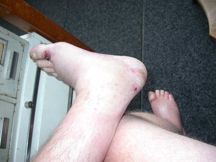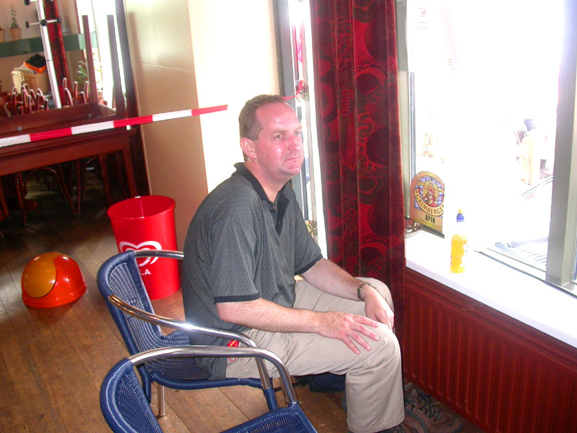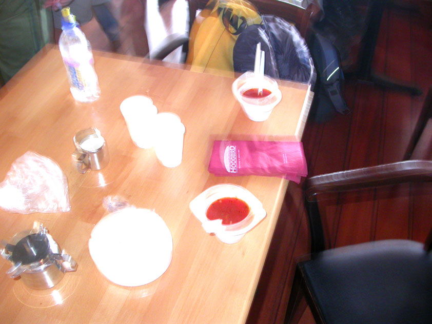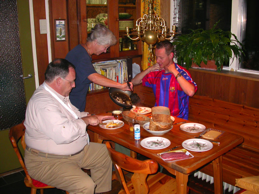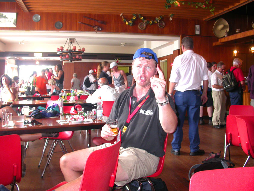 The fish cookies had not run out at all, by the way, because Baan Isaan's staff is smart, and had therefore taken precautionary measures after we'd managed, last year, to conjure the sign 'Out of fish cookies' onto the window. We grinningly ate our way through some six portions of them, and I drank one-and-a-half litres of beer there. At five to five, Marco, Marjon, Henk, Ronald, Barend and I finished contentedly, and hit the beer at the terrace of the Vereeniging. Back in Arnhem, besides a footbath-with-BioTex, soup, toast and crackers from Lous, an ex-cel-lent lasagna-by-Lydia followed. Unfortunately, she then had an argument with Jochem. No idea about what, but it meant, in any case, that we had to go almost an entire day without knowing that she'd made that lasagna so wonderfully spicy with cayenne- and regular pepper. Moreover, it made her leave for Haarlem, with Lanca and Coco. A pity for Jochem in particular, of course, but it saddened us greatly too. Day 4 The next morning, therefore, we were presented with the eggs and bacon at breakfast, by Jochem. This, I then again found an enjoyable gesture. As I found today, as a whole, enjoyable anyway. Logically too, because it was the fourth day, the one of the finish. And I needed it badly, because I had six blisters by now (of which two, very nastily, were atop both my large toes) and bad skinscrapes. Different than yesterday, I nonetheless decided not to tape everything up today, but to give it as much air as possible, partly because my feet and ankles had swollen by now, and plaster stuck onto it wouldn't therefore have enough room, and would sooner create new blisters than prevent them. This would turn out, by the end of the day, to not be a bad strategy, although today naturally was hard enough to make matters worse.