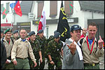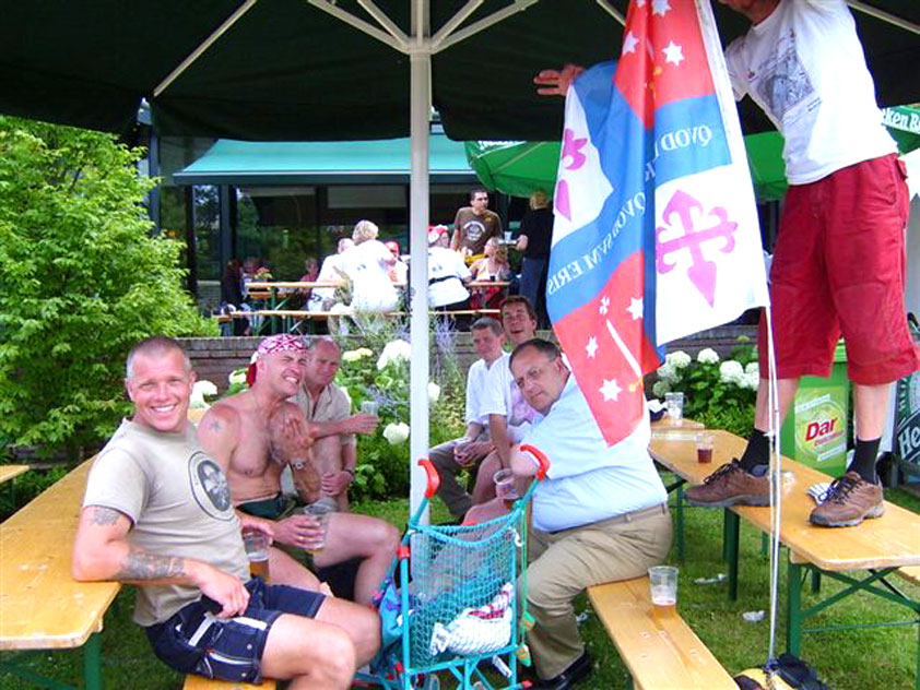 Satisfied though, because, along the bit in between, I had run into German-reservist-of-Dutch-descent Jansen (acquaintance from Bern and Diekirch), who'd offered me a sip of 'Speziellthee', that was gladly accepted, and Schelden had, en route, entertained a platoon from the Haguelands Police with a faked Flemish telephone conversation between him, Berry and Harry (this, I later learned from Ted and Bert, turned out to be a joke cooked up during earlier editions of the Four Day Marches, which he kept up, this time over, for days, for every time he ran into that police platoon) - and they appreciated it as much as we did them, because, at Albert's instigation (who was friends with a former commando in their midst), they supplied us with hot broth just before Valburg. And just after Valburg, I also ran into Grietje Vissers and Janny Beishuizen, with whom it was pleasant talking, about Ireland and the march in Japan, amongst other things. And also, I had, on that stretch in between had some useful experiences, for my Four Day March Communities test of this year. Elden, for instance, is going to get it badly, because of irratingly obstructing youthful stickerbeggars (utterly distasteful development, which turns a once well-meant gesture of the passing detachments into a commercial circus for the underaged). And Elst triumphs again. On a traffic island, just before the town's centre, there were two boys, in the rain, singing: "We remain here, for you! We remain here, for you!" - absolutely touching, just like the sincere and heartwarming reception by the rest of the village, reason for me to compliment the mayoress with her inhabitants (although she herself, as Ted rightly noted, dropped a PR-bollock by not going to stand out in the rain herself, but staying under her lean-to shelter). In the overcrowded Feestzaal Fortuyn (this partly due to the alteration of the course, but also, and more so, because of the rain), thank God, Ted and Bert did join our party as usual (a prior sighting of both, en route to Bemmel, I had flatly repressed, because it is not supposed to be, although, at that occasion, I did almost murder Schelden because he called me 'Stalinist' again, whilst singing), and we contentedly mulled over the hideous nature of the change. This turned out to be an omen, because Slijk-Ewijk, Beatrix hall included, was removed from the course in its entirety, most probably because of the wetness in the Disenchanting Forest, just before it. Apparently, these days, it's a problem, for folk who dare to call themselves walker, if they incur wet feet on a marching course. Un-be-lie-va-ble. Only happens in Holland. In Belgium you're expected to, broadly grinning, love the mud of the Ardennes, in Luxembourg sweltering heat leads to contented beertapping, in Ireland everything's as wet as the whiskey in your hipflask, in Denmark they send you straight into the marsh, in Switzerland the slopes are actually meant to give you heart attacks - but in Holland, as a man, you no longer have to walk the full distance because women also exist, they deduct 10 kilometres from the march when it gets hot, and they reroute the course when it rains. We're made to look like fools, on a global scale.