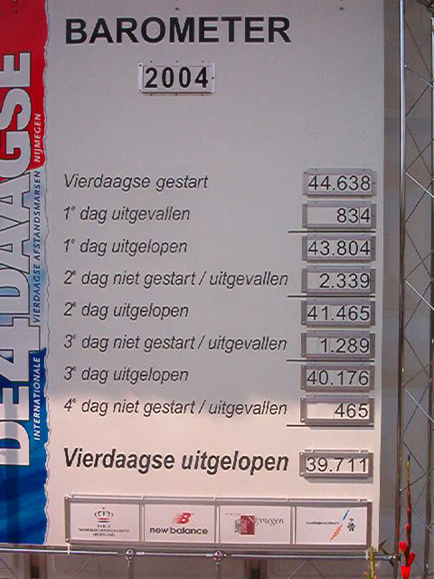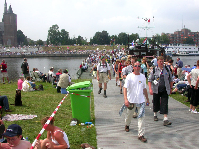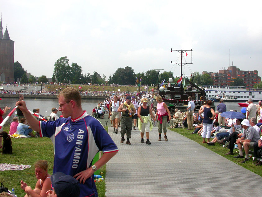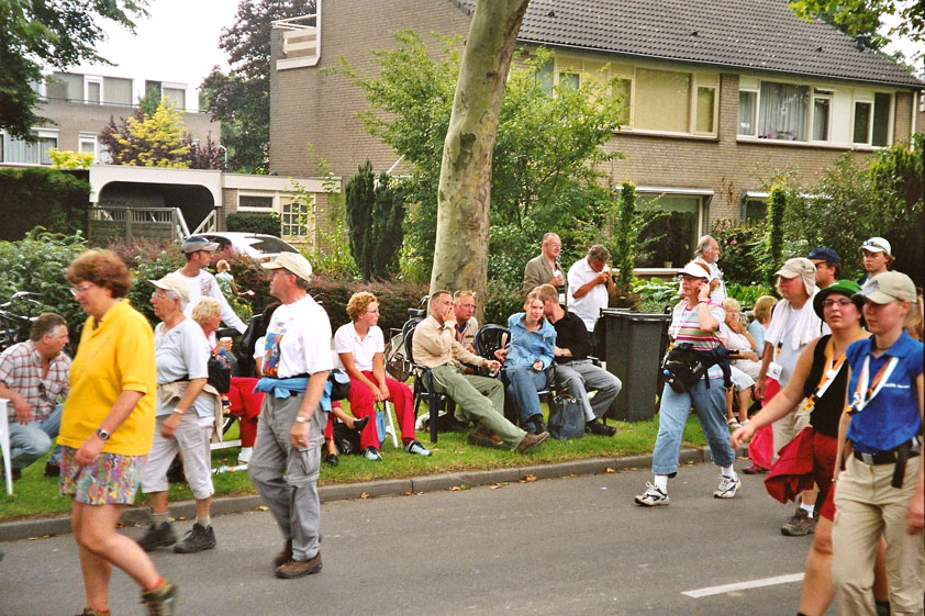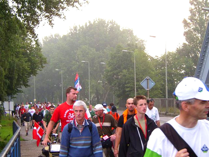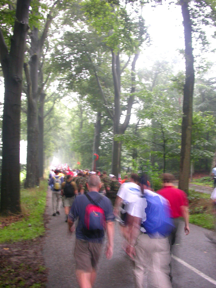 I am, it seems, by the by, surrounded, lately, by morons who believe walking to be a sinecure for Sunday steppers. Did Max, in Diekirch, already complain about the severity of the 20 k distance (this from the mouth of someone who, I'll have you believe, has a Deathmarch to his name), here Lourens Dinger ran the first day like there would be no following three. He was down that dyke by long, by the time that I stepped onto it, and reached the finish at half past two that afternoon, on his first Four Day March. In front of him, of ours, only Swarts, Middelkoop, Regts, Weij and van Ravensteijn walked (and all of them are former commandoes). And to then keep saying you're keeping up "a normal tempo" and "there's nothing wrong". Nonono, of course not.