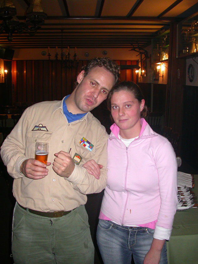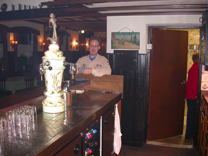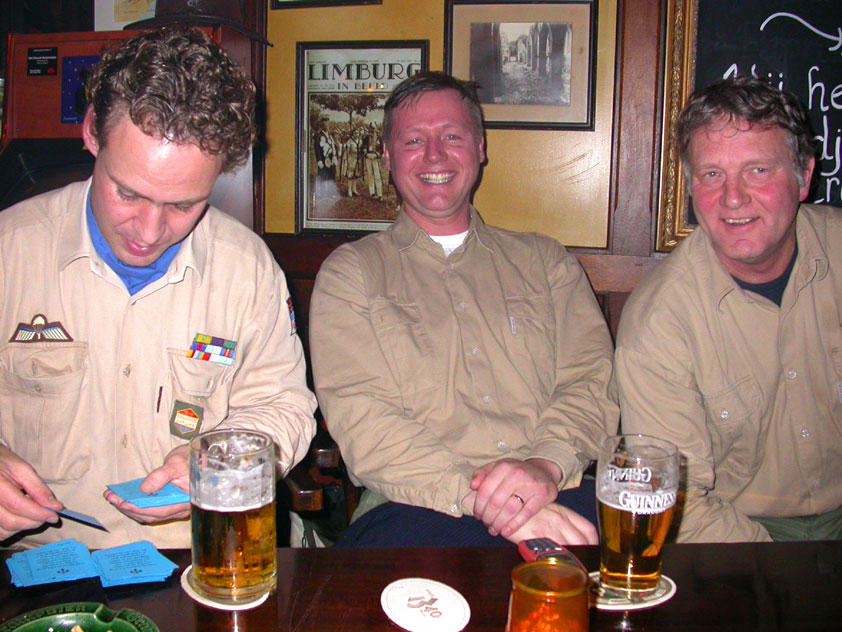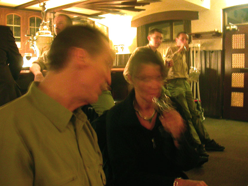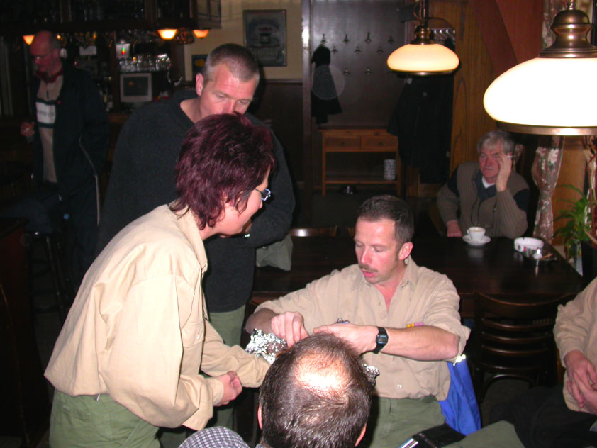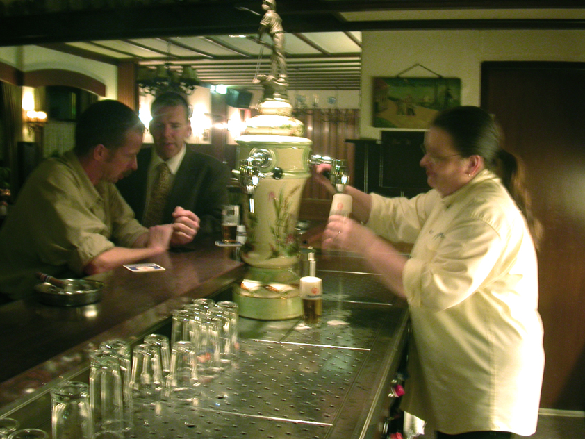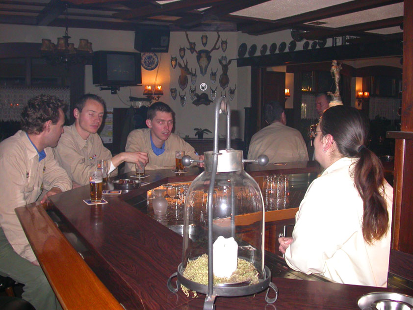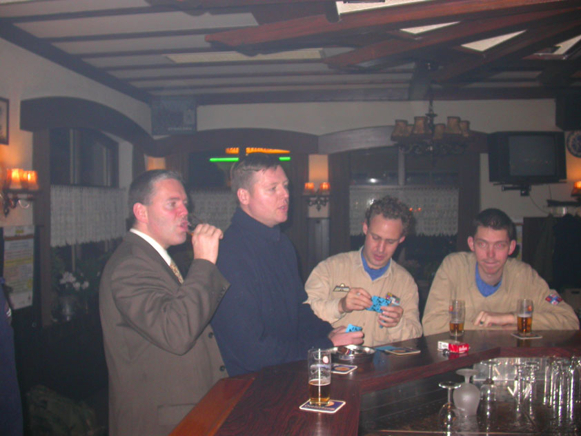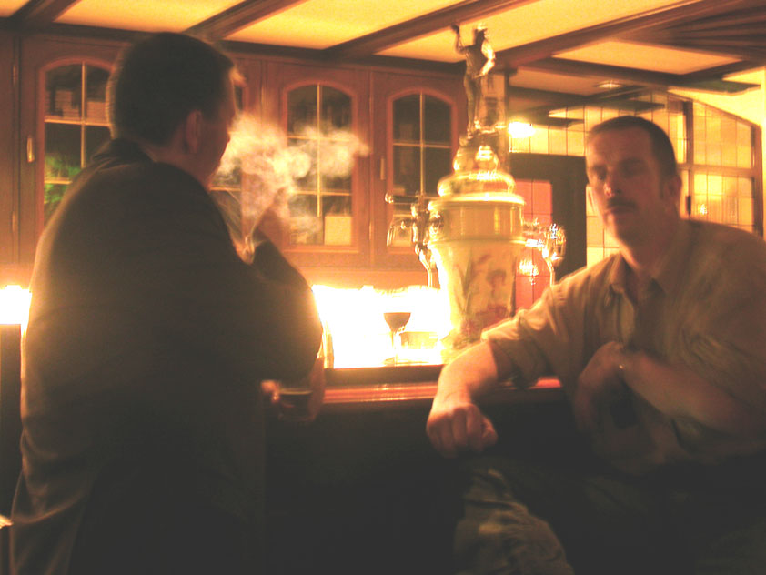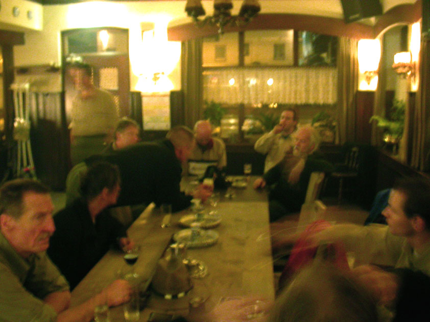 This, of course, was reason for merriment, which only increased as we moved up one establishment, to Café 'Het Wapen van Velden' (The Velden Arms), namely, and not only St. Nicolas passed by (what did that remind us of?), and not only Albert delighted us again ("Schelden! Shouldn't you unpack that lobster?"), but Fischer, at the end of a lavishly liquored night, also really did show us his dick! Weehee! Nothing out of the ordinary, by the by. Grossly exaggerated. Needs more work! Lavishly liquored, by the way, not in the least because Schelden made good on a promise here, by passing around drinks through tickets he'd prepared himself, beforehand. He'd thought of this to celebrate that we had reached Velden, but also that George Bush had been reelected (and he'd even made those tickets subject of a bet about that, in advance). Very nice, by itself, but oldfashionedly frenetic in its interpretation, of course. Because, as he had announced beforehand, those tickets bought you a beer, not a drink, apiece. So whoever desired to drink liquor, had to remember that each ticket was worth €1,30 (the price of a beer in the Velden Arms, utterly reasonable amount, of course) and then, according to Schelden, furnish the remainder on one's own. When I had thereupon said that I would pass on his tickets, because it would mean less of a hassle for me, he threw a total fit and hollered that I should not ruin his party. Heeheehee. I didn't, of course, intend to ruin his party - and I therefore, having bought a vodka out of my own pocket, made a festive toast to John Kerry. After which, to make up for it all, I drank ticket beer for the rest of the night, and did after all congratulate Schelden with George's victory. One has to be above certain things, at times, in this life, eh.