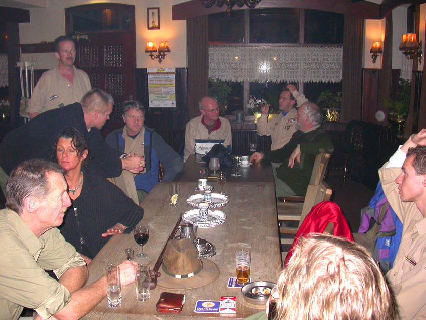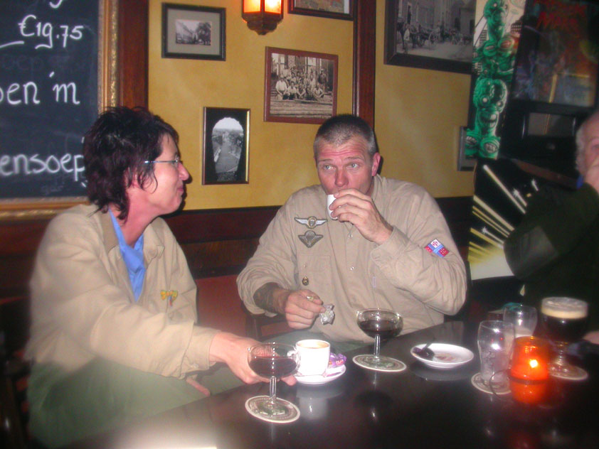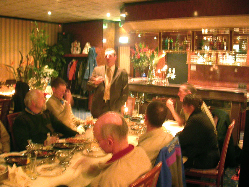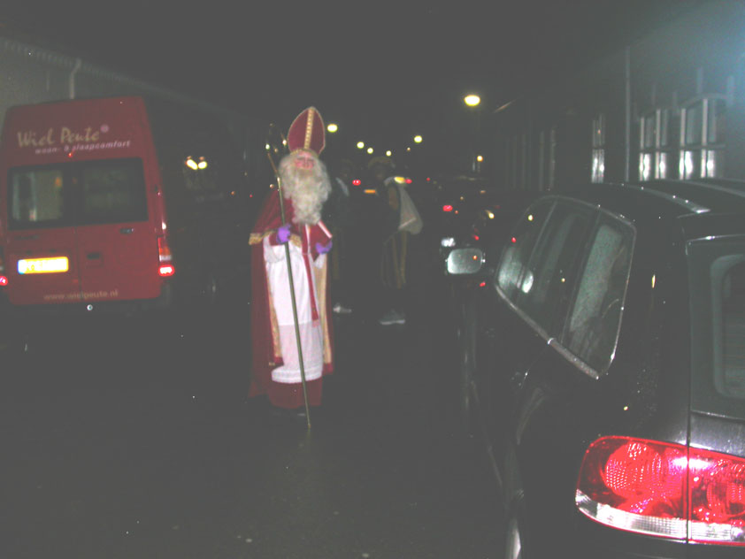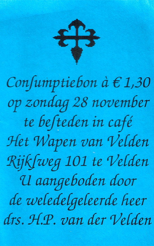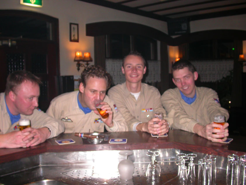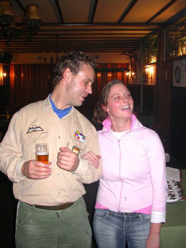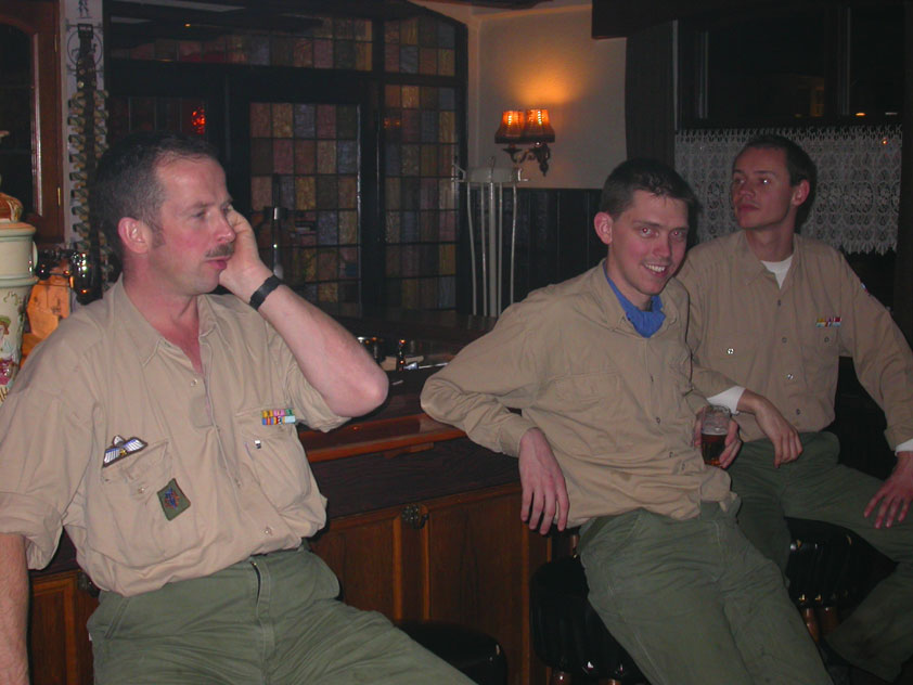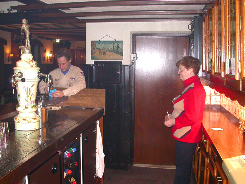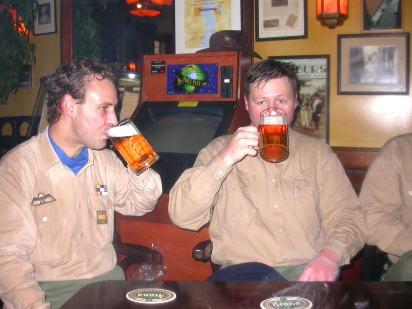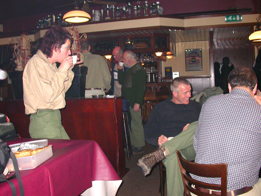 This, of course, was reason for merriment, which only increased as we moved up one establishment, to Café 'Het Wapen van Velden' (The Velden Arms), namely, and not only St. Nicolas passed by (what did that remind us of?), and not only Albert delighted us again ("Schelden! Shouldn't you unpack that lobster?"), but Fischer, at the end of a lavishly liquored night, also really did show us his dick! Weehee! Nothing out of the ordinary, by the by. Grossly exaggerated. Needs more work! Lavishly liquored, by the way, not in the least because Schelden made good on a promise here, by passing around drinks through tickets he'd prepared himself, beforehand. He'd thought of this to celebrate that we had reached Velden, but also that George Bush had been reelected (and he'd even made those tickets subject of a bet about that, in advance). Very nice, by itself, but oldfashionedly frenetic in its interpretation, of course. Because, as he had announced beforehand, those tickets bought you a beer, not a drink, apiece. So whoever desired to drink liquor, had to remember that each ticket was worth €1,30 (the price of a beer in the Velden Arms, utterly reasonable amount, of course) and then, according to Schelden, furnish the remainder on one's own. When I had thereupon said that I would pass on his tickets, because it would mean less of a hassle for me, he threw a total fit and hollered that I should not ruin his party. Heeheehee. I didn't, of course, intend to ruin his party - and I therefore, having bought a vodka out of my own pocket, made a festive toast to John Kerry. After which, to make up for it all, I drank ticket beer for the rest of the night, and did after all congratulate Schelden with George's victory. One has to be above certain things, at times, in this life, eh.