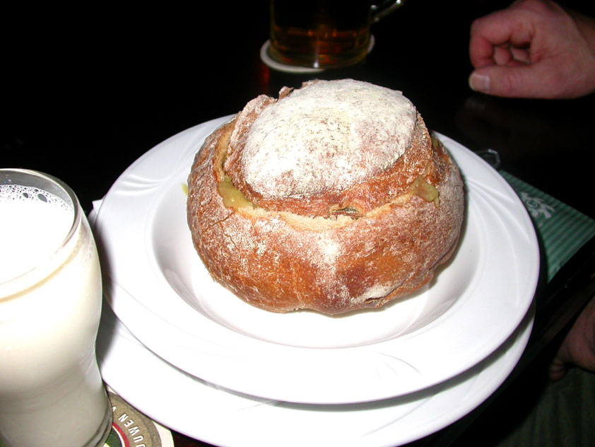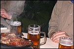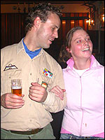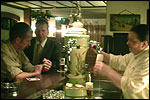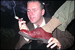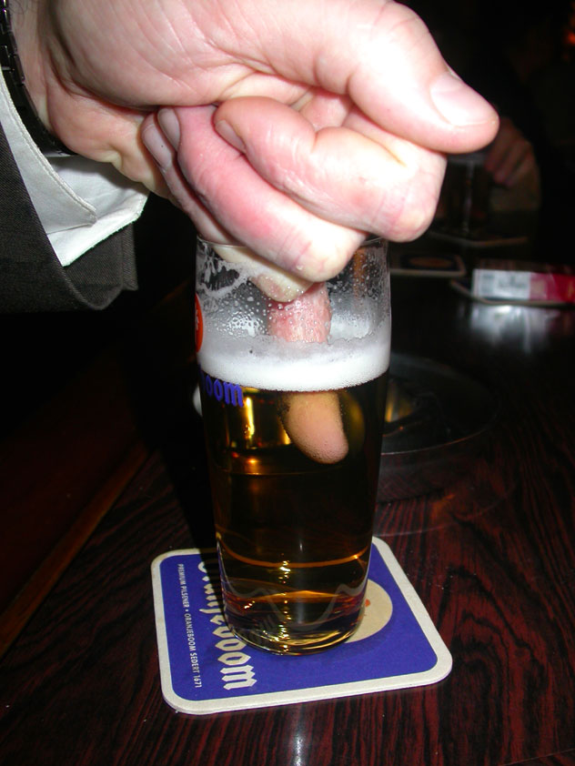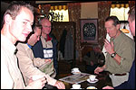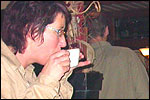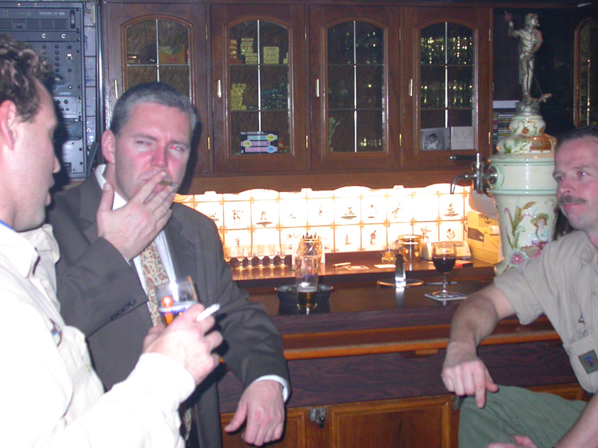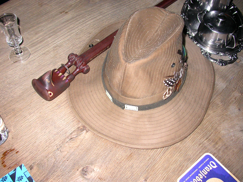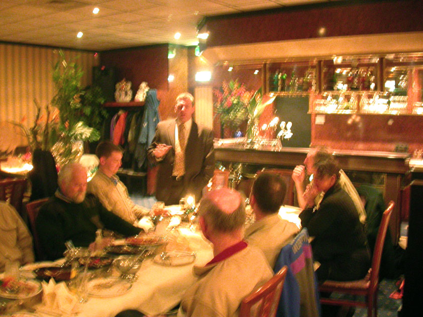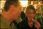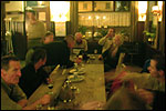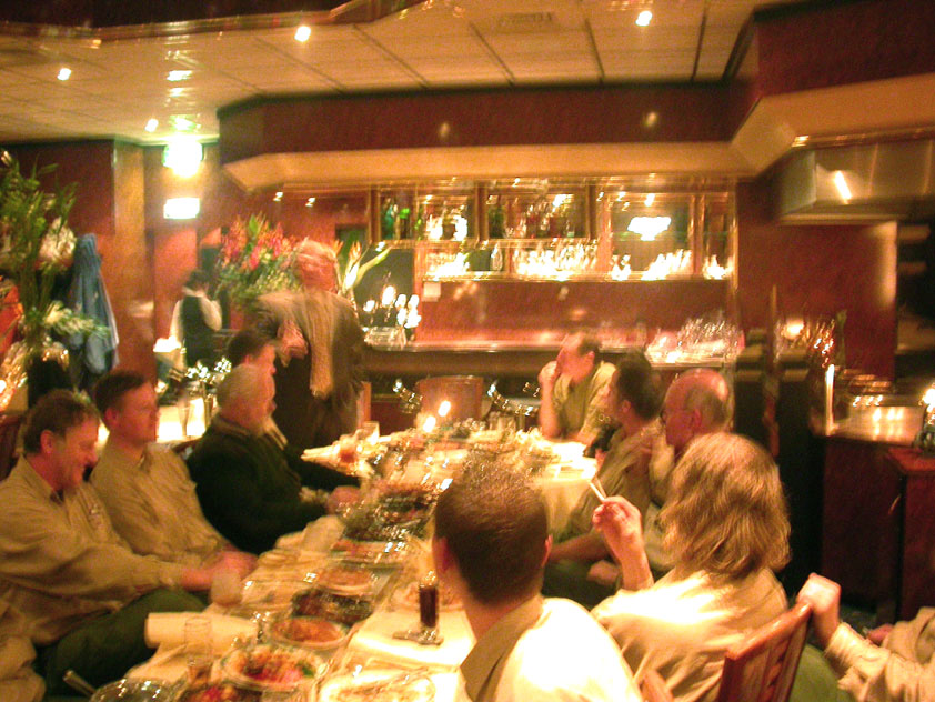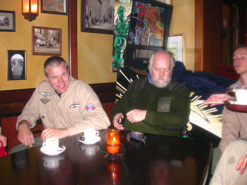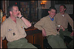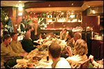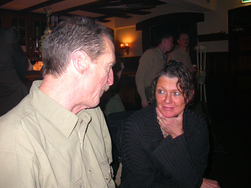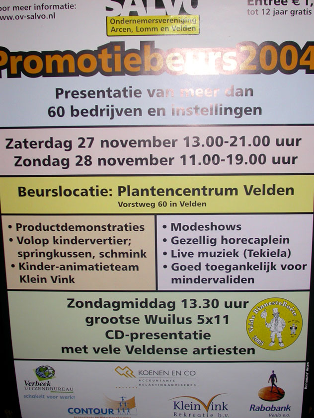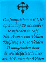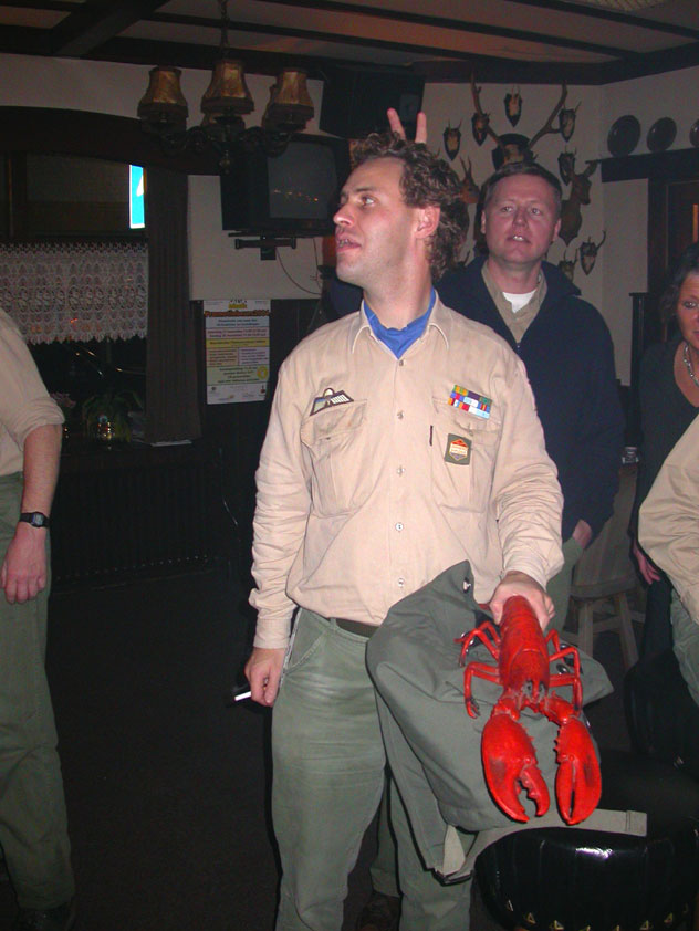 This, of course, was reason for merriment, which only increased as we moved up one establishment, to Café 'Het Wapen van Velden' (The Velden Arms), namely, and not only St. Nicolas passed by (what did that remind us of?), and not only Albert delighted us again ("Schelden! Shouldn't you unpack that lobster?"), but Fischer, at the end of a lavishly liquored night, also really did show us his dick! Weehee! Nothing out of the ordinary, by the by. Grossly exaggerated. Needs more work! Lavishly liquored, by the way, not in the least because Schelden made good on a promise here, by passing around drinks through tickets he'd prepared himself, beforehand. He'd thought of this to celebrate that we had reached Velden, but also that George Bush had been reelected (and he'd even made those tickets subject of a bet about that, in advance). Very nice, by itself, but oldfashionedly frenetic in its interpretation, of course. Because, as he had announced beforehand, those tickets bought you a beer, not a drink, apiece. So whoever desired to drink liquor, had to remember that each ticket was worth €1,30 (the price of a beer in the Velden Arms, utterly reasonable amount, of course) and then, according to Schelden, furnish the remainder on one's own. When I had thereupon said that I would pass on his tickets, because it would mean less of a hassle for me, he threw a total fit and hollered that I should not ruin his party. Heeheehee. I didn't, of course, intend to ruin his party - and I therefore, having bought a vodka out of my own pocket, made a festive toast to John Kerry. After which, to make up for it all, I drank ticket beer for the rest of the night, and did after all congratulate Schelden with George's victory. One has to be above certain things, at times, in this life, eh.