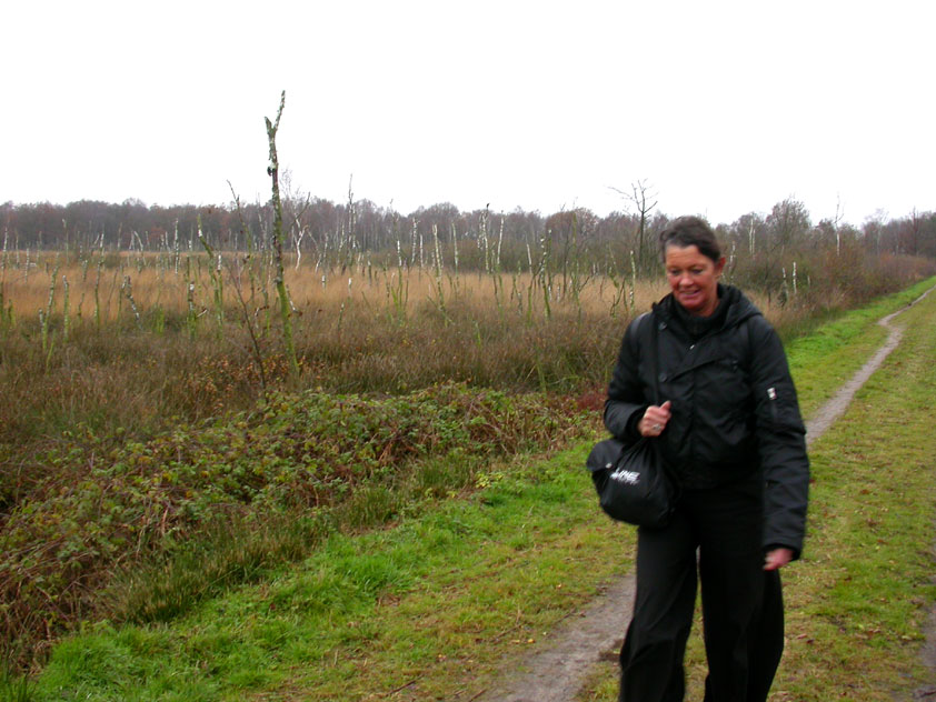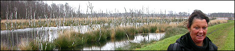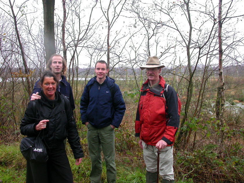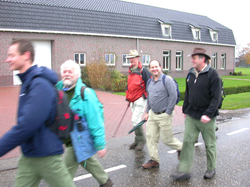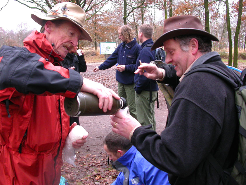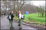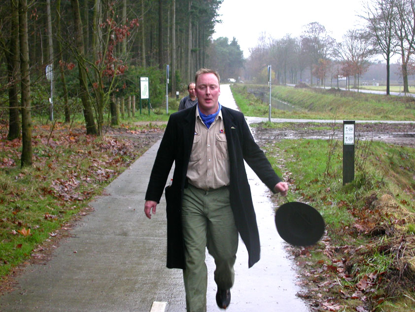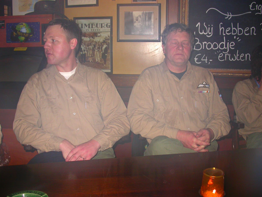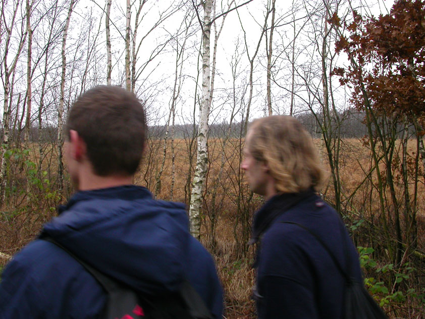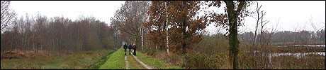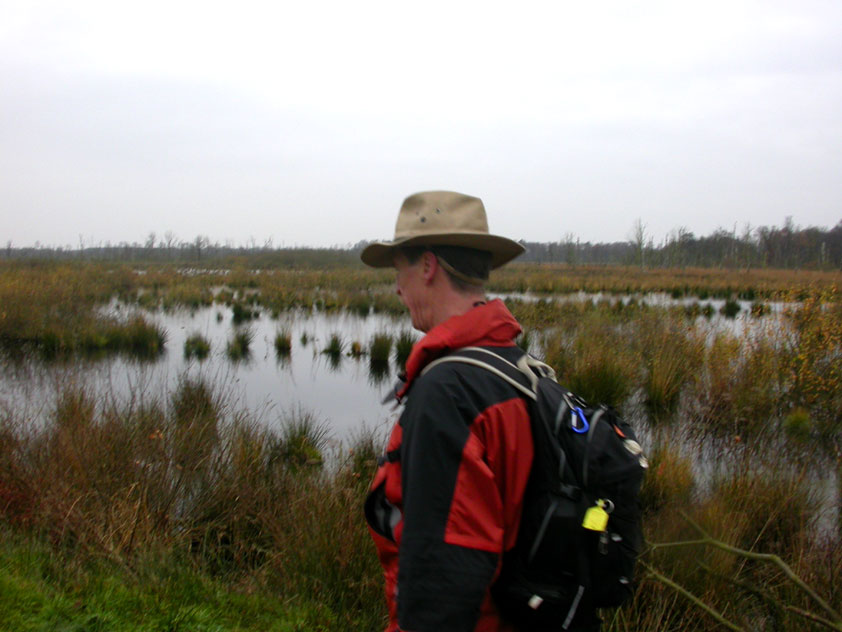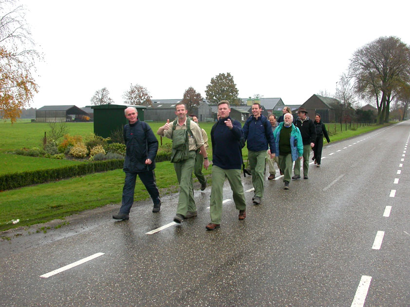 Good thing, that the marchleader immediately diverted us, by, shortly after leaving the cemetery, trekking straight through a meadow and (heavy ploughing) a cornfield, with a ditch for dessert. Odd, though, that he managed to cross this ditch without clamour or trouble. How different, from the last time. And this while this time's ditch really was larger and wider than last time's. But, excellent action, again, this to the great amusement of René in particular, who was having a great time anyway, because he was, at last, among people who dared to take the piss out of Schelden continuously. A little later, we stopped at Griendtsveen, or in any case, at its edge, at another war monument. It wasn't entirely clear to us, at that time, to what, apart from the Second World War in general, it referred, but it later turned out, whilst researching on the Net, that Griendtsveen had been evacuated during the war. Right after that monument, we made our way, by way of an ostensible dead end, into nature reserve Mariapeel. And there, the scales loudly fell from our eyes. For this peat moor, along with Overijssel around the Besthmener and Sprengen mounds (see the report on stage 7), really is the most beautiful bit of Holland that we, as Wandelsoc., have trod upon so far. Silent marshland with dying birches, rising like sticks from borderless water water (the tufaformations in Hypgnosis' Mono-lake of Pink Floyd's 'Wish you were here' pale in comparison), vast solitude and quiet, a wild goose here and there: the Peel (pronounce: pale) as primaeval area, beautiful bit of the past. Suddenly those books by Toon Kortooms came alive: the stories of 'Beekman en Beekman' and, for me personally in particular, 'De zwarte plak' ('black slice', meaning 'of peat', but the word 'plak' also is a synonym for 'henpecked', meaning the way the Dutch were by the Germans), enchanting tale about the resistance in Limburg during the Second World War, penned in 1948 already(!). Outdoor adventure, of the better kind. Those Germans must have been driven to insanity: anything can disappear in these swamps. Beautiful, and it therefore wasn't even just because of Pieter Spaan's Glühwein (that he started to pass around here - I'm telling you, that man, alcoholically speaking, has utterly proper ideas!) that, as soon as we were out of this marshland, we took a much contented break to catch our breath. Following that, Friend van Prijzen had predicted that what would come now was ugly again, but none of that came true during the first few kilometres - so that I could pleasantly pester him by, time and again, shouting "It's not all too bad, the landscape here, Bert!", from his wake. Better yet, I then finally succeeded in taking his photograph while he was urinating ("You're gonna hear from my lawyer!"). Although that was also the moment in which I had to admit we had finally ended up in ugliness. "Jay-sus, Bert, this place is so ugly!" This, then again, was totally drawn into the gaudily preposterous by the suddenly materializing themepark Toverland (Magic Land) (sim-sala-tastic). Reason for a nice group portrait, in front of it. And that wasn't the end of the fun: Sevenum is alive, with it. Because apart from the endless pig farms (with the roguish logo of sow production company 'Cofok' as hilarious summum, and Martin Gaus' dog school as runner up), that, indeed, do definitely not enhance the landscape with their sheds and degassing chimneys, there was the excellent Café De Sevewaeg, in Sevenum's town centre, that sported the 'peasoup bun' on its menu. Bewildered because of this, I decided to order it, along with my usual beverage array of milk (no butter- available again), orange juice, coffee and beer. And I'll be damned! You don't believe your eyes! A real sphereshaped bun of sourbread finequality, with a liftable lid, and below it, in it therefore, actually steaming peasoup! That my late grandma from Zeist would not have bettered, to boot! A delicious experience, which we were in dire need of, mind you. Because thereupon, because of a performance of a local theatre company in the backroom, all hell broke loose: we were roughly pushed over by massing locals, and when we had finally escaped them, we found ourselves outside, in the pouring rain. This then did produce funny pictures of ponchoed Socsillies, and otherwise, too, noone was about to get in a flurry because of it. Take, for instance, Albert. We hadn't well and true left Sevenum, prancing along down a treelined death trap (where, again, mongoloids passed us at ridiculous speeds; this seems to be habit in the Limburgian, because it happened during the previous episode too) or Albert said "Chielie! Got any cutlery on you?". "No!" "Yes you do, it's sticking out of your right pocket!" I'll say. The villain had, indeed, supplied me with a Sevewaegian set of utensils, without me noticing. And I wasn't the only victim. "Bert! Got a beer tankard on you, by chance?"