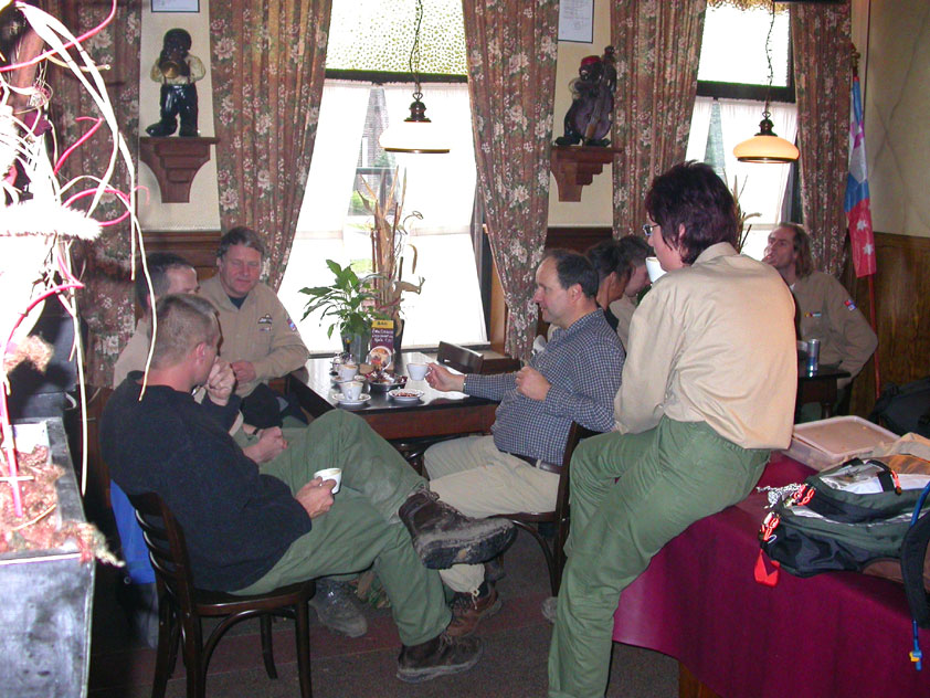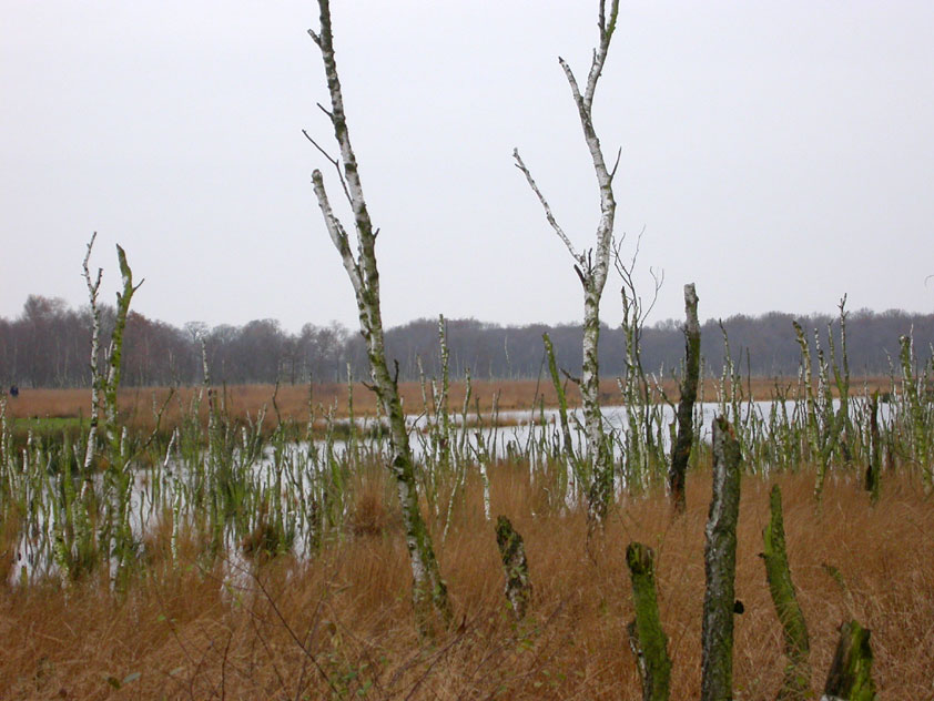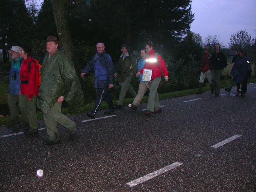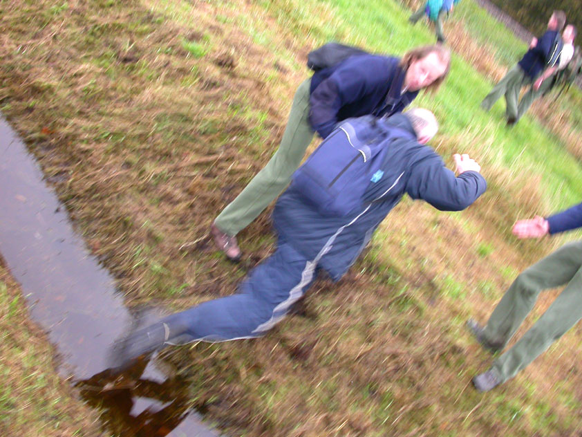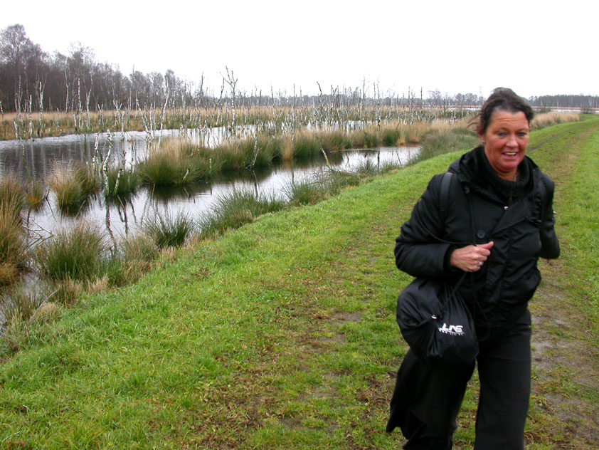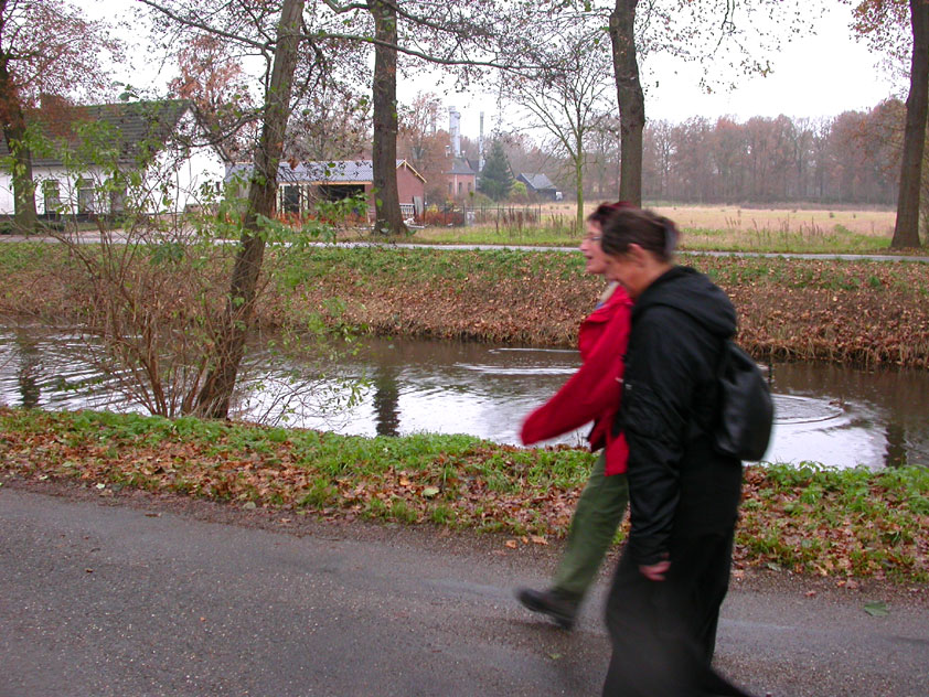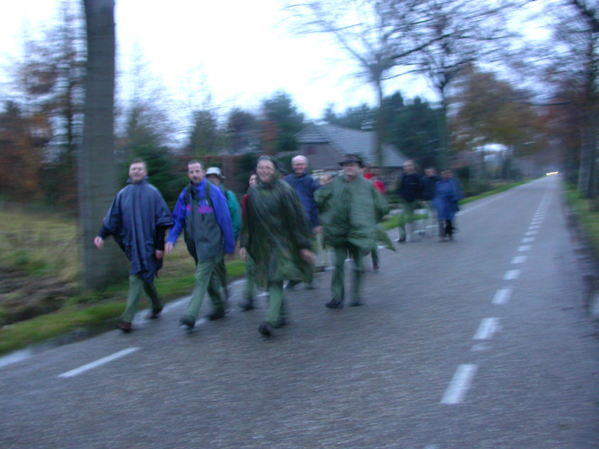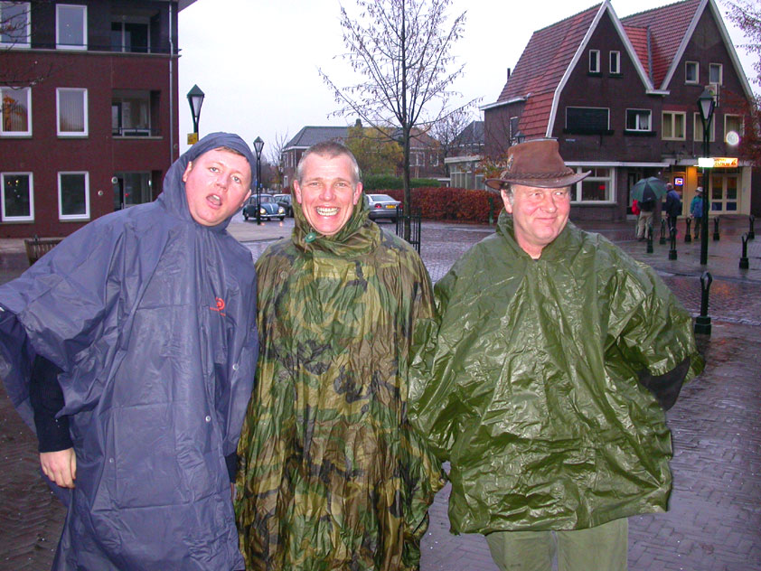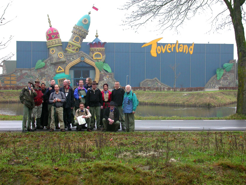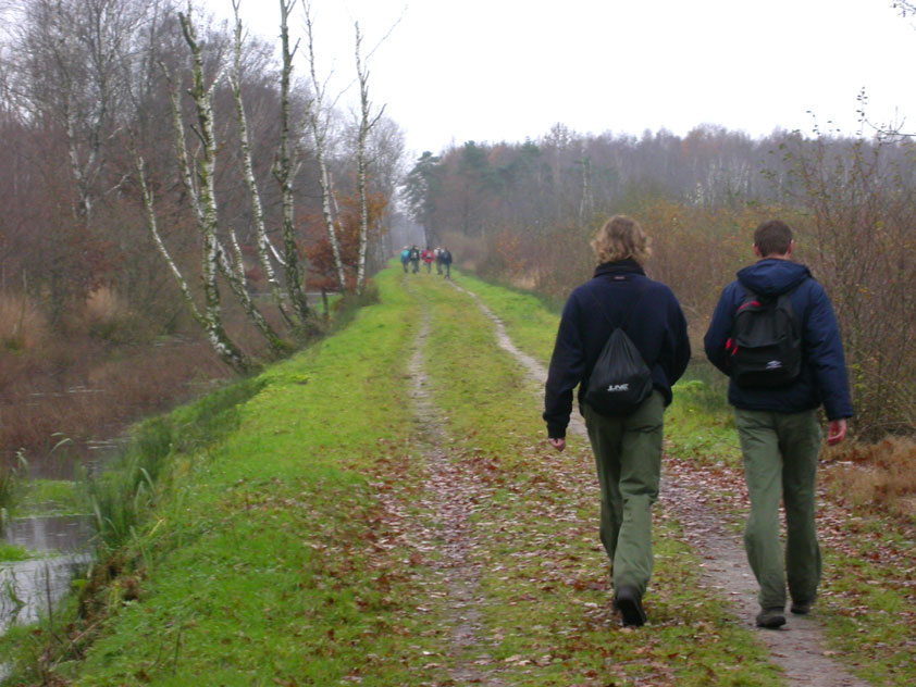 Good thing, that the marchleader immediately diverted us, by, shortly after leaving the cemetery, trekking straight through a meadow and (heavy ploughing) a cornfield, with a ditch for dessert. Odd, though, that he managed to cross this ditch without clamour or trouble. How different, from the last time. And this while this time's ditch really was larger and wider than last time's. But, excellent action, again, this to the great amusement of René in particular, who was having a great time anyway, because he was, at last, among people who dared to take the piss out of Schelden continuously. A little later, we stopped at Griendtsveen, or in any case, at its edge, at another war monument. It wasn't entirely clear to us, at that time, to what, apart from the Second World War in general, it referred, but it later turned out, whilst researching on the Net, that Griendtsveen had been evacuated during the war. Right after that monument, we made our way, by way of an ostensible dead end, into nature reserve Mariapeel. And there, the scales loudly fell from our eyes. For this peat moor, along with Overijssel around the Besthmener and Sprengen mounds (see the report on stage 7), really is the most beautiful bit of Holland that we, as Wandelsoc., have trod upon so far. Silent marshland with dying birches, rising like sticks from borderless water water (the tufaformations in Hypgnosis' Mono-lake of Pink Floyd's 'Wish you were here' pale in comparison), vast solitude and quiet, a wild goose here and there: the Peel (pronounce: pale) as primaeval area, beautiful bit of the past. Suddenly those books by Toon Kortooms came alive: the stories of 'Beekman en Beekman' and, for me personally in particular, 'De zwarte plak' ('black slice', meaning 'of peat', but the word 'plak' also is a synonym for 'henpecked', meaning the way the Dutch were by the Germans), enchanting tale about the resistance in Limburg during the Second World War, penned in 1948 already(!). Outdoor adventure, of the better kind. Those Germans must have been driven to insanity: anything can disappear in these swamps. Beautiful, and it therefore wasn't even just because of Pieter Spaan's Glühwein (that he started to pass around here - I'm telling you, that man, alcoholically speaking, has utterly proper ideas!) that, as soon as we were out of this marshland, we took a much contented break to catch our breath. Following that, Friend van Prijzen had predicted that what would come now was ugly again, but none of that came true during the first few kilometres - so that I could pleasantly pester him by, time and again, shouting "It's not all too bad, the landscape here, Bert!", from his wake. Better yet, I then finally succeeded in taking his photograph while he was urinating ("You're gonna hear from my lawyer!"). Although that was also the moment in which I had to admit we had finally ended up in ugliness. "Jay-sus, Bert, this place is so ugly!" This, then again, was totally drawn into the gaudily preposterous by the suddenly materializing themepark Toverland (Magic Land) (sim-sala-tastic). Reason for a nice group portrait, in front of it. And that wasn't the end of the fun: Sevenum is alive, with it. Because apart from the endless pig farms (with the roguish logo of sow production company 'Cofok' as hilarious summum, and Martin Gaus' dog school as runner up), that, indeed, do definitely not enhance the landscape with their sheds and degassing chimneys, there was the excellent Café De Sevewaeg, in Sevenum's town centre, that sported the 'peasoup bun' on its menu. Bewildered because of this, I decided to order it, along with my usual beverage array of milk (no butter- available again), orange juice, coffee and beer. And I'll be damned! You don't believe your eyes! A real sphereshaped bun of sourbread finequality, with a liftable lid, and below it, in it therefore, actually steaming peasoup! That my late grandma from Zeist would not have bettered, to boot! A delicious experience, which we were in dire need of, mind you. Because thereupon, because of a performance of a local theatre company in the backroom, all hell broke loose: we were roughly pushed over by massing locals, and when we had finally escaped them, we found ourselves outside, in the pouring rain. This then did produce funny pictures of ponchoed Socsillies, and otherwise, too, noone was about to get in a flurry because of it. Take, for instance, Albert. We hadn't well and true left Sevenum, prancing along down a treelined death trap (where, again, mongoloids passed us at ridiculous speeds; this seems to be habit in the Limburgian, because it happened during the previous episode too) or Albert said "Chielie! Got any cutlery on you?". "No!" "Yes you do, it's sticking out of your right pocket!" I'll say. The villain had, indeed, supplied me with a Sevewaegian set of utensils, without me noticing. And I wasn't the only victim. "Bert! Got a beer tankard on you, by chance?"