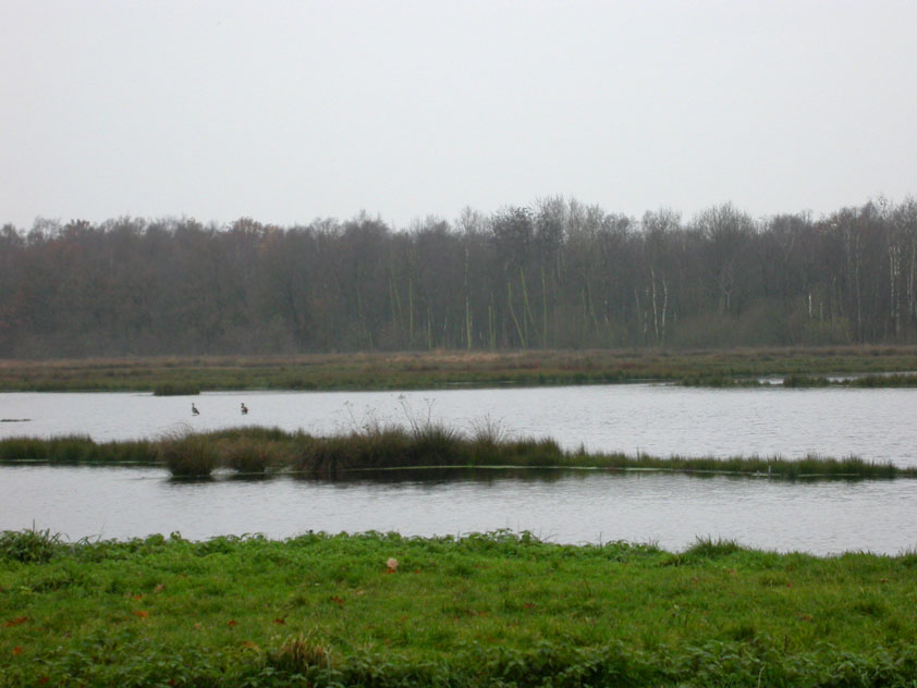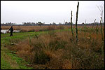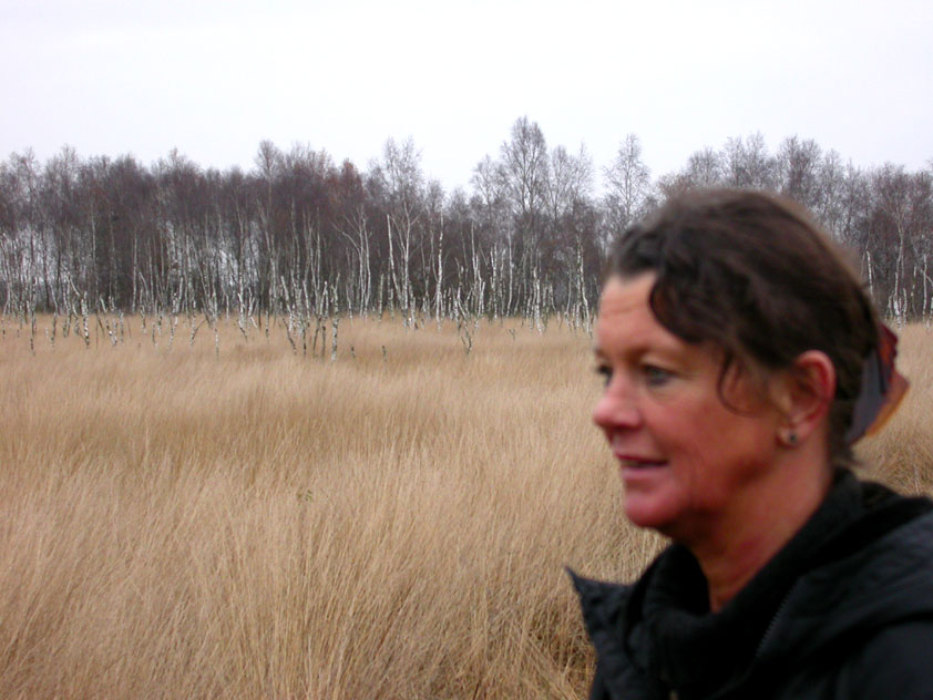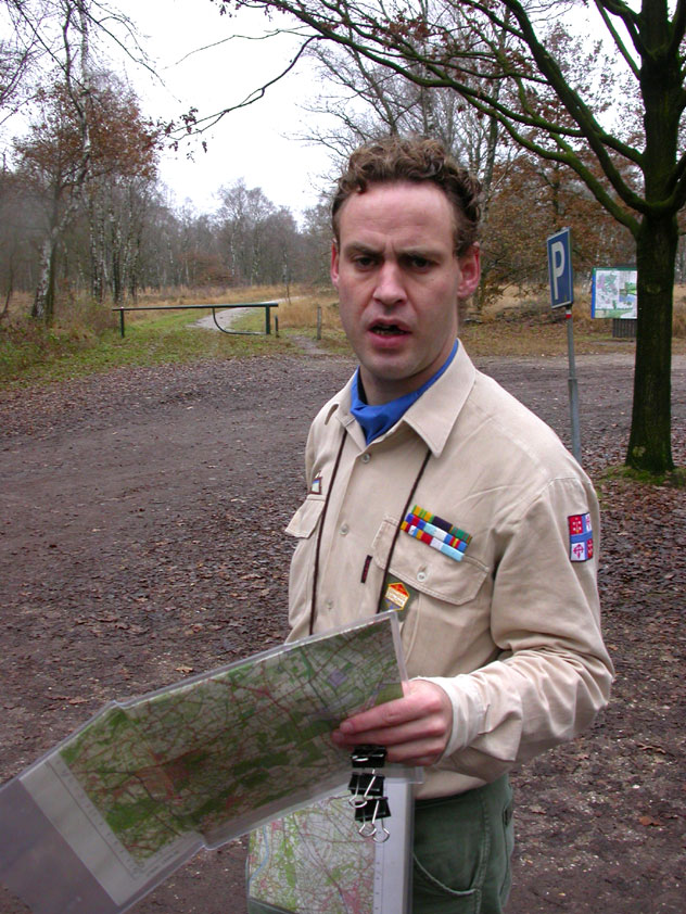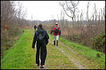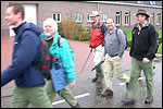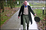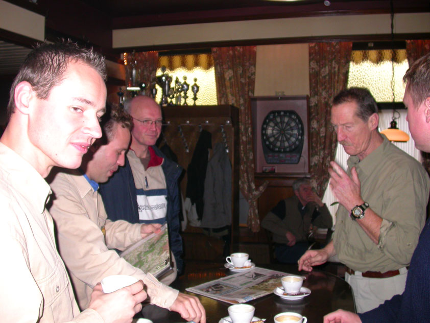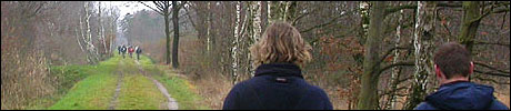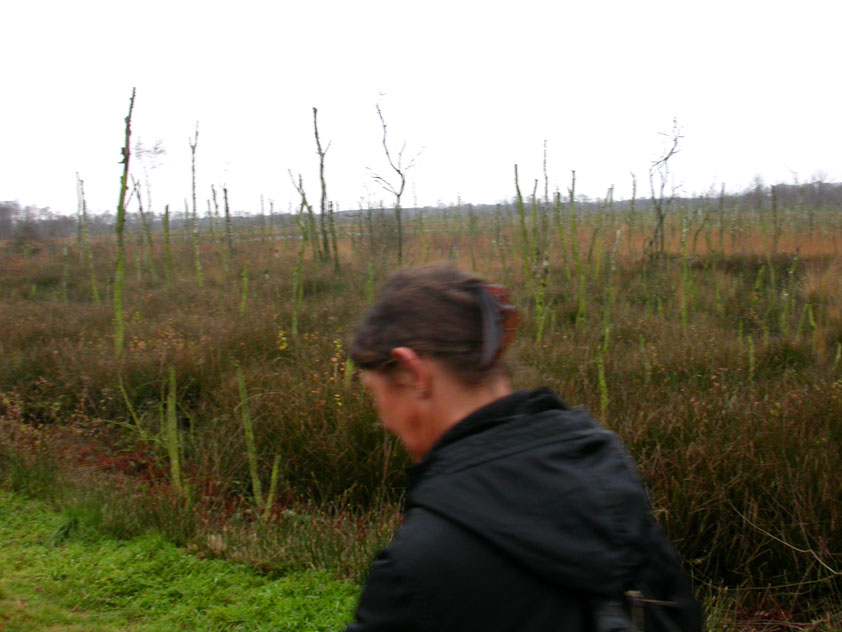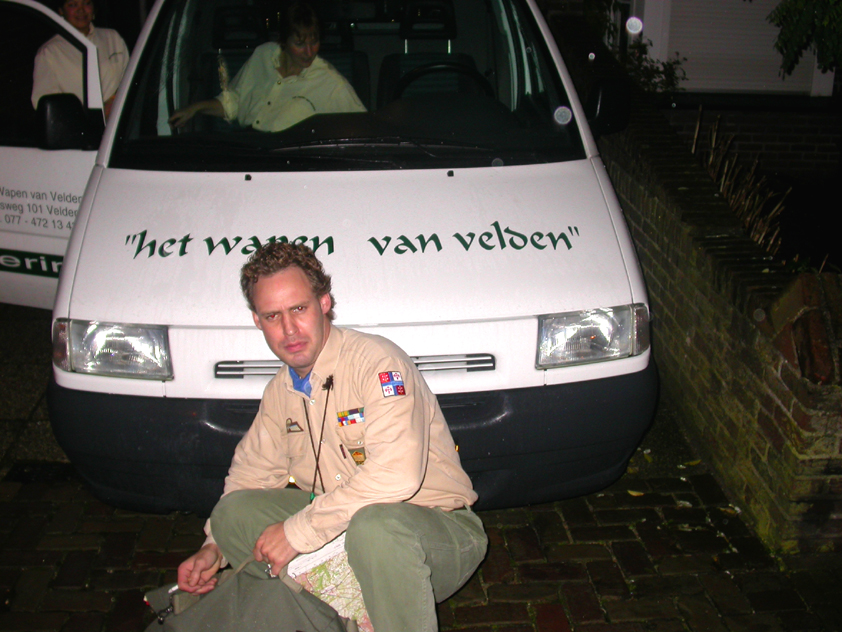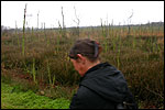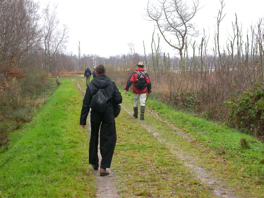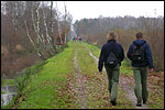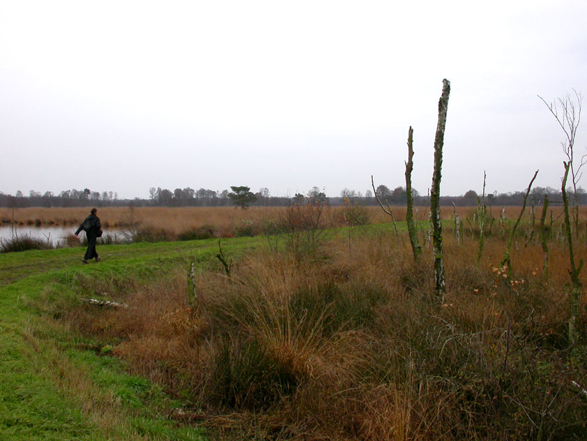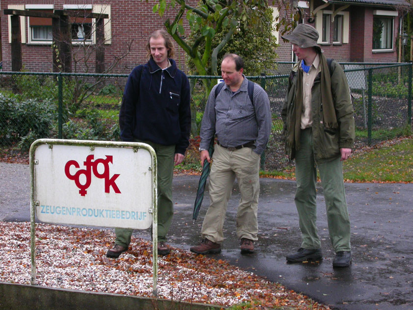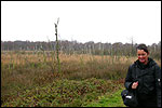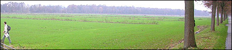 Good thing, that the marchleader immediately diverted us, by, shortly after leaving the cemetery, trekking straight through a meadow and (heavy ploughing) a cornfield, with a ditch for dessert. Odd, though, that he managed to cross this ditch without clamour or trouble. How different, from the last time. And this while this time's ditch really was larger and wider than last time's. But, excellent action, again, this to the great amusement of René in particular, who was having a great time anyway, because he was, at last, among people who dared to take the piss out of Schelden continuously. A little later, we stopped at Griendtsveen, or in any case, at its edge, at another war monument. It wasn't entirely clear to us, at that time, to what, apart from the Second World War in general, it referred, but it later turned out, whilst researching on the Net, that Griendtsveen had been evacuated during the war. Right after that monument, we made our way, by way of an ostensible dead end, into nature reserve Mariapeel. And there, the scales loudly fell from our eyes. For this peat moor, along with Overijssel around the Besthmener and Sprengen mounds (see the report on stage 7), really is the most beautiful bit of Holland that we, as Wandelsoc., have trod upon so far. Silent marshland with dying birches, rising like sticks from borderless water water (the tufaformations in Hypgnosis' Mono-lake of Pink Floyd's 'Wish you were here' pale in comparison), vast solitude and quiet, a wild goose here and there: the Peel (pronounce: pale) as primaeval area, beautiful bit of the past. Suddenly those books by Toon Kortooms came alive: the stories of 'Beekman en Beekman' and, for me personally in particular, 'De zwarte plak' ('black slice', meaning 'of peat', but the word 'plak' also is a synonym for 'henpecked', meaning the way the Dutch were by the Germans), enchanting tale about the resistance in Limburg during the Second World War, penned in 1948 already(!). Outdoor adventure, of the better kind. Those Germans must have been driven to insanity: anything can disappear in these swamps. Beautiful, and it therefore wasn't even just because of Pieter Spaan's Glühwein (that he started to pass around here - I'm telling you, that man, alcoholically speaking, has utterly proper ideas!) that, as soon as we were out of this marshland, we took a much contented break to catch our breath. Following that, Friend van Prijzen had predicted that what would come now was ugly again, but none of that came true during the first few kilometres - so that I could pleasantly pester him by, time and again, shouting "It's not all too bad, the landscape here, Bert!", from his wake. Better yet, I then finally succeeded in taking his photograph while he was urinating ("You're gonna hear from my lawyer!"). Although that was also the moment in which I had to admit we had finally ended up in ugliness. "Jay-sus, Bert, this place is so ugly!" This, then again, was totally drawn into the gaudily preposterous by the suddenly materializing themepark Toverland (Magic Land) (sim-sala-tastic). Reason for a nice group portrait, in front of it. And that wasn't the end of the fun: Sevenum is alive, with it. Because apart from the endless pig farms (with the roguish logo of sow production company 'Cofok' as hilarious summum, and Martin Gaus' dog school as runner up), that, indeed, do definitely not enhance the landscape with their sheds and degassing chimneys, there was the excellent Café De Sevewaeg, in Sevenum's town centre, that sported the 'peasoup bun' on its menu. Bewildered because of this, I decided to order it, along with my usual beverage array of milk (no butter- available again), orange juice, coffee and beer. And I'll be damned! You don't believe your eyes! A real sphereshaped bun of sourbread finequality, with a liftable lid, and below it, in it therefore, actually steaming peasoup! That my late grandma from Zeist would not have bettered, to boot! A delicious experience, which we were in dire need of, mind you. Because thereupon, because of a performance of a local theatre company in the backroom, all hell broke loose: we were roughly pushed over by massing locals, and when we had finally escaped them, we found ourselves outside, in the pouring rain. This then did produce funny pictures of ponchoed Socsillies, and otherwise, too, noone was about to get in a flurry because of it. Take, for instance, Albert. We hadn't well and true left Sevenum, prancing along down a treelined death trap (where, again, mongoloids passed us at ridiculous speeds; this seems to be habit in the Limburgian, because it happened during the previous episode too) or Albert said "Chielie! Got any cutlery on you?". "No!" "Yes you do, it's sticking out of your right pocket!" I'll say. The villain had, indeed, supplied me with a Sevewaegian set of utensils, without me noticing. And I wasn't the only victim. "Bert! Got a beer tankard on you, by chance?"