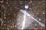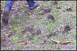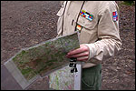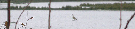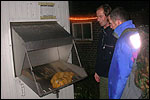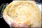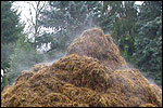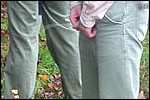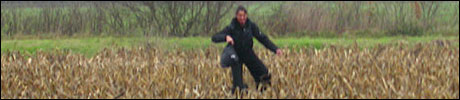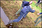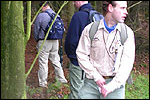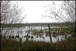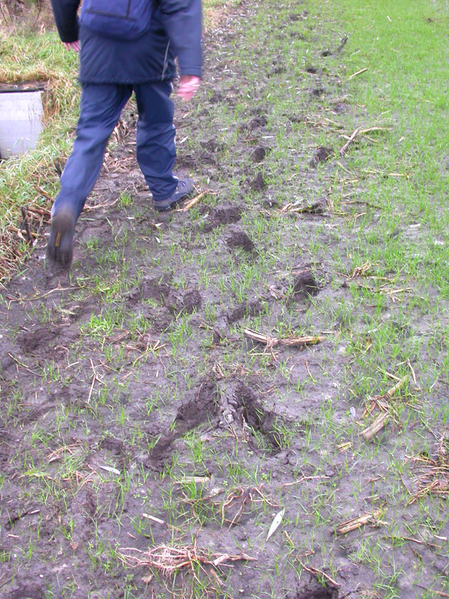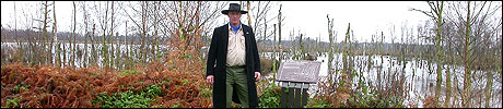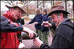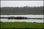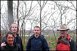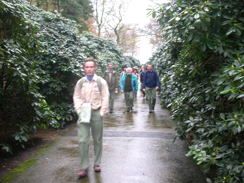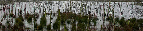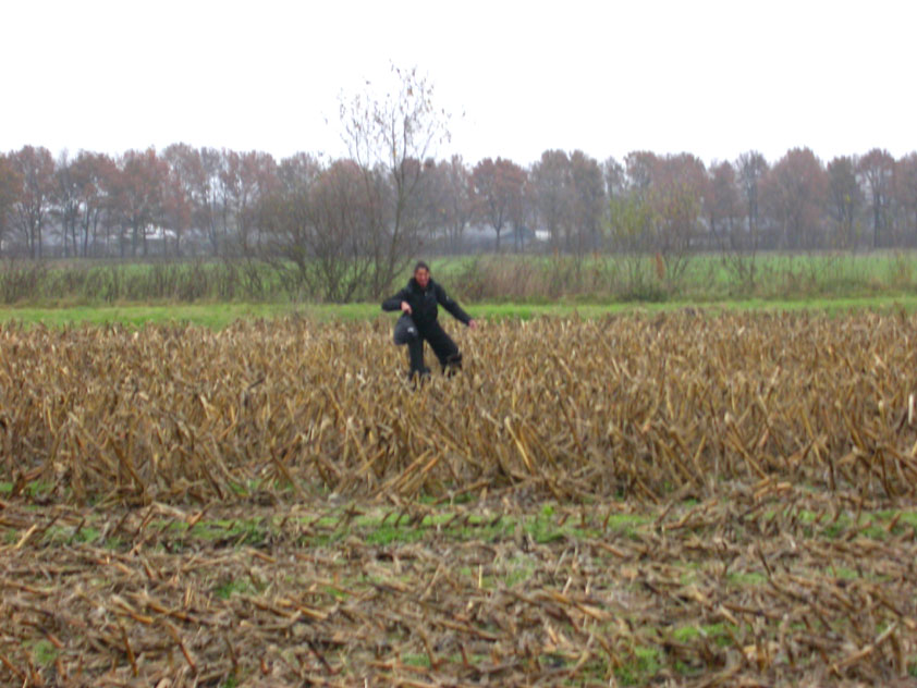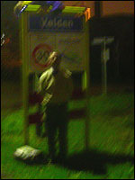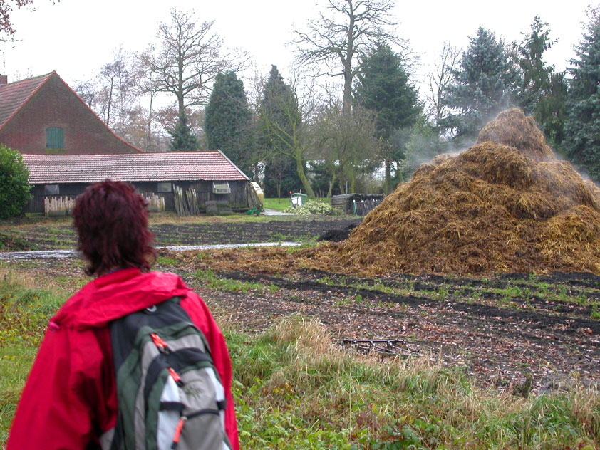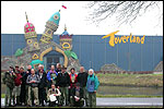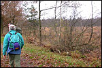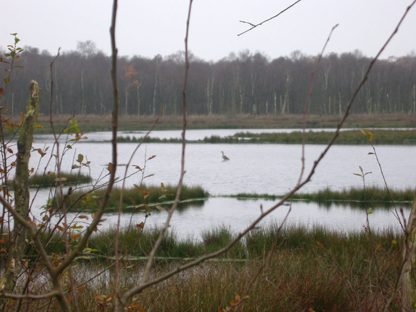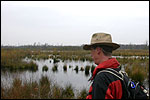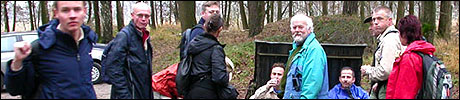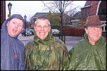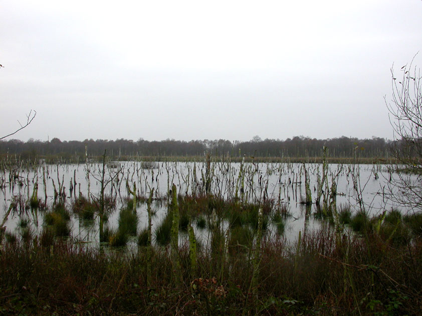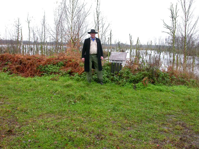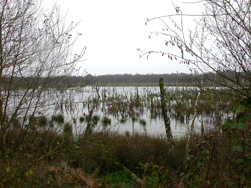 Good thing, that the marchleader immediately diverted us, by, shortly after leaving the cemetery, trekking straight through a meadow and (heavy ploughing) a cornfield, with a ditch for dessert. Odd, though, that he managed to cross this ditch without clamour or trouble. How different, from the last time. And this while this time's ditch really was larger and wider than last time's. But, excellent action, again, this to the great amusement of René in particular, who was having a great time anyway, because he was, at last, among people who dared to take the piss out of Schelden continuously. A little later, we stopped at Griendtsveen, or in any case, at its edge, at another war monument. It wasn't entirely clear to us, at that time, to what, apart from the Second World War in general, it referred, but it later turned out, whilst researching on the Net, that Griendtsveen had been evacuated during the war. Right after that monument, we made our way, by way of an ostensible dead end, into nature reserve Mariapeel. And there, the scales loudly fell from our eyes. For this peat moor, along with Overijssel around the Besthmener and Sprengen mounds (see the report on stage 7), really is the most beautiful bit of Holland that we, as Wandelsoc., have trod upon so far. Silent marshland with dying birches, rising like sticks from borderless water water (the tufaformations in Hypgnosis' Mono-lake of Pink Floyd's 'Wish you were here' pale in comparison), vast solitude and quiet, a wild goose here and there: the Peel (pronounce: pale) as primaeval area, beautiful bit of the past. Suddenly those books by Toon Kortooms came alive: the stories of 'Beekman en Beekman' and, for me personally in particular, 'De zwarte plak' ('black slice', meaning 'of peat', but the word 'plak' also is a synonym for 'henpecked', meaning the way the Dutch were by the Germans), enchanting tale about the resistance in Limburg during the Second World War, penned in 1948 already(!). Outdoor adventure, of the better kind. Those Germans must have been driven to insanity: anything can disappear in these swamps. Beautiful, and it therefore wasn't even just because of Pieter Spaan's Glühwein (that he started to pass around here - I'm telling you, that man, alcoholically speaking, has utterly proper ideas!) that, as soon as we were out of this marshland, we took a much contented break to catch our breath. Following that, Friend van Prijzen had predicted that what would come now was ugly again, but none of that came true during the first few kilometres - so that I could pleasantly pester him by, time and again, shouting "It's not all too bad, the landscape here, Bert!", from his wake. Better yet, I then finally succeeded in taking his photograph while he was urinating ("You're gonna hear from my lawyer!"). Although that was also the moment in which I had to admit we had finally ended up in ugliness. "Jay-sus, Bert, this place is so ugly!" This, then again, was totally drawn into the gaudily preposterous by the suddenly materializing themepark Toverland (Magic Land) (sim-sala-tastic). Reason for a nice group portrait, in front of it. And that wasn't the end of the fun: Sevenum is alive, with it. Because apart from the endless pig farms (with the roguish logo of sow production company 'Cofok' as hilarious summum, and Martin Gaus' dog school as runner up), that, indeed, do definitely not enhance the landscape with their sheds and degassing chimneys, there was the excellent Café De Sevewaeg, in Sevenum's town centre, that sported the 'peasoup bun' on its menu. Bewildered because of this, I decided to order it, along with my usual beverage array of milk (no butter- available again), orange juice, coffee and beer. And I'll be damned! You don't believe your eyes! A real sphereshaped bun of sourbread finequality, with a liftable lid, and below it, in it therefore, actually steaming peasoup! That my late grandma from Zeist would not have bettered, to boot! A delicious experience, which we were in dire need of, mind you. Because thereupon, because of a performance of a local theatre company in the backroom, all hell broke loose: we were roughly pushed over by massing locals, and when we had finally escaped them, we found ourselves outside, in the pouring rain. This then did produce funny pictures of ponchoed Socsillies, and otherwise, too, noone was about to get in a flurry because of it. Take, for instance, Albert. We hadn't well and true left Sevenum, prancing along down a treelined death trap (where, again, mongoloids passed us at ridiculous speeds; this seems to be habit in the Limburgian, because it happened during the previous episode too) or Albert said "Chielie! Got any cutlery on you?". "No!" "Yes you do, it's sticking out of your right pocket!" I'll say. The villain had, indeed, supplied me with a Sevewaegian set of utensils, without me noticing. And I wasn't the only victim. "Bert! Got a beer tankard on you, by chance?"
