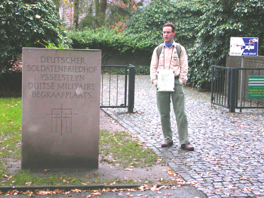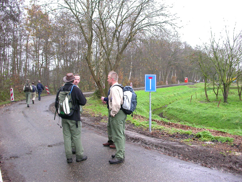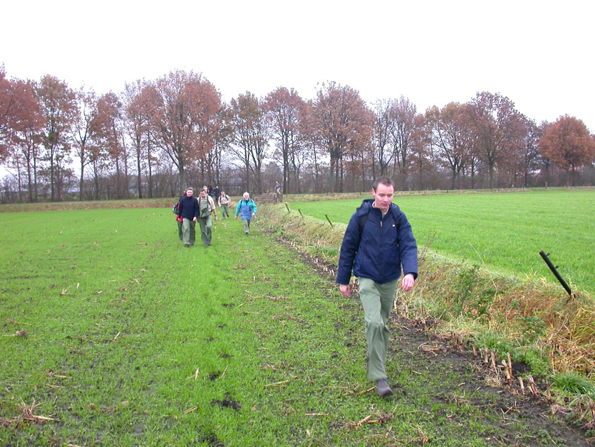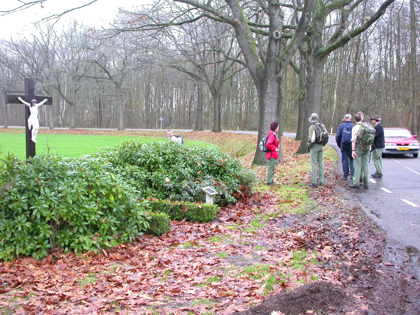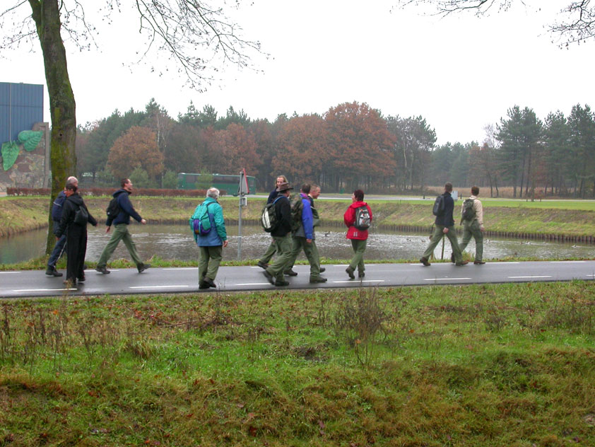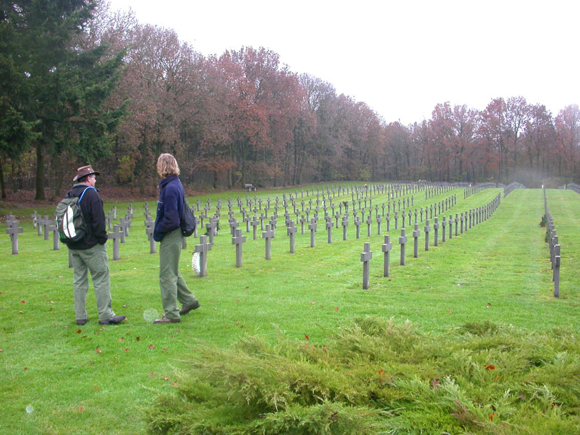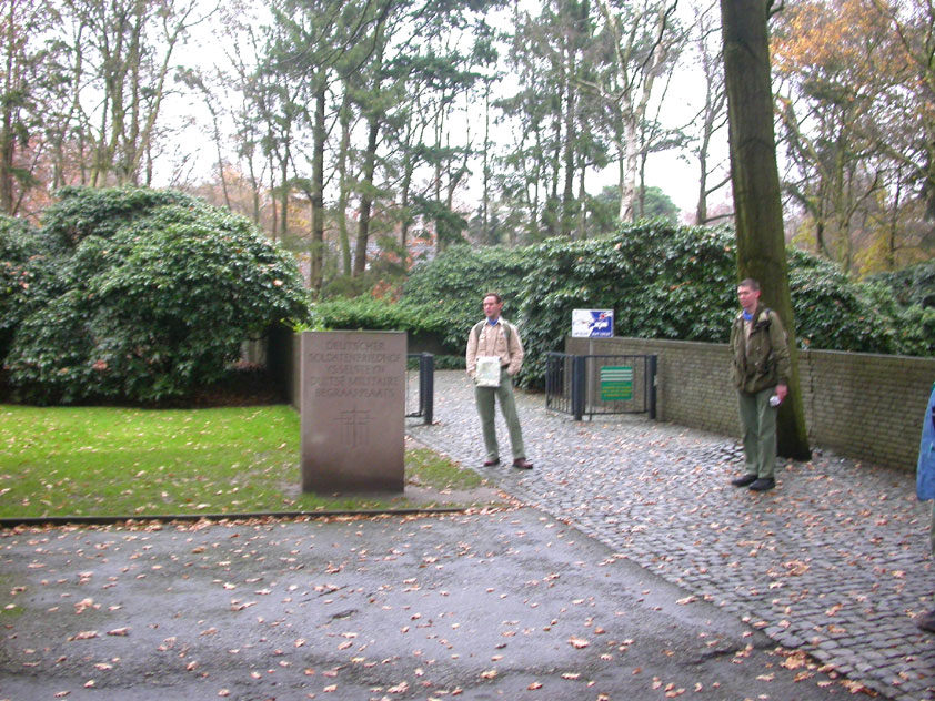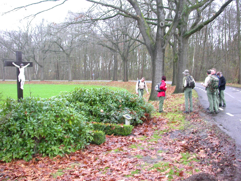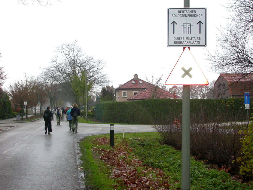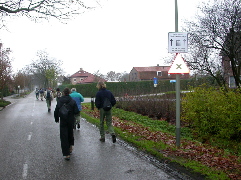 November 28th, 2004 Across the Netherlands from Top to Toe: Ysselsteyn-Velden The scales, from your eyes. Which was to be expected. Every Dutchman who's undergone a naturalization course or primary school, knows that Limburg is a pretty province. So that today would become a nice stage of 'Across the Netherlands from Top to Toe', was obvious. This had been a different affair the last time over. But just like that last time, we were again surprised, nonetheless, by the extent to which that beauty made itself felt. We, this time, were Henk van der Schelden, Marco van Zijntergen, Albert van Geyningen, Raymond de Gisser, Lourens Dinger, Fred Regts, Jan Middelkoop, Barend Rijkman, Dick van Kuppevelt, Anita Willemsen, Bert van Prijzen, Marjon van Dijk, Pieter Spaan, the newly recruited Securicor-colleague of Henk and Raymond's, René van de Bilt, and yours truly. And because, as ever, we started where we'd ended the last time over, we did so in the De Peel Inn, where we were again warmly welcomed by the excellent staff, that, this time, didn't supply us with food and drinks, but with coffee. Which didn't mean that we didn't eat or drink, because Anita brought along apple pie (she'd namely just had her birthday, on November 2nd) and Pieter immediately began distributing Stroh rum. Too merry for our own good, we therefore set off. God knew whereto, of course, or, better yet, Schèlden was supposed to know whereto: to Velden, namely. But before we were there, lots of things happened. And this immediately had a somewhat sobering effect. Because the first thing that happened (gift, by absence, of Peter Weij's, who had had this left for plan, as an extension of the previous endeavour, along the Peel-Raamstelling) was the Deutsche Soldatenfriedhof just outside Ysselsteyn.