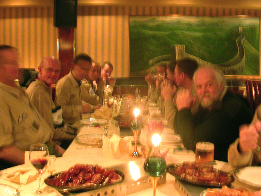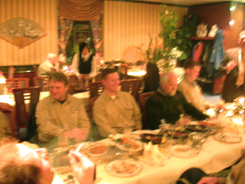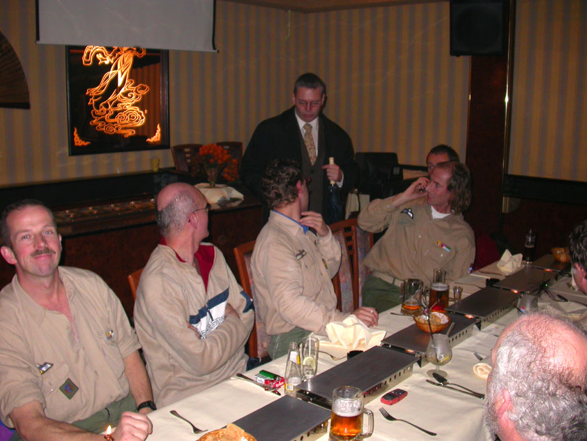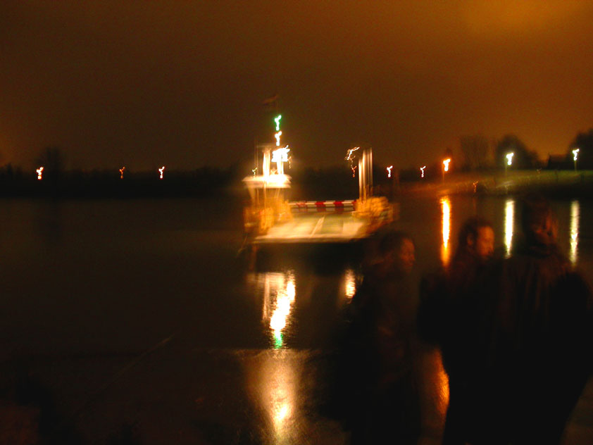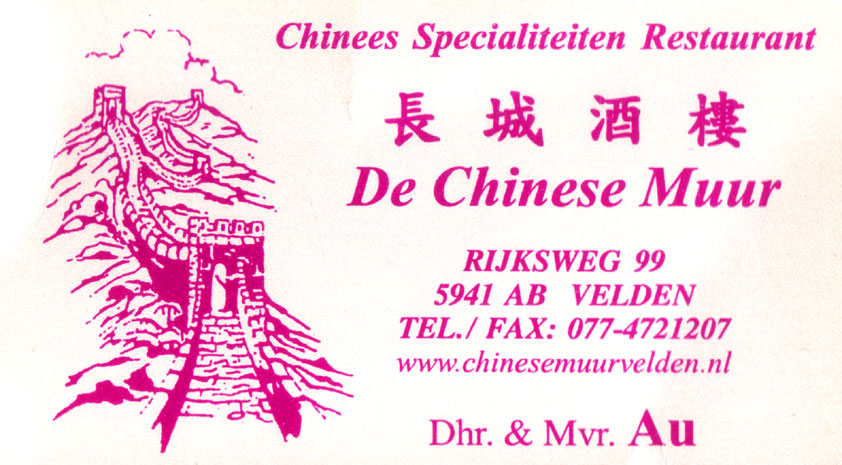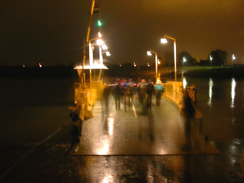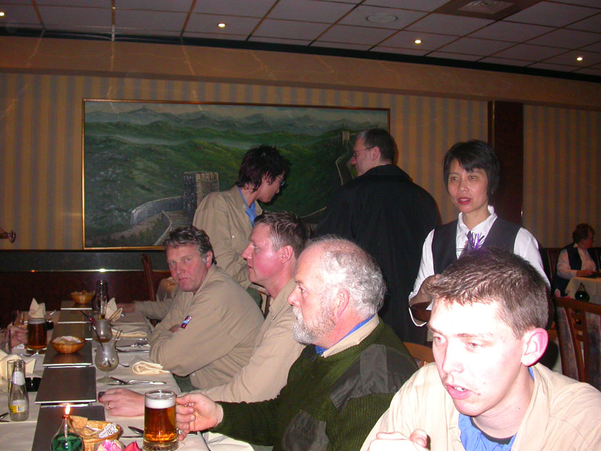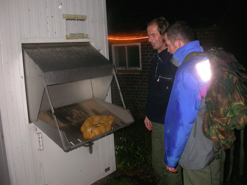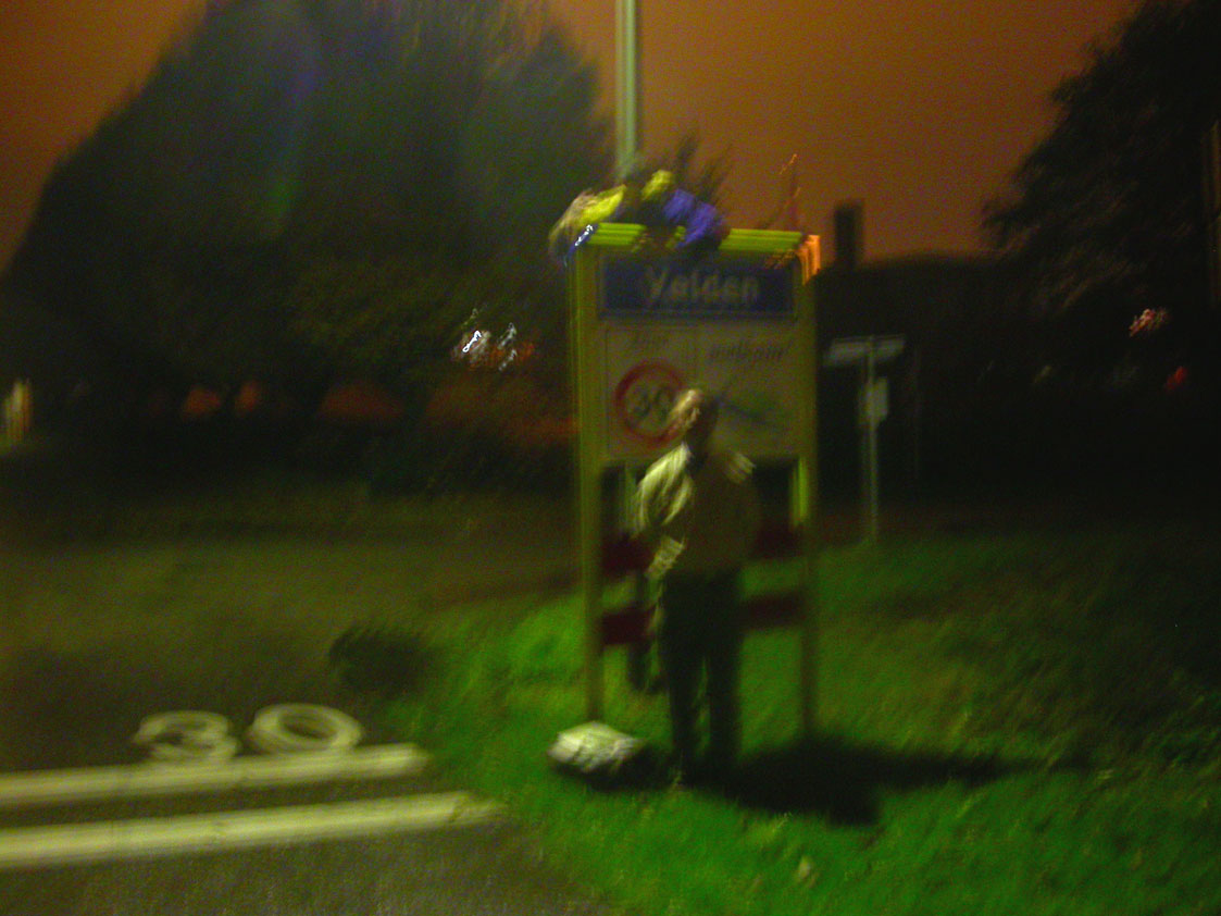 Not yet recovered from this sottery, we ran, just before the ferry to Velden, into a potatoe-machine! Dumbfounded, Marco van Zijntergen and Albert decided to activate the machine, to see what would it would produce. This turned out to be, for relatively little money, a sizable bag of potatoes! Bloody wonderful, and reason for Albert to happily carry it home. Well done, son. The ferry to Velden, thereupon, turned out to be the source of so much fun, in the pitchblack dark and pouring rain, that we spontaneously forgot about that rain. And this continued, as we tore into the village centre, loudly singing the Wandelsoc.-song. It must have been a terrifying racket. In Restaurant 'De Chinese Muur' (Chinese Wall) we then hit the chow, and it was satisfactory. Because the quality was excellent, better for sure, than in the wokrestaurant of the same name in Plasmolen, where we had, to please Marco Neumann (who had, for march upon march, been nagging about a Chinese meal), dined at the end of leg 12. This Wall too, we therefore decided to level, to please Neumann, but that, in hindsight, turned out to be a pearl, before the swine: because Neumann wasn't with us at all, today. Dog breath (but oh, he did miss the utterly pleasant waitresses, his own fault)! Who was there, or in any case arrived there, was Ronald Fischer. He had not marched along at all today (nor had he the time before, by the way). This because he had scored a 22 year old girlfriend, and that girlfriend was Article 31 reformed, so that meant church twice on Sundays, and no marching for him. But it also had its advantages, and this was what Fischer had come to show us. "Guys, I'm really only here to show you my dick. Y'all really have no idea what a hard time it has with a girlfriend like that! Up yours!"