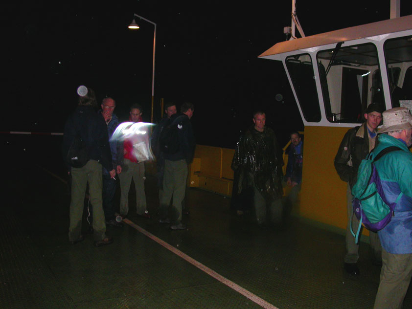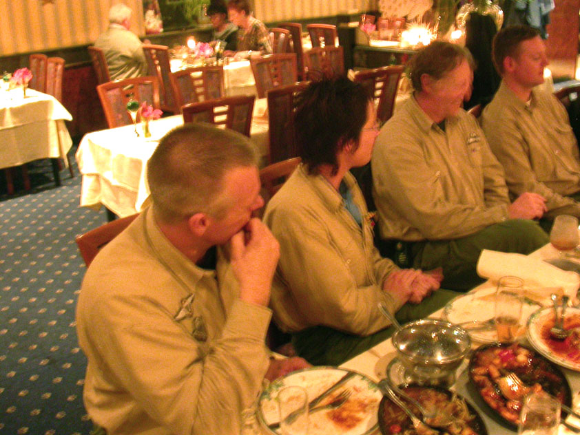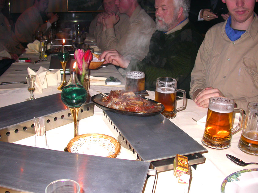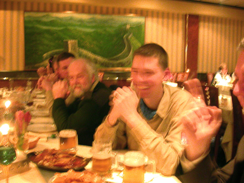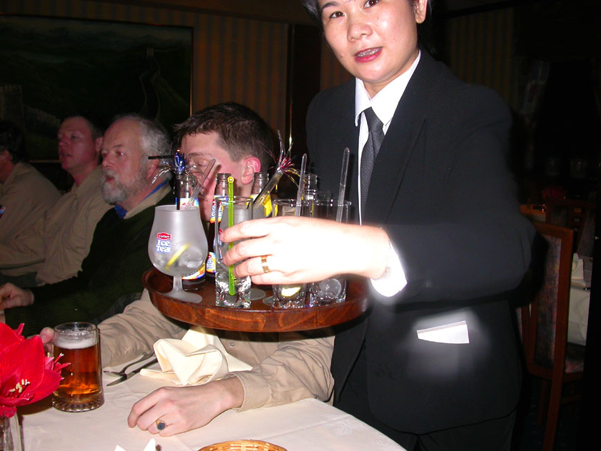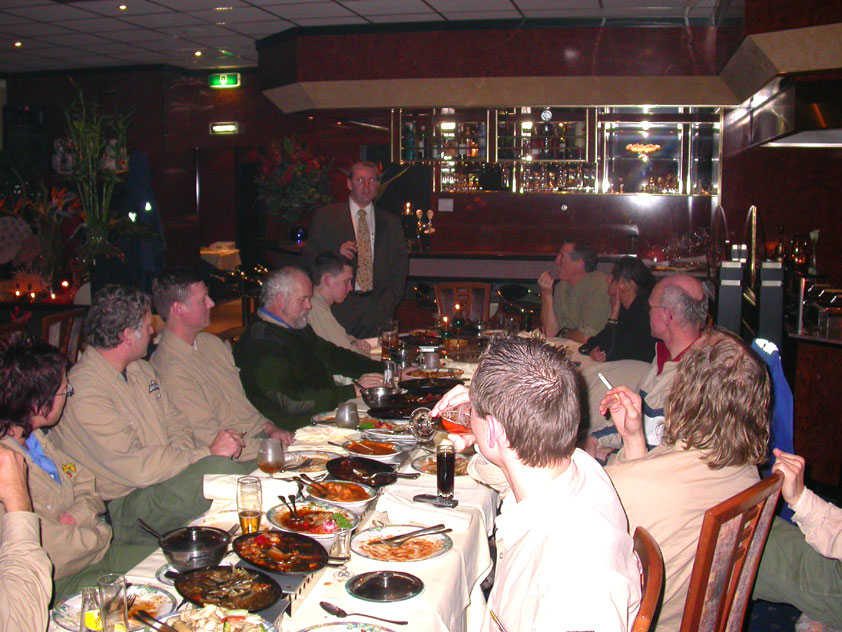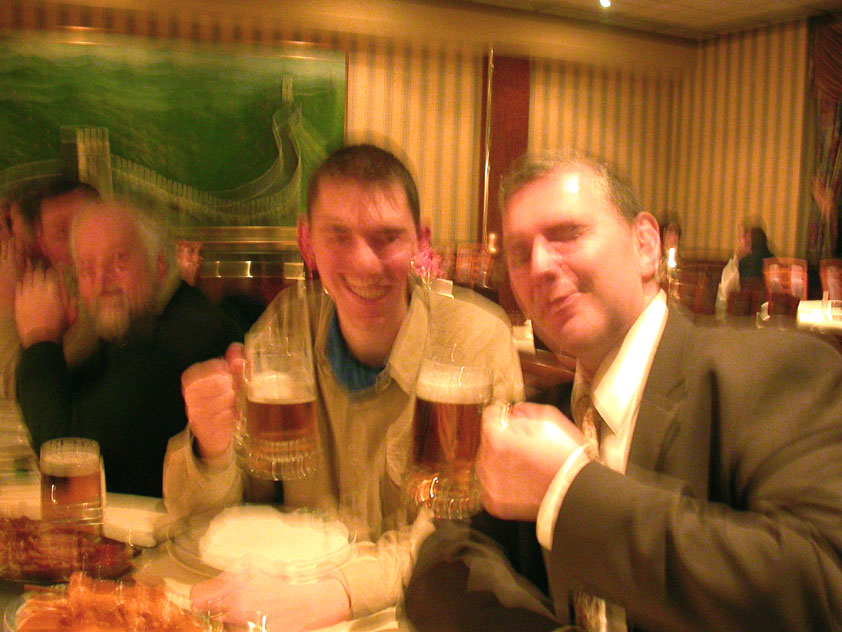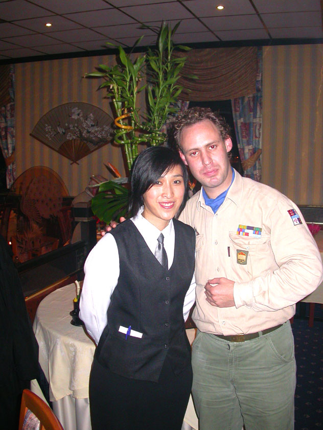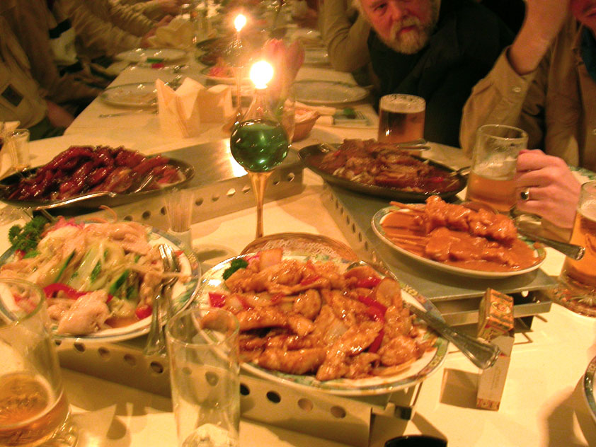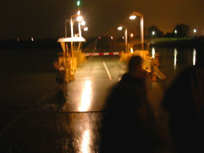 Not yet recovered from this sottery, we ran, just before the ferry to Velden, into a potatoe-machine! Dumbfounded, Marco van Zijntergen and Albert decided to activate the machine, to see what would it would produce. This turned out to be, for relatively little money, a sizable bag of potatoes! Bloody wonderful, and reason for Albert to happily carry it home. Well done, son. The ferry to Velden, thereupon, turned out to be the source of so much fun, in the pitchblack dark and pouring rain, that we spontaneously forgot about that rain. And this continued, as we tore into the village centre, loudly singing the Wandelsoc.-song. It must have been a terrifying racket. In Restaurant 'De Chinese Muur' (Chinese Wall) we then hit the chow, and it was satisfactory. Because the quality was excellent, better for sure, than in the wokrestaurant of the same name in Plasmolen, where we had, to please Marco Neumann (who had, for march upon march, been nagging about a Chinese meal), dined at the end of leg 12. This Wall too, we therefore decided to level, to please Neumann, but that, in hindsight, turned out to be a pearl, before the swine: because Neumann wasn't with us at all, today. Dog breath (but oh, he did miss the utterly pleasant waitresses, his own fault)! Who was there, or in any case arrived there, was Ronald Fischer. He had not marched along at all today (nor had he the time before, by the way). This because he had scored a 22 year old girlfriend, and that girlfriend was Article 31 reformed, so that meant church twice on Sundays, and no marching for him. But it also had its advantages, and this was what Fischer had come to show us. "Guys, I'm really only here to show you my dick. Y'all really have no idea what a hard time it has with a girlfriend like that! Up yours!"
