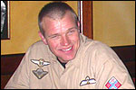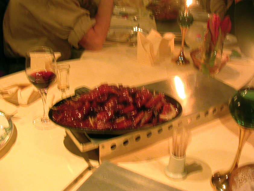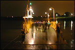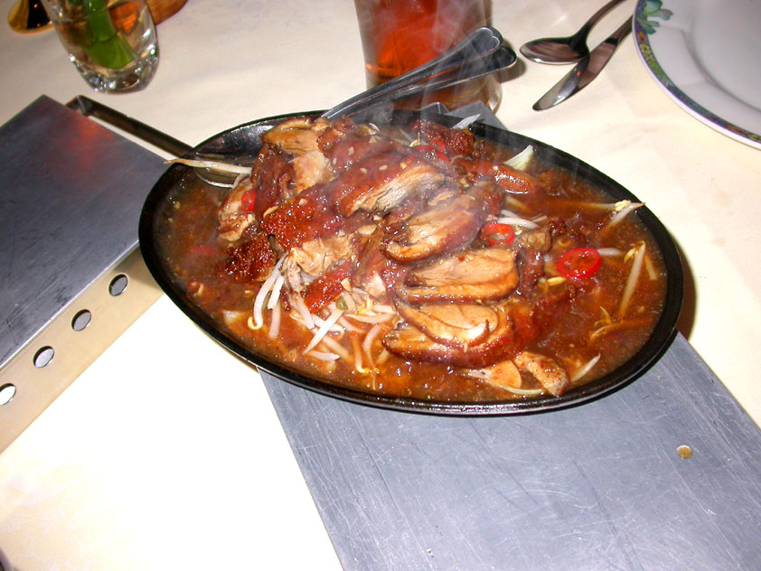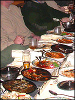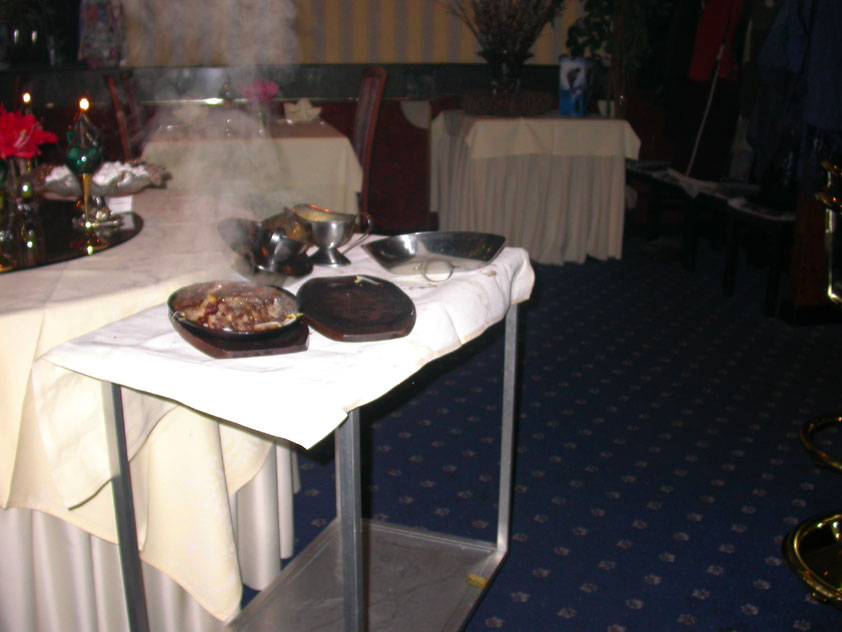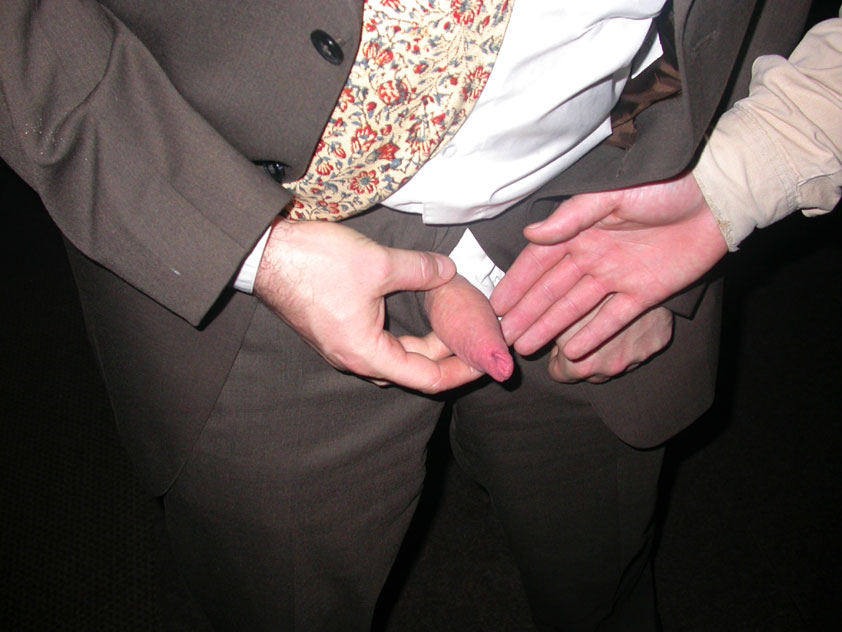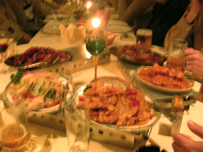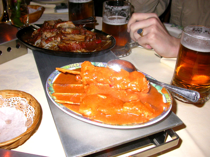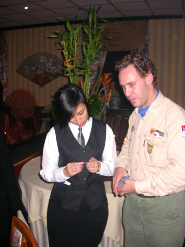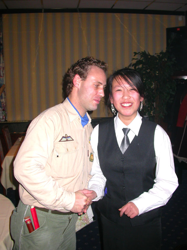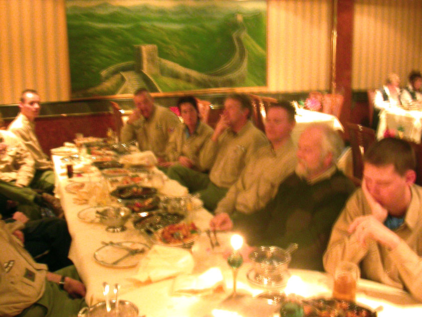 Not yet recovered from this sottery, we ran, just before the ferry to Velden, into a potatoe-machine! Dumbfounded, Marco van Zijntergen and Albert decided to activate the machine, to see what would it would produce. This turned out to be, for relatively little money, a sizable bag of potatoes! Bloody wonderful, and reason for Albert to happily carry it home. Well done, son. The ferry to Velden, thereupon, turned out to be the source of so much fun, in the pitchblack dark and pouring rain, that we spontaneously forgot about that rain. And this continued, as we tore into the village centre, loudly singing the Wandelsoc.-song. It must have been a terrifying racket. In Restaurant 'De Chinese Muur' (Chinese Wall) we then hit the chow, and it was satisfactory. Because the quality was excellent, better for sure, than in the wokrestaurant of the same name in Plasmolen, where we had, to please Marco Neumann (who had, for march upon march, been nagging about a Chinese meal), dined at the end of leg 12. This Wall too, we therefore decided to level, to please Neumann, but that, in hindsight, turned out to be a pearl, before the swine: because Neumann wasn't with us at all, today. Dog breath (but oh, he did miss the utterly pleasant waitresses, his own fault)! Who was there, or in any case arrived there, was Ronald Fischer. He had not marched along at all today (nor had he the time before, by the way). This because he had scored a 22 year old girlfriend, and that girlfriend was Article 31 reformed, so that meant church twice on Sundays, and no marching for him. But it also had its advantages, and this was what Fischer had come to show us. "Guys, I'm really only here to show you my dick. Y'all really have no idea what a hard time it has with a girlfriend like that! Up yours!"