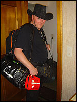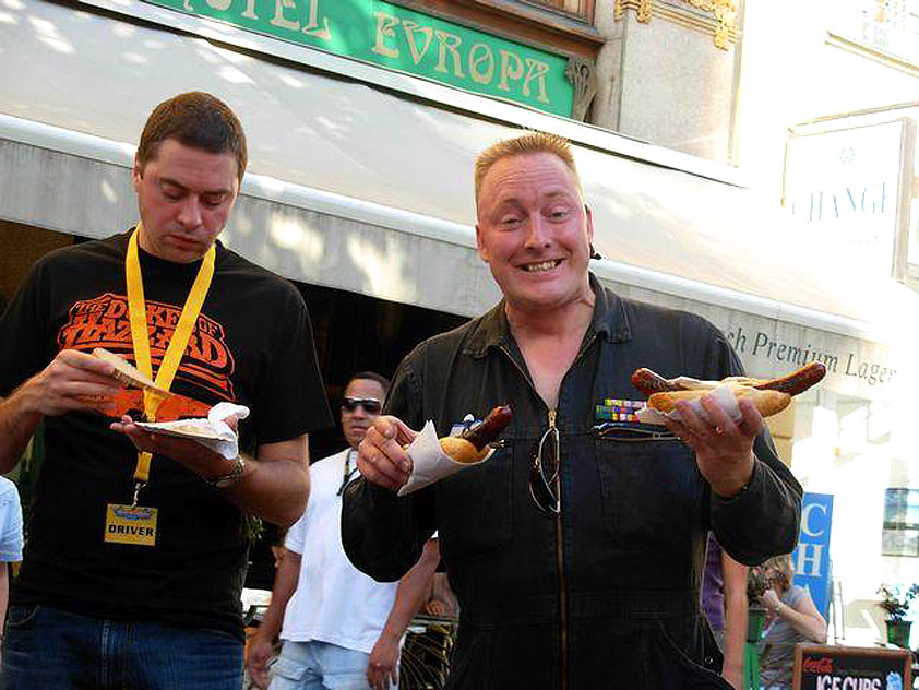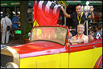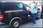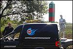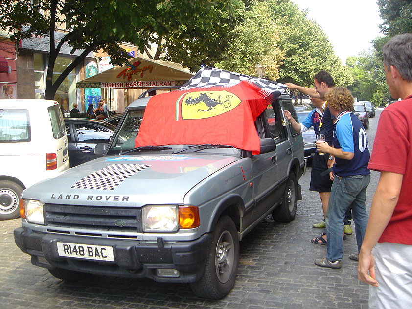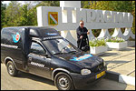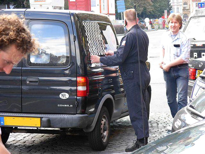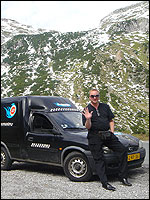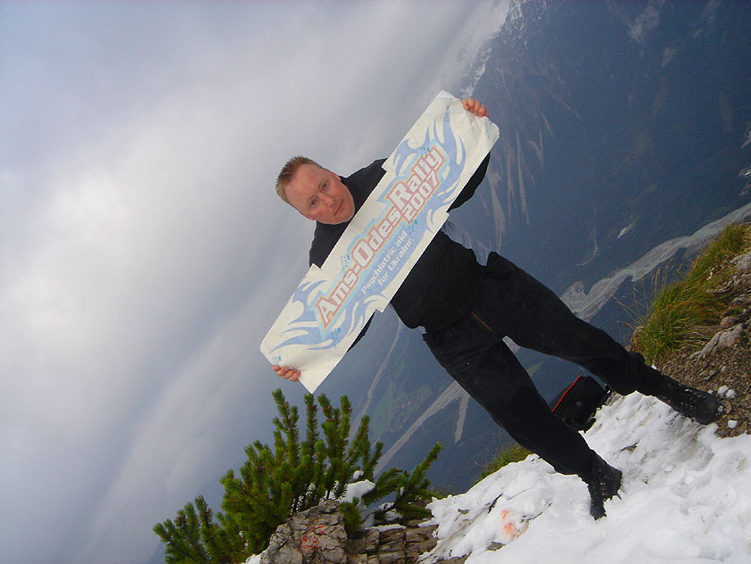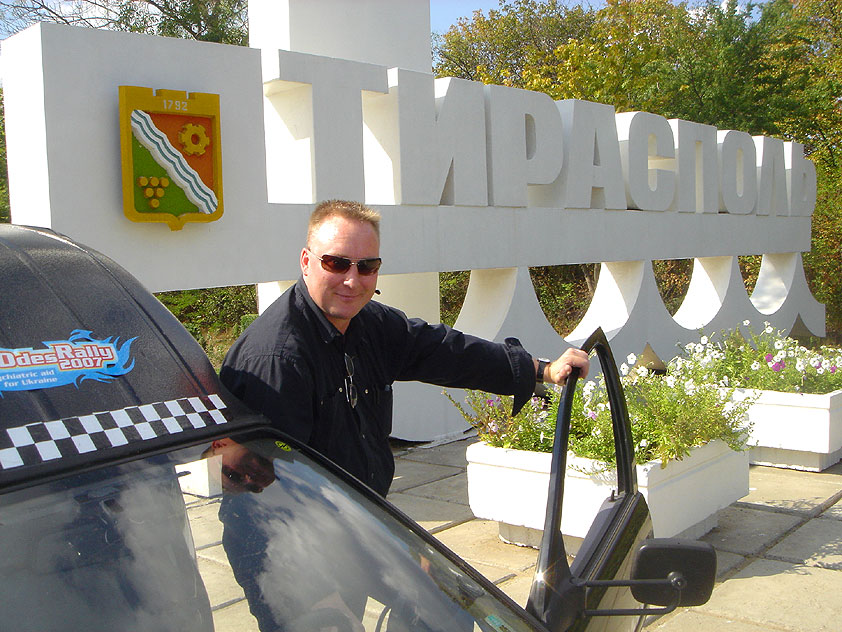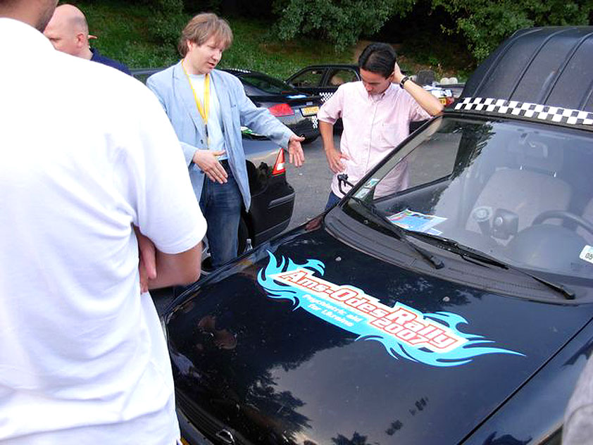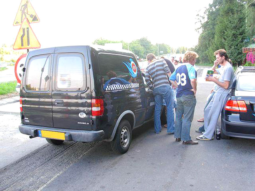 September 9th, 2007 Ams-Odes Rally 2007 "What on earth are you doing, Ed?" "Playing, with the wind." High time, for my taxiboss Edwin Gorter to relax some. Like any true enterpeneur he works like a madman, to keep his company afloat and, if possible, make it flourish. He does this by, amongst other things, taking a lot of shifts himself - after all, he does not have to pay himself. This then leaves little time for office work, which has to be done too though. Proper recipe for red eyes and an ashen grey countenance. So when my regular business partner, Adrianus Warmenhoven, informs me that he will take part in a rally, I reply "Cool! Need any copilots?", he says "No, but why don't you take your own car?", I decide to do just that and Ed then asks if he can be my copilot, I think that's a fine idea. All the more so, because Ed speaks Russian and is a teetotaller. That the Russian can come in handy is obvious: the rally will go from Amsterdam to Odessa, in Ukraine. Which used to be Soviet Union, so they speak Russian there yeah. Da. The teetotalling will turn out to be handy for an entirely different reason. The rally rules namely sport a three-tier classification. Getting to the finish town of the four race days as early as possible is tier 1. But the €700,- entry fee not only renders participation, a hotel and an evening meal in a restaurant booked in advance, for each of the racing days, but also means VIP-access to a nightclub. And being in that nightclub for as long as possible is tier 2. Each team must, at that, appoint a 'designated driver' for every morning AFTER the party in the nightclub, who will then be tested for alcohol prior to departure. Alcoholtest positive? Then the team can't leave and will have to wait until the 'designated driver' tests negative again. So that's handy, because, for Team Taxi Adriaan', I can appoint Ed 'designated driver' for four days, and proceed to rake in the points at the party as 'designated drinker' meself. Great. Tier 3 is the amount of money raised, for the charity. The charity is the Sputnik Foundation (Stichting Spoetnik), which renders humanitarian aid to Ukraine. Stichting Spoetnik does this through a multitude of projects. The project the Amsterdam-Odessa Rally 2007 has linked itself to, is support for a specific psychiatric hospital. Stichting Spoetnik's philosophy is not to wire money, but to actively deliver goods. These, it buys on the spot, or collects, in Holland. And so the stickers read: 'Ams-Odes Rally 2007, Psychiatric Aid for Ukraine'. Stickers that we, by the by, will not yet affix to our cars for a while. You see, we leave on the same day the Quote Rally and some other rally do, and authorities in both Holland and Germany are rather strict with trafficrule-breaking rallydrivers, of late. Better the disguise, therefore, on our way to the end-of-Europe. Day 1 08.24.2007: Amsterdam-Prague The first stage, from Amsterdam to Prague, looks like it's going to be a tedious one. Proper roads, through civilized lands, after all. Imperative, therefore, to enliven matters somewhat. This, Ed takes care of immediately. Neatly ready on time, I'm parked, in my Opel Combo Diesel (renowned, in shady circles, as the 'Chielmobile'), with bag and bagage, in front of the door to Taxi Adriaan's offices, in the Waarderpolder. Ed can't leave yet: wages need to be paid, people need to be instructed, power needs to temporarily be handed over, this still has to be done, that still has to be done. I get his gear from the Citroën C3 (and everything else, which is what happens when you tell me to "Also get all loose-lying objects!", then I even take the rooflight and ride receipts, whilst wondering why on earth Ed wants to take those along - which he doesn't, as it turns out later, but the rooflight will prove useful yet), despondently slump behind my steering wheel and wait. Swiftly, this becomes more irate and I begin a honking that increases in speed and urgency. It helps, but not enough: it takes a long time, before Ed sits down beside me. Immediately, I hit the gas hard, towards partyship 'Odessa', moored alongside the Oostelijke Handelskade in Amsterdam. See, that's where the start is, and it promises to be quite something. Drivers will run to their cars 'Le Mans'-style (I should like to see my delivery van standing between the Audis (2), Lexus LS400s (2), MGs (1), Saabs (3), Volvo stationcars (2) and Landrovers (1)), and Adrianus has announced to me that he will commit foul play by, when the rest roars off, calmly getting out of his car again and going to get a cup of coffee on the partyship, there to pass the licence plate numbers of the other cars to the highway patrol, then to calmly leave the country at 70 miles an hour. He's invited me to be his accomplice and I have, because of the craziness of the plan, but mostly because of the cup of coffee, agreed, so I'm looking forward to it. What a letdown, upon arrival at the quay. Everyone's gone, and the partyship's shut. No start, no coffee. But there is one other late-running team, in 1 of the two Volvoes, which, moreover, is handed the trophy-for-the-winner at that moment, by persons unbeknownst to me, who apparently arrived with it too late too. Ed and I don't hesitate: we WILL get to Odessa, rally or no. And so we hit the gas, while I call Adrianus. He has not made good on his threat. This is because he's too nice of a person, a quality which will work to his detriment, later on, concerning the ranking table. But for now, he's driving near Amersfoort, not making great speed: rush hour abounds. Thus, the rest of the drivers only increases the gap between us in Germany. And because Ed and I have a solid strategy for stops (we combine everything, so we only use the toilet where we also tank, eat and drink), we achieve reasonable speed, as we drive by Colditz towards the Czech Republic (unfortunately, we have no time to take the tour). Even so, we run into slight trouble just before Prague. There 