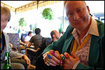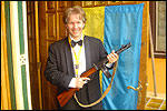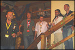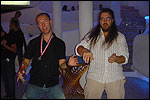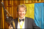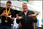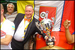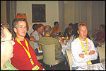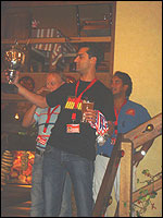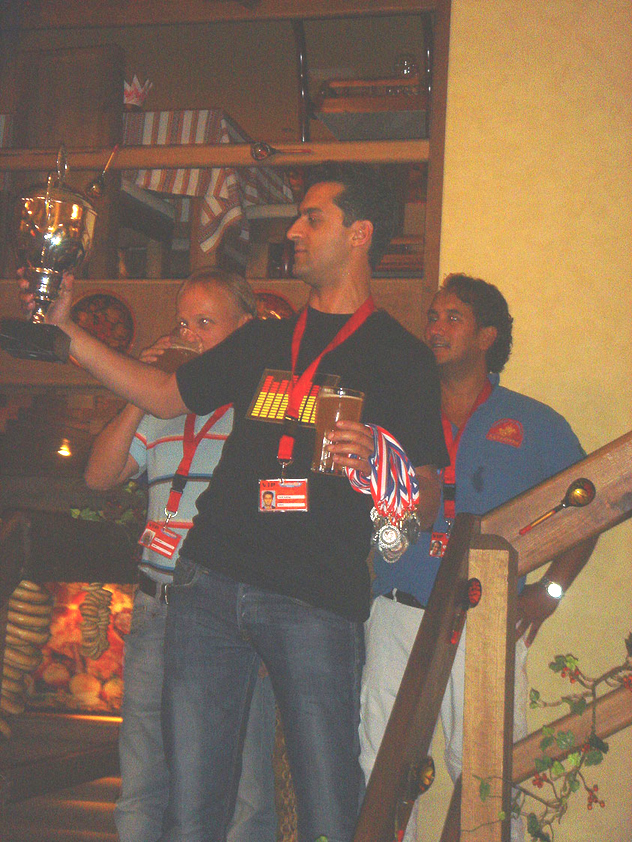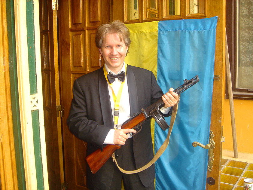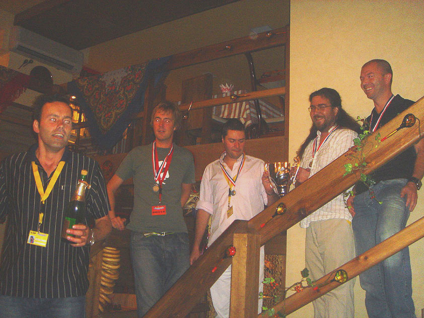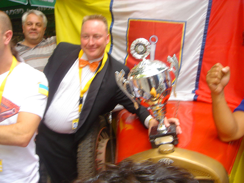 Since Edwin speaks Russian, the very same guy parades him into his appartment too, so that Ed can have his picture taken with a Ukrainian flag and an old Soviet machine gun. Cute. Somewhat less cute is that Ed and those of us left (and between those, due to lack of cash, mostly Adrianus) have to arrange for payment of the ginormous food and drink bill, because the organizers and more than half of the rally participants have hit the road towards the Black Sea Hotel. Which is where we too end up, but no sooner than that we've un- and repacked our luggage at the wrong branch of it. The Black Sea Hotel is both luxurious and western, most pleasant. We billet ourselves, and then get into a cab towards the Balalayka restaurant, for the dinner finale. Restaurant Balalayka's a snooty joint, waitresses in traditional dress and loads of fake vine leaves and the like, and questionable food. The somewhat blackened steak, for Pim of 'Always a surprise' (again living up to his team's name therefore), turns out to be fitted with incooked maggot. When he points it out to the waitress, she doesn't see what his problem is. Yeah well. Ukraine you know eh. Then, following an inventory of what everyone believes to have collected for the good cause (almost noone, of course, can be certain, because the accounts are still open for donations), the awards ceremony takes place. We turn out to have reached seventh place, partly due to my party ranking. Very good, we are most happy with this. Edwin uses the opportunity to thank everyone and announce that he will hand the winner an extra stone and whipping rod. The winner turns out not to be. The organizers namely proclaim that the 'Pirates of the Ukraine' and the 'Psycho Riders' have landed at a par. This raises eyebrows.