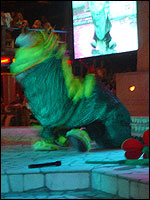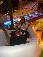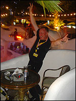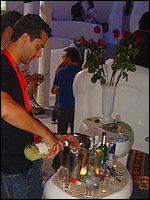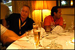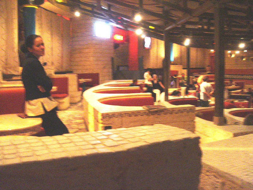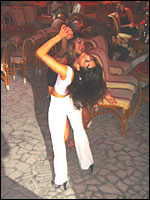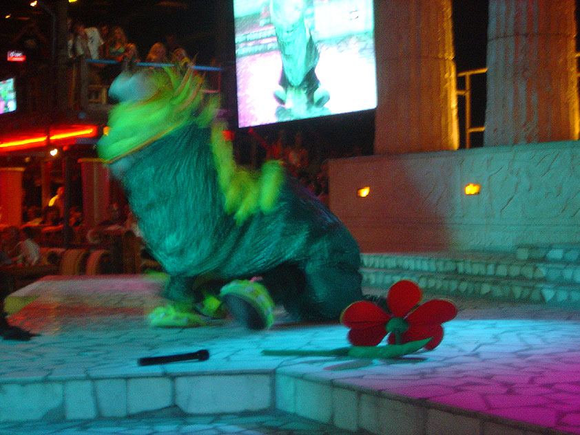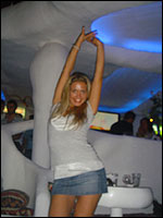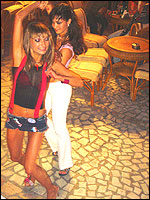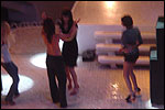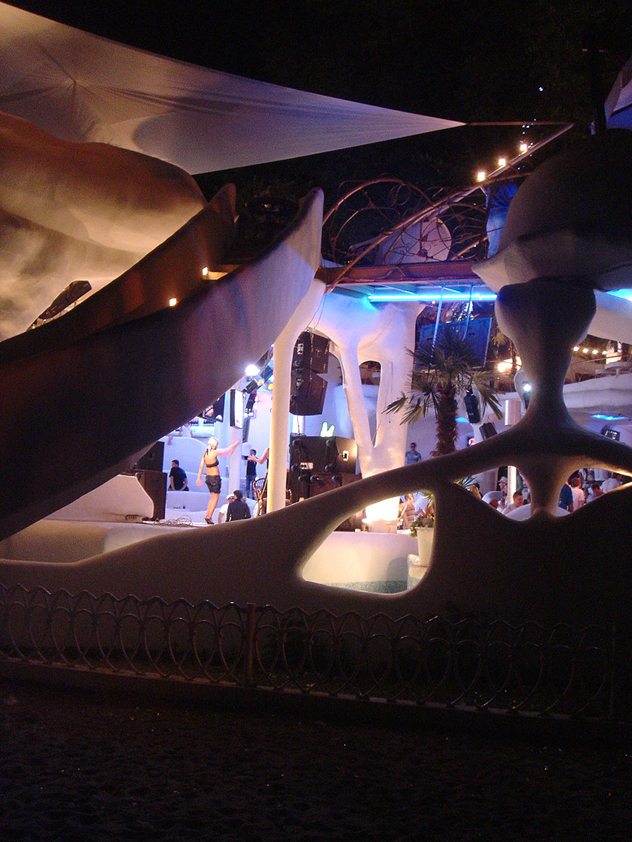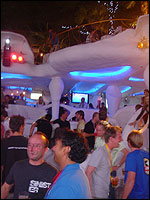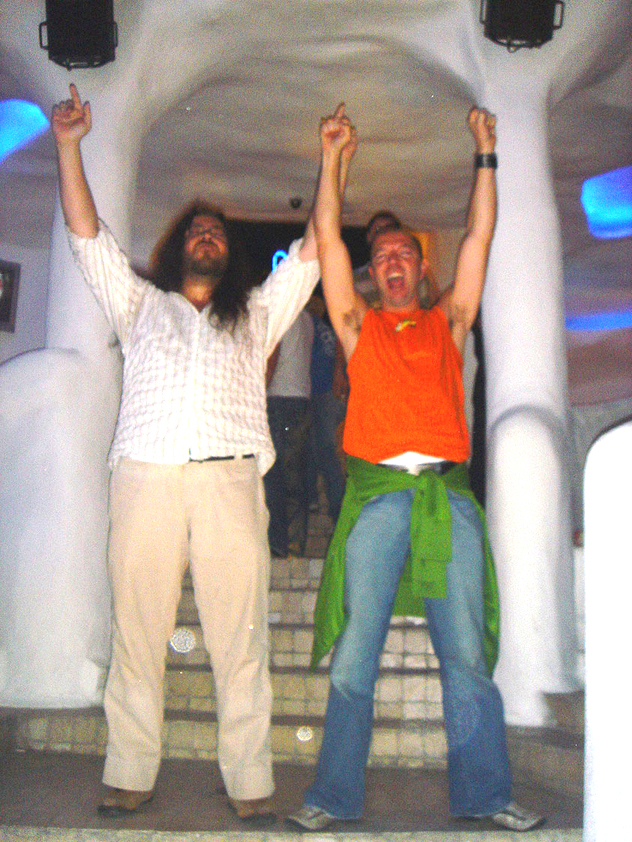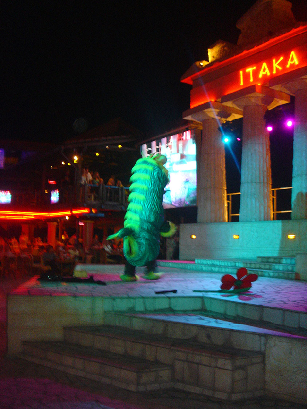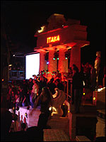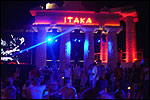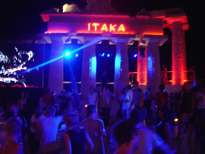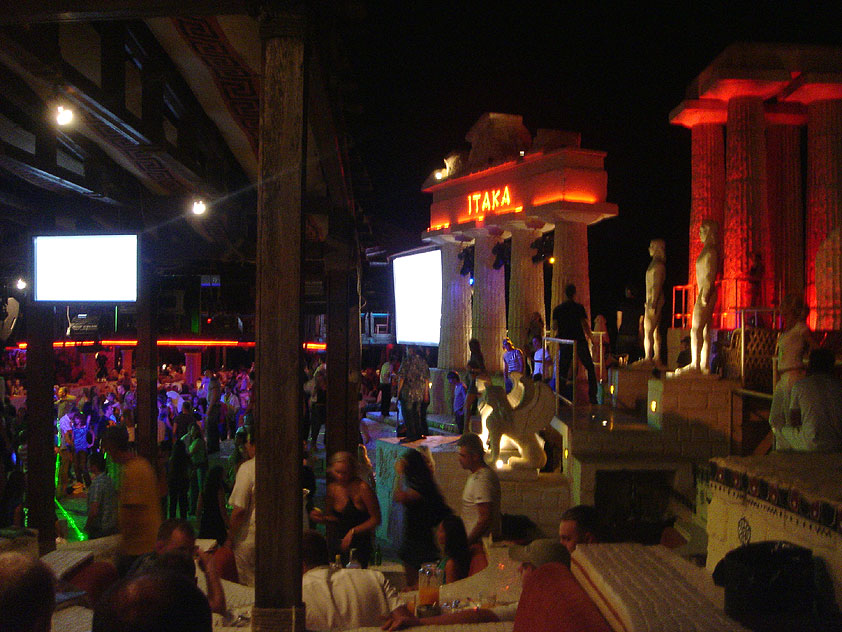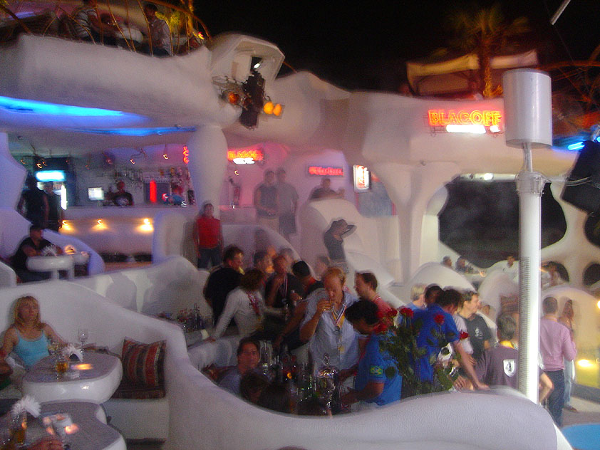 After dinner Scott (of the 'Insurance Racers') and Jan-Willem (of the Finenzo's) join Ed and me for a trip to Itaka, the nightclub next to the Ibiza. It turns out to be much larger, of a different concept (large greek columns here, and the whole thing looks like you're in the ruins of a pantheon), crowd (much better here, because it's not just the expensive Gucci-mafia-broads, but also, and quite a lot of, 'normal' people), and entertainment (there really is - we look, successively, at a stripshow of a fake cop-with-'arrested'-lady, and a weird act of some sort of chinese dragon with dansers in it).