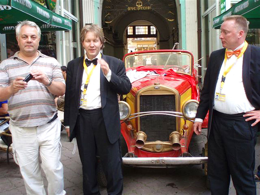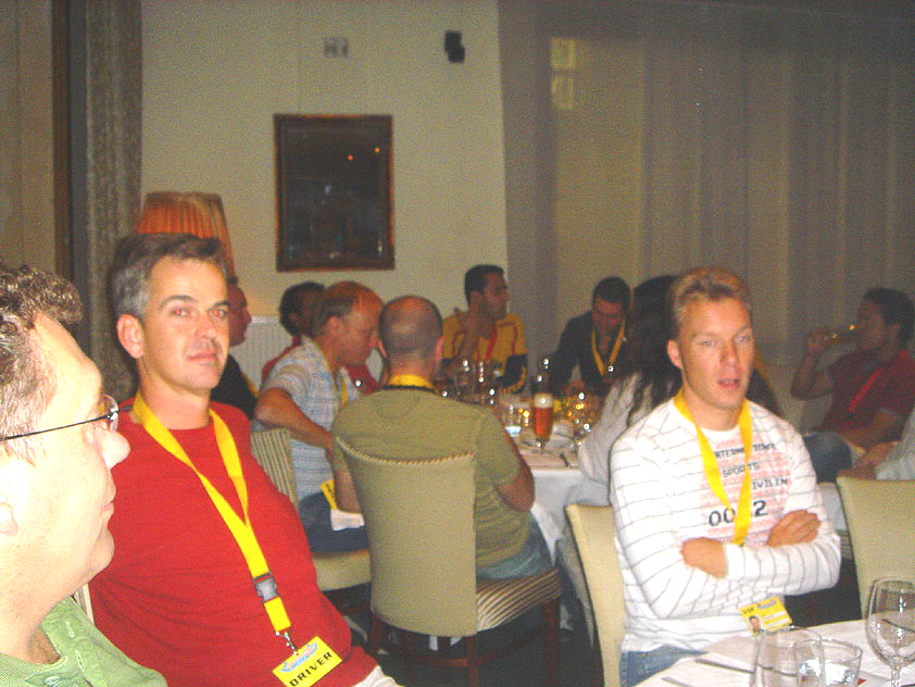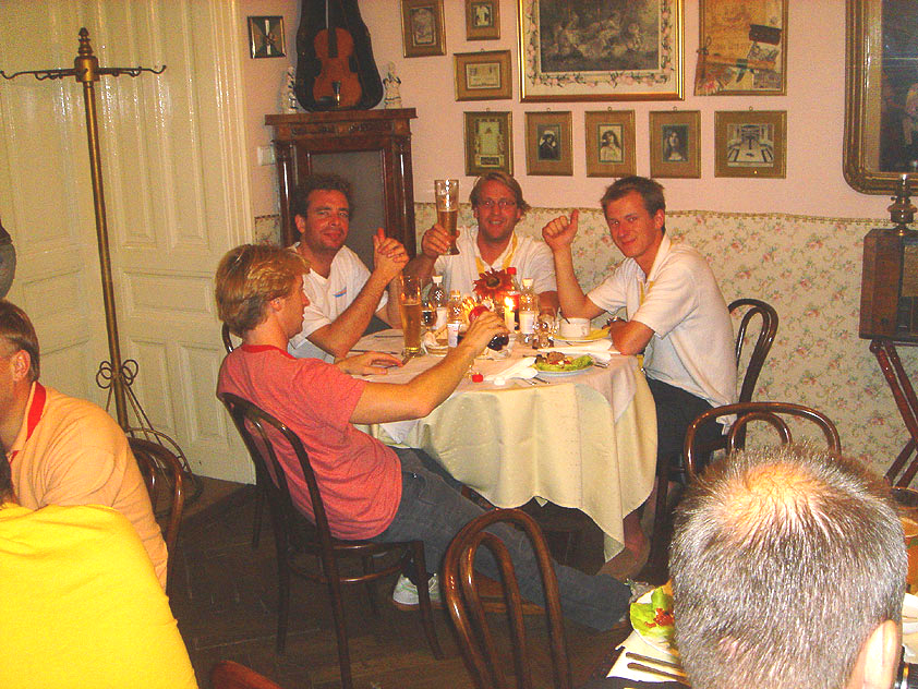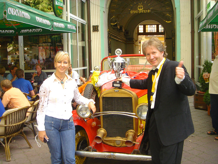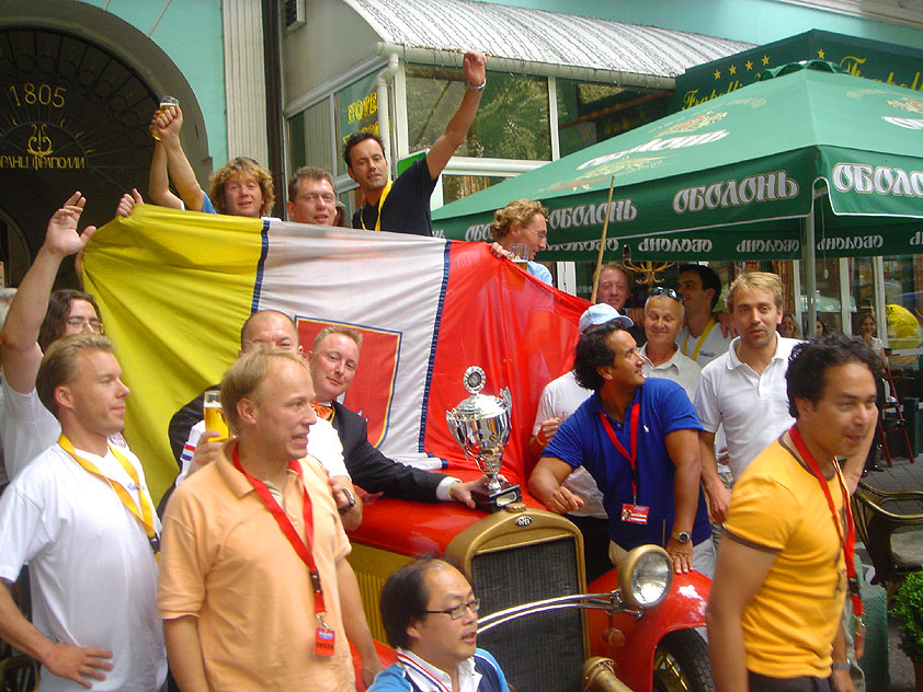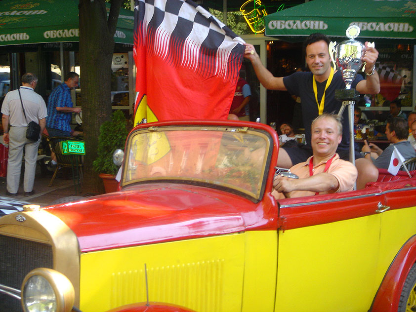 There are those who are annoyed by this. Edwin, for one. "This 'convoy driving' they were on about's a farce! Bunch of unsociables!" And Adrianus, who hasn't yet arrived, when we're behind beers already. But I, on the other hand, agree with Farid that succesful rallydriving includes the assertivity needed to find the address you are to get to. It has, after all, been listed, in the script that everyone's got. What I do have doubts about, is the fast driving through the dark. During the day is one thing, you can then still maintain an overall view and estimate matters. At night, on bad roads in an unknown country, I find to be quite another. I am glad nothing went wrong, but deem this to be luck. Adrianus will, over dinner in living room restaurant Kupol (ex-cel-lent, by the by, with genuine Russian food, amongst which caviar), become a lot angrier. Tom and he, as 'Pirates of the Ukraine', along with two other teams, are namely disqualified by the Bokitoes, for leaving Prague ahead of schedule. "But you yourself said we could leave!" "Yeah well," is the Bokitoes' answer, "you can always do anything - but you know what the rules say.". Even I feel this is a bit far-fetched, since, being organizers, one can expect participants to regard one's word as law and so to justifiably interpret "You may leave" as a safe signal for departure. And since almost everyone seems to feel this way, the Bokitoes eventually back down, and convert the disqualification into a time penalty, equalling the number of minutes left early.