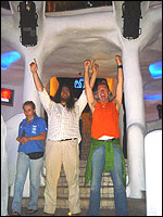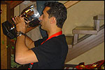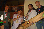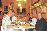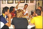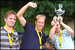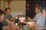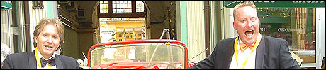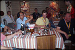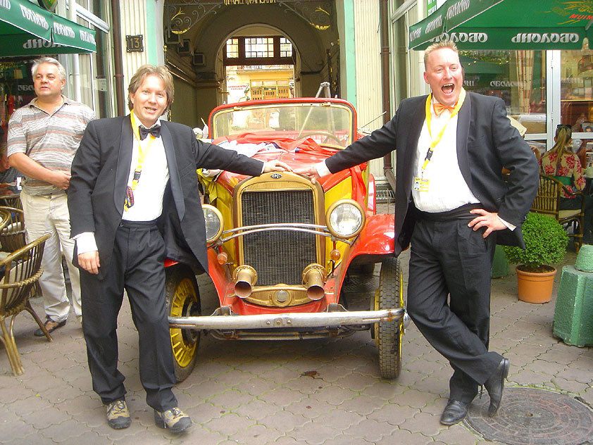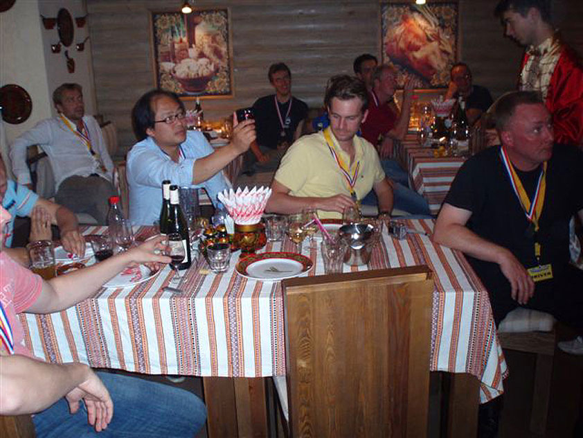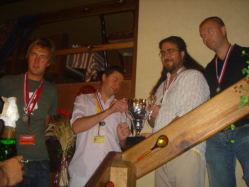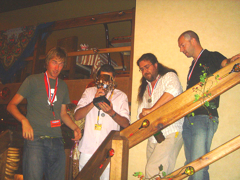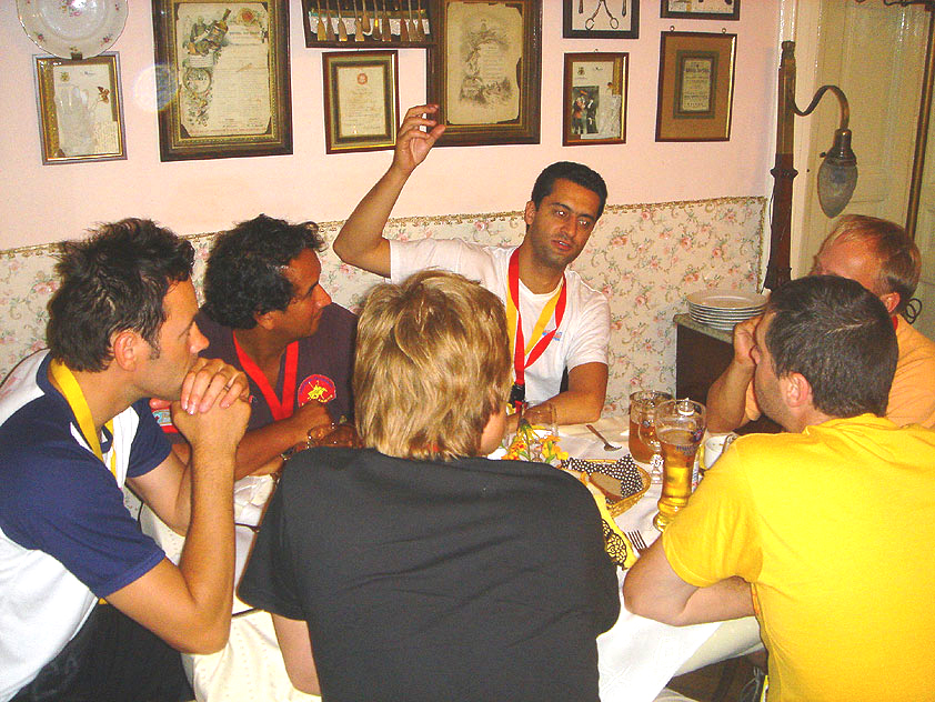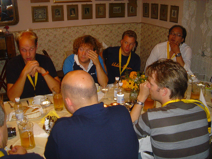 There are those who are annoyed by this. Edwin, for one. "This 'convoy driving' they were on about's a farce! Bunch of unsociables!" And Adrianus, who hasn't yet arrived, when we're behind beers already. But I, on the other hand, agree with Farid that succesful rallydriving includes the assertivity needed to find the address you are to get to. It has, after all, been listed, in the script that everyone's got. What I do have doubts about, is the fast driving through the dark. During the day is one thing, you can then still maintain an overall view and estimate matters. At night, on bad roads in an unknown country, I find to be quite another. I am glad nothing went wrong, but deem this to be luck. Adrianus will, over dinner in living room restaurant Kupol (ex-cel-lent, by the by, with genuine Russian food, amongst which caviar), become a lot angrier. Tom and he, as 'Pirates of the Ukraine', along with two other teams, are namely disqualified by the Bokitoes, for leaving Prague ahead of schedule. "But you yourself said we could leave!" "Yeah well," is the Bokitoes' answer, "you can always do anything - but you know what the rules say.". Even I feel this is a bit far-fetched, since, being organizers, one can expect participants to regard one's word as law and so to justifiably interpret "You may leave" as a safe signal for departure. And since almost everyone seems to feel this way, the Bokitoes eventually back down, and convert the disqualification into a time penalty, equalling the number of minutes left early.