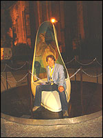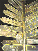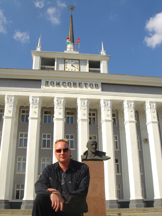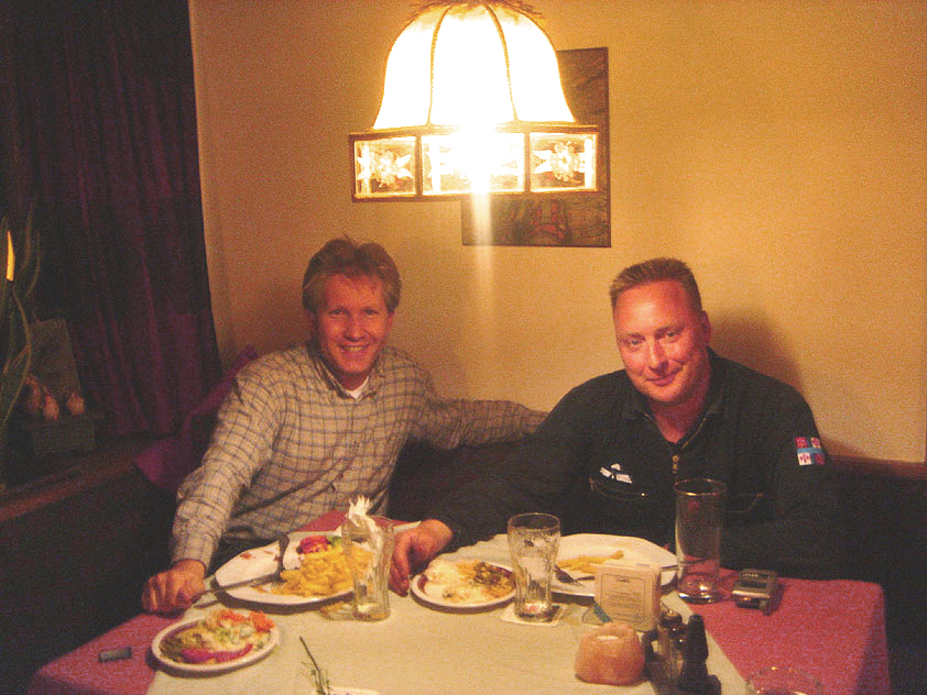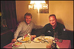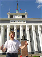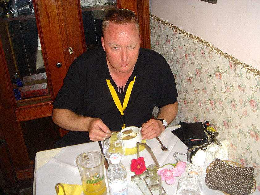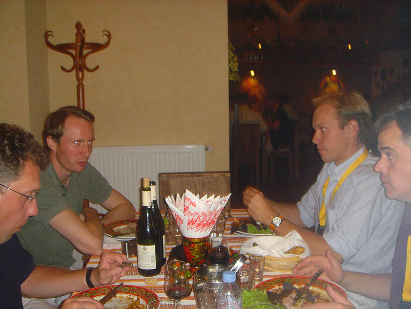 But first, after intense relaxation on my part (I, among other things, watch tv, during which I note that the news is exclusively about president Joesjenko, and his great deeds of today, for the duration of 5 items no less - I cannot escape the impression that this is not because he dictatorially orders this, but because the producing staff just isn't used to making television any other way; Joesjenko would be crazy to inform them otherwise), and some roaming through town by Ed in the afternoon, we have dinner with 'Finenzo' and the 'Insurance Racers', in a fine, albeit somewhat western and therefore expensive restaurant, Steakhouse (NOT comparable to the Kiev restaurant of the same name). It does not only serve fine calamaris (one can always judge the quality of a kitchen by them), but also a fine supersteak (Jan-Willem of the Finenzo's has it, and he radiates joy) and lovely lamb. AND they have an amazing toilet block, with a floor made out of green glass. Most estranging and exciting.