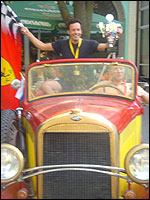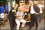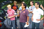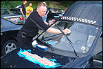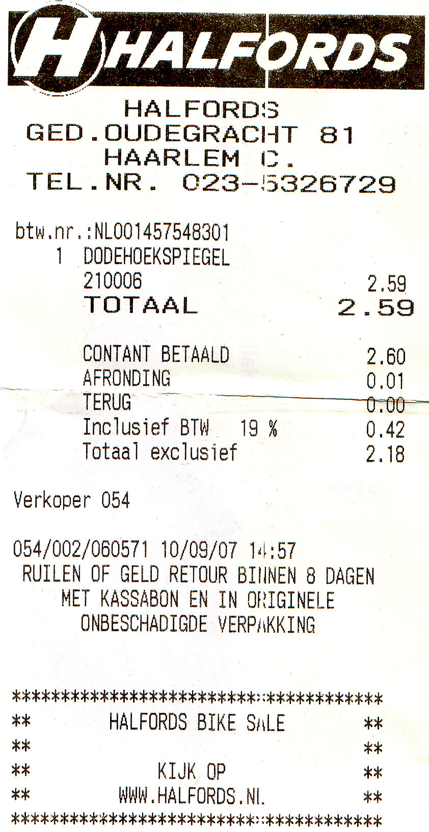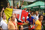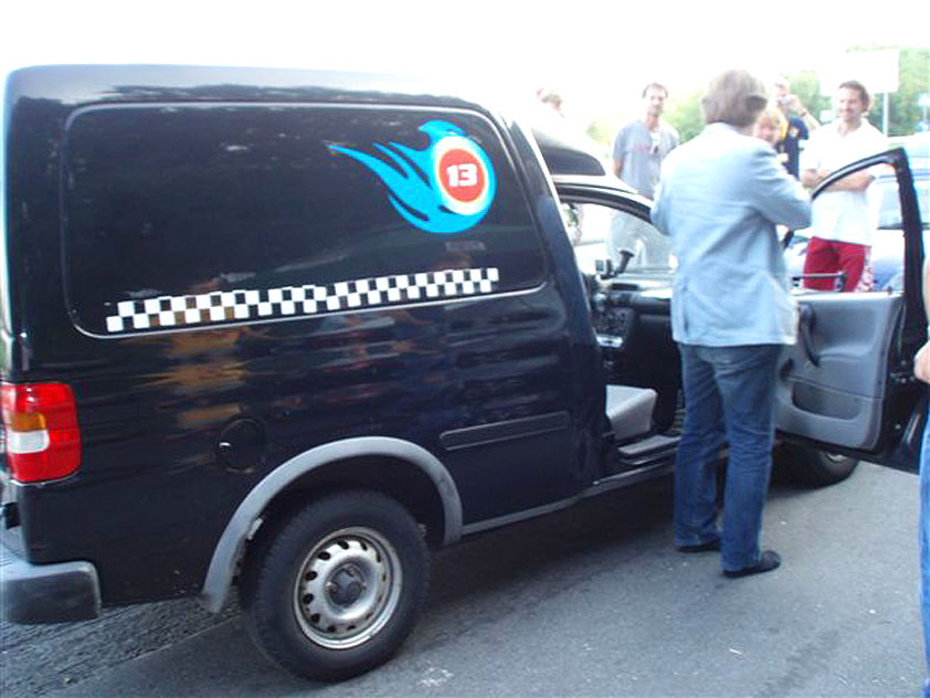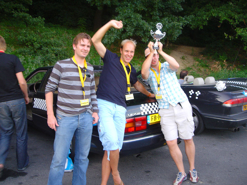 There, just across the German border, is crazy Ludwig's castle. I paid it a visit during the schooltrip (at the time, we got there by walking to it from Austria, through an enchanting valley bowl) and now we're here it seems worth the effort to me to show it to Ed. He agrees, for he enjoys the view of Hohenschwangau and Neuschwanstein. We don't venture into the castle (given the horde of people waiting to take the tour, we don't think that's a pleasant plan, and we do think it'd be too time-consuming), but we do take a look at the castle from above, from the Mariënbrücke, the same bridge on which I once smoked a self-rolled filterjoint as conrector and namesake H.E. van Rheenen asked me: "And, Michiel, what do you think of the castle?" "Cool colours", I replied, as I recall. The castle is white. We drive into the German lowlands and onto the autobahn, past Ulm (this time over, thankfully, not with Wham!'s full 'Club Tropicana' album belting from the speakers on endless repeat as it did back in 1984). I call my audibly relieved father. He's entitled to be. What we did yesterday absolutely is the most dangerous thing we did during this journey, and we survived. Which doesn't alter the fact we must still drive home safely. But this proves to be no problem: shortly after nightfall, we arrive in Solingen without further ado. Solingen? Solingen. One of the female Rumanian doctors Ed knows from Braşov, and who by now lives and works elsewhere in Germany with her daughter (her husband is still in Rumania), happens to be in Solingen for training. We look her up (her name's Ioanna), and experience the village fair in Solingen in her company. Most unreal, to suddenly find ourselves amidst drunk, bragging Germans, out front of a packed bar. But, pleasant. Both glad and thankful, about and for this welcome break during a long ride, we bid our goodbyes and set off into the night again. Day 17 09.09.2007: Haarlem We arrive in Haarlem at five past five in the morning, at the Taxi Adriaan offices. We greet manager Jimmy Jaggoe, and as Ed starts recounting, I get his stuff from the car (all loose-lying objects objects too), prior to pissing off. At home I do three batches of laundry, water my thirsty plants and get the mail. Thus, I learn about the sometimes bizarre trip back of the other teams, and learn that we returned last: the 'Insurance Racers' returned Saturday night, so we beat them by a daypart. We are the Last Men Standing! In the mail's an invite to secondary school-friend and former bandmember Victor Schiferli's party, on the occasion of his fortieth birthday, that Sunday afternoon on Blijburg beach in Amsterdam. And so I've barely slept, an hour or four, before getting back into the car and driving to Amsterdam, to suddenly find myself on a sandy beach on the edge of Amsterdam (how bizarre!), with a cocktail (mojito) in my hand and a wristband (pink this time) on. Will it ever stop? When, shortly thereafter, I make my apologies to Victor and drive home shot but satisfied, an enormous poster greets me at the Haarlem city limits. 'Welcome home' it reads, with a big picture of the Bavo church below it. Thank you kindly. I drive by the office, vacuum the car and dump Ed's leftovers (the stone, the pingpong game, a pillow and a set of jumper cables), buy some air freshener canisters for the car, and some Chinese food. I've only just started to scan the receipts of the journey, inspect my financial despair (cute, the listing of debit notices and withdrawals en route), transfer other people's money to Stichting Spoetnik, and have my Chinese, when taxi coworker Ali rings. "Say, it's a Sunday night, so we're out on a binge! Wanna join?" A little later, I find myself in bar Flapcan with a wodka in hand, and via the Oude Floryn end up in Fidel, from which I leave with an excessively large Cuban cigar, a present of coworker Mehmet. Will it ever stop? "How was your journey?" How do I tell? And how do I explain it wasn't, but is? Day 18 09.10.2007: Haarlem Today, I buy a new right mirror. It is available, on stock, right next to the Taxi Adriaan offices. Cab colleague Tom puts it on in less than no time, and I drive to Halfords, to get a blind spot mirror for it, which I contentedly stick to it. There. Mister van Reenen can drive again happily. And happily does so, to the Hendriks carwash.
