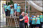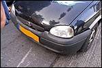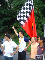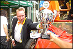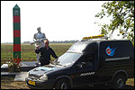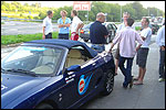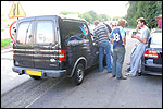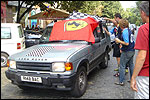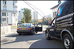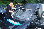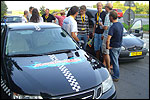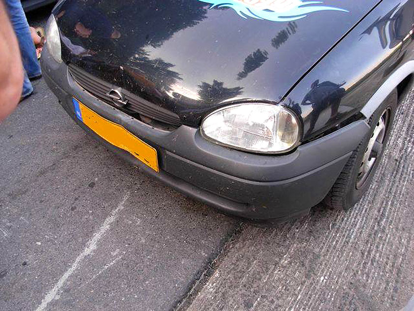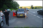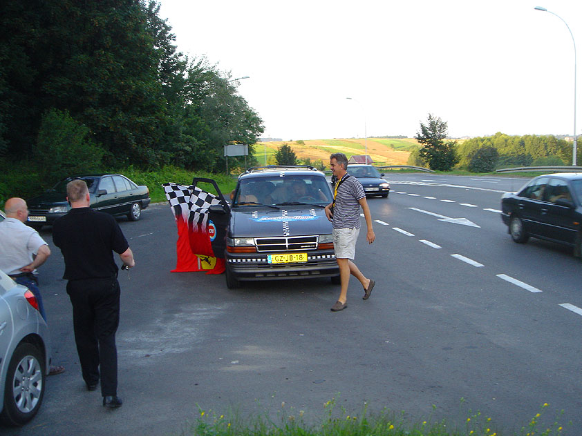 But it won't last long, today: all hell breaks loose past Krakow. For hours on end, we stand at snail's pace on a two-lane road as, along the opposite lane, we are overtaken at will by vehicles (Polish) accelerating faster than our Combo - and when, finally, a usable gap appears, things naturally go wrong. As Edwin rouses me, and I make as much speed as possible to, with heavily roaring engine, over the left half of the road, overtake three cars in front of us, the foremost of these, a small red car, decides to suddenly hang a left. My road blocked. Evasion impossible. Life becomes a slow rewind, sharp in slow motion. What remains is a hard pull, leftward, on the steering wheel. We graze the other car with our right hand side. Somewhere, a mirror breaks, and then, braking, we come to a halt with screeching tyres - on the verge, against the metal pole of a traffic sign. We get out and inspect the damage. To the victim's car first. It turns out to be intact, barring the left mirror, which loosely dangles from it - but had already been affixed with ducttape. Then to our own car. Our right mirror has come off, it lies broken on the roadside, and both the hood and bumper beam sport a sizable dent - but the radiator has thankfully not been hit, and we are not leaking fluids. We swiftly arrive at our conclusion: we offer the lady, who proves to be Canadian by origin, emigrated to Poland, money for her mirror. But she will have none of it. She insists on police. Dammit. While we see at least two competing teams roar past us (we see the shadow of a Volvo station, and the Mitsubishi of Team 'The Mitsu strikes back'), we then spend our time filling out a claim form. Which, in the end, will not be used, for when the cops arrive, they keep it short. "Woman, what business have you, waking us for this? Don't be ridiculous, accept those Dutchmen's money, and get lost.", is about the gist of it. She does, but 'that money' has by then become €120,-: a ridiculously high amount, around Poland, for a mirror. But then, we are rid of her, and can continue our journey. Which otherwise proceeds smoothly but when I, finally, turn into the layby at Przemyśl and come to a halt amidst the rally racecars and a jubilous reception by our fellow rallydrivers (who have by now been informed by Adrianus, of our adventures), I do so shaking, with a sigh of relief, and tears in my eyes. Yeah well. Happy with my reflexes, pleased with the way things turned out, but an accident's still an accident: misfortune. But the solidarity now clearly is growing, and this is greatly pleasing. Add to that that, again, we aren't even last to arrive: Team 'Bokito', the organizers' team, is still behind us, in their Chrysler Voyager. Flagman and all, because there were no flights from Prague to Przemyśl, so he was forced to go by car. Reinhard's a good sport though, so when he arrives he jumps from the car with a huge flag and proceeds to finish us all.
