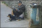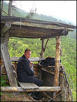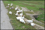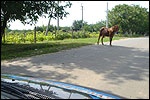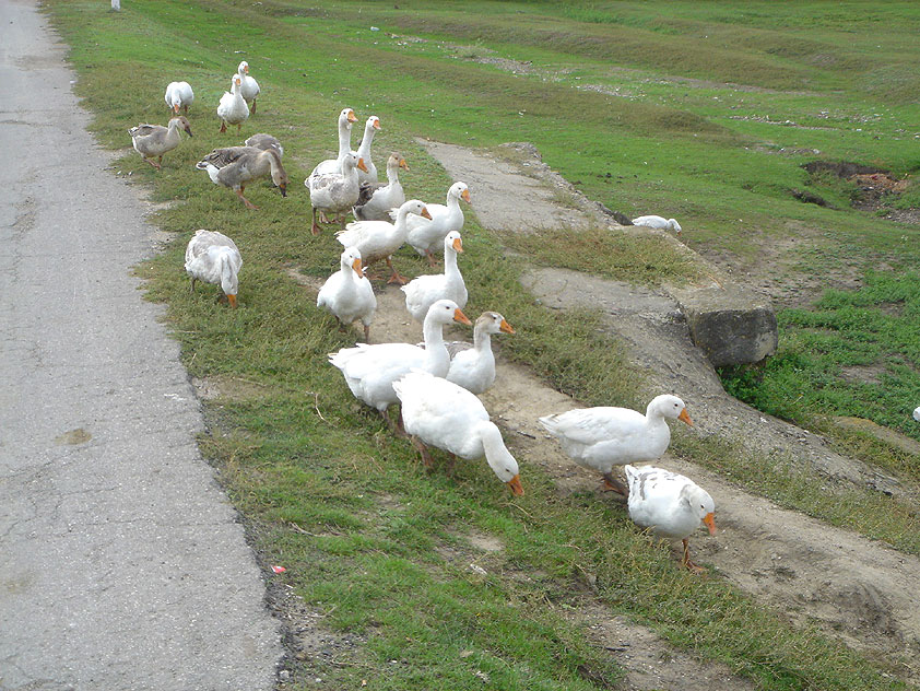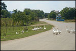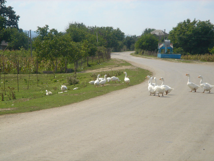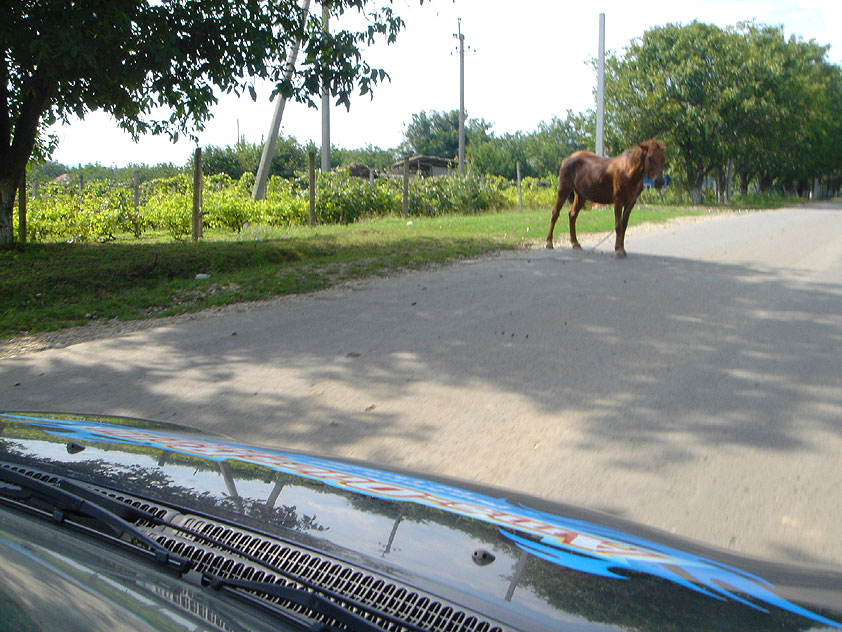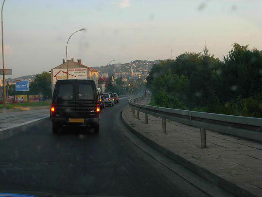 These roads, by nature, namely carry but two kinds of motorized traffic: Ladas going 56 mph at the most, belching smoke and falling apart as they go, and three-piece convoys of brand-new, jet-black SUVs with dark bulletproof windows, armed men in the first and last, and the mobboss in the middle car, leisurely doing 100 to 120 mph - a difference in speed that is at least as dangerous as the one between us and the horse-and-carriage combinations. But that is not the worst. There namely are all sorts of gramps and grannies, sitting on the side of this road, selling jars of jam, and fruit, and something unrecognizable that looks like drying vine leaves. And so it may come to pass that one of those SUV convoys suddenly steers onto the shoulder, without indicating beforehand, to take along a jar of jam for grandma (and so we do too, and don't buy a jamjar-for-grandma, but do buy one of those things with the drying vine leaves - it turns out to be a whipping rod for the banja, with which you therefore beat eachother to a pulp after the sauna, to improve blood circulation). But that is not the worst.