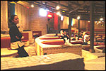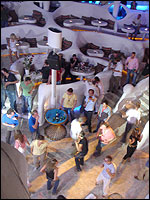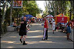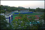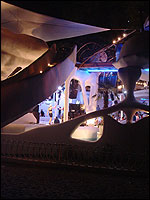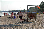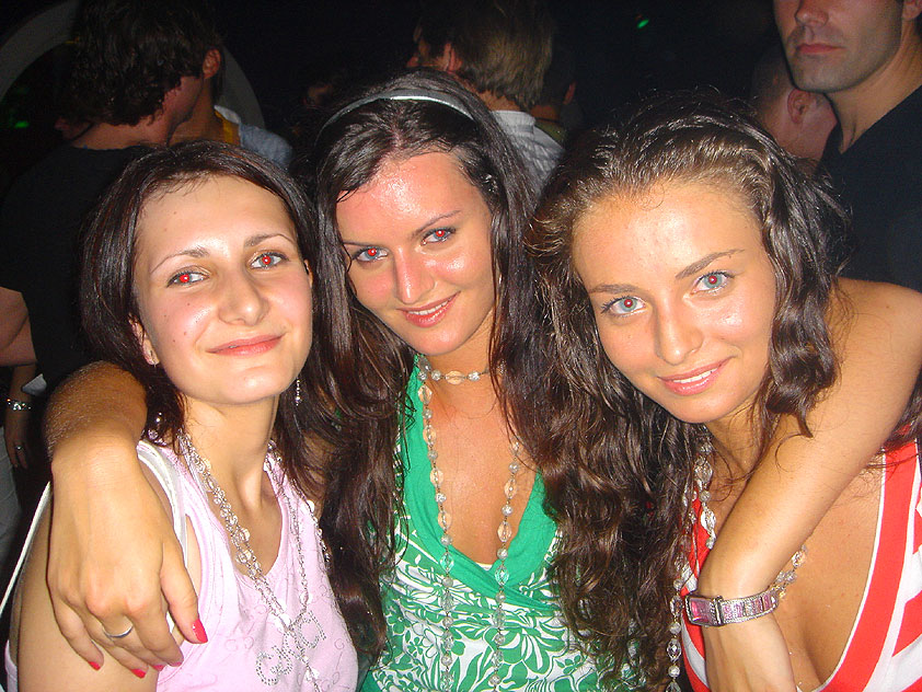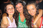 We, meanwhile, have dinner, which is reasonable, but unremarkable, just like that whole Steakhouse: good, but uninteresting. Well, you can't have them all, and it ain't easy, to arrange restaurants for a rally from thousands of miles away. We therefore do not hold this against Farid. Let alone the club that follows, for it is absolutely fantastic. Now namely happens, for the first time, what will continue to be at a premium for the rest of the week. The climate here is a relatively dry one. This means one can do here what cannot be done in Holland: build very large open air clubs. So this Jeans Beach Club takes up an area of a mile by 164 yards, with in it toilet blocks, two dance stages (one of them really big, with a lowered dance pit and galleries around it), an outdoor arbour, cafes, and even a real bit of beach with recliners, by the banks of the Dnjepr (this, once we have arrived on the Tivoli-esque isle on the edge of Kiev and have made our way by and through a permanently established fairground, with several other clubs and restaurants in between, to the back of a dark wood, where the Jeans Club turns out to be, turns out to be closed by now, and I'm directed off it later during the night by a guard, who's under the impression I shall attempt suicide by wading into the water, whilst all I really want is to quietly look at the stars, but hey).