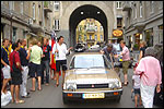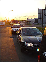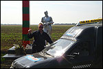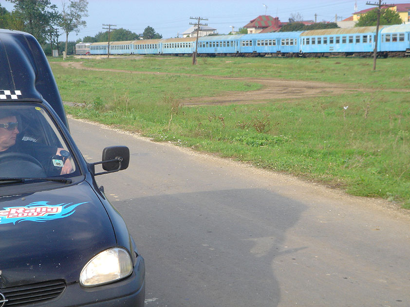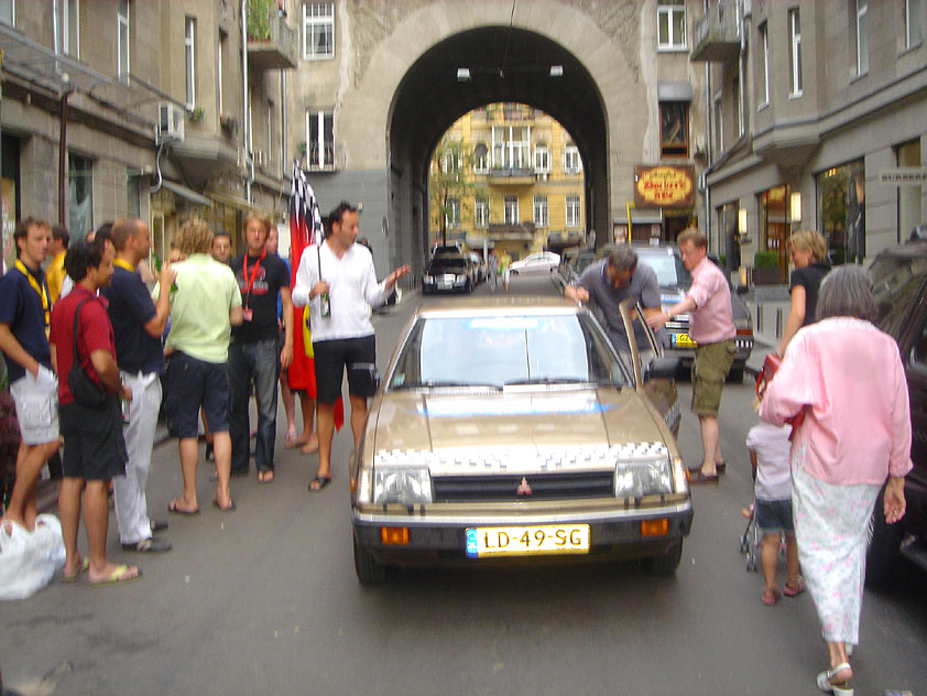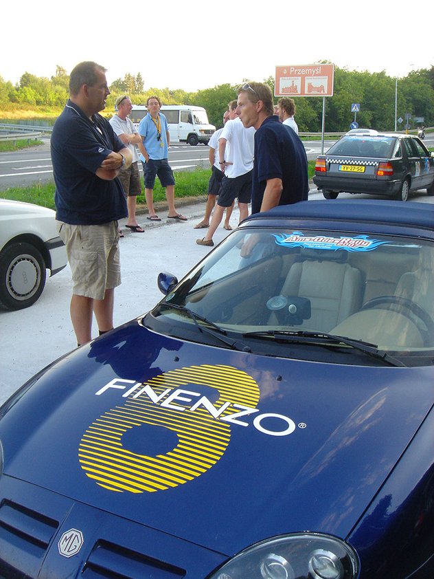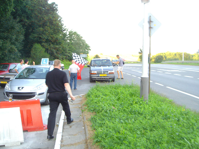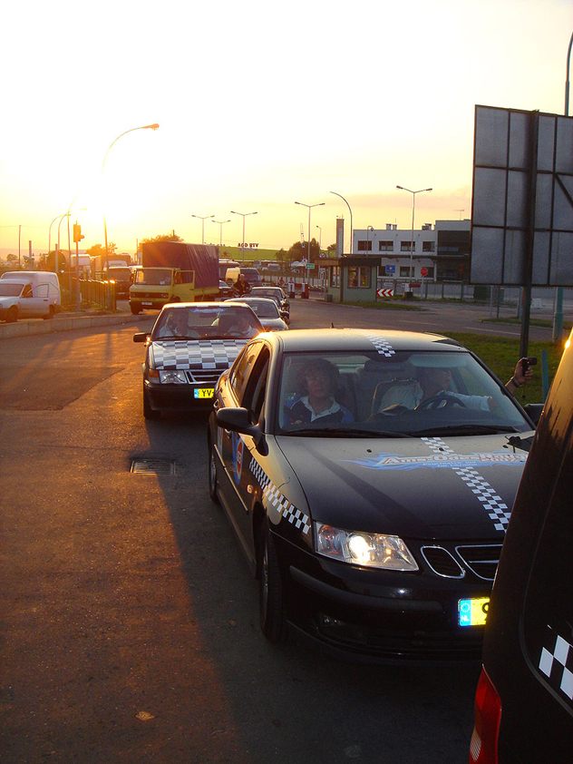 Some five minutes later Farid does collapse insofar that he, as last remaining organizer present, sounds the retreat to the hotel. Good. There's me and three or four others left: mission accomplished. Day 2 08.25.2007: Prague-L'viv But this does have a downside, it turns out. Upstairs in our room, there's a half hour left, or so, before departure. I shower and drop down on the bed. It feels like immediately that Ed wakes me, and then Farid and I find ourselves giggling in the lobby, knowing that we won't be doing any driving, for a while. Green light for departure is given, and then our team strategy proves itself. Ed namely has, the night before, when I was in the club, used his time not just to find out how to quickliest leave town, but actually practice that route too. And so we dive into the tunnel directly adjacent to the hotel, and before we know it, we are on our way towards the Polish border via the E65. The first one to overtake us, thereafter, is Adrianus, with an invisible, for flatly sleeping Tom beside him (Tom also went to the hilt in the Mish Mash), but by then we've been on the road for an hour or some. That we're moving towards Poland, Ed and I already planned the night before; it was either that, or through Slovakia, but that would have given us an extra border, so loss of time, on the way to Przemyśl. Przemyśl? Przemyśl. That's where we need to go, because today's finish will be at that border crossing, between Poland and Ukraine. This since, normally, negotiating this bordercrossing takes some 12 hours. The organizers have therefore arranged for the Dutch consul in Ukraine to escort us through, and to then drive with us, in convoy, to L'viv. No sooner said than done - but first, we need to get through Poland. And although those are still fine roads (enough so for me to happily fall asleep, next to the driving Ed), things don't run flawlessly. Loads of roadworks make for a sizable delay. Passing Oświęcim (again: pity there's no time, to take the tour) and Krakow this is all within bounds: we make good speed and as I (behind the wheel by now, following a refuelling- and hydration-halt) spurt along I see Ed making weird dancing movements, with his arm, from the right window. "What on earth are you doing, Ed?" "Playing, with the wind." Pleased, I notice Ed is relaxing. Spoils gained.
