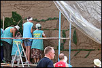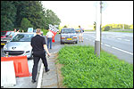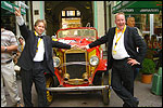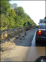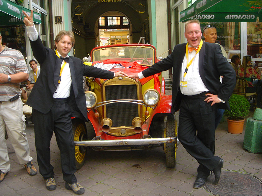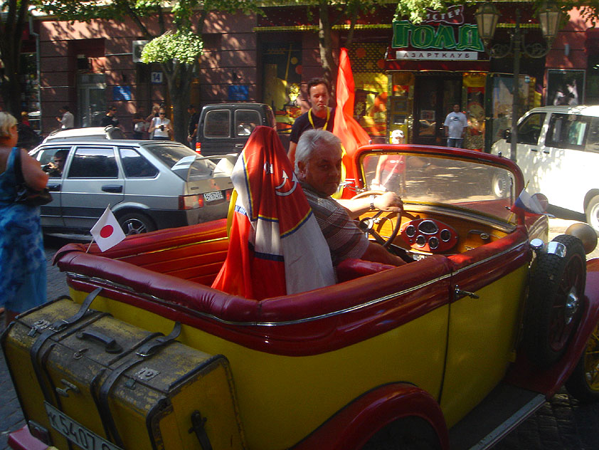 Martin only arrives there at 09:00, so Tom loses a large chunk of ranking. Day 4 08.27.2007: Kiev-Odessa The departure from the Mir hotel then has disquieting parallels with the one from the Dnister hotel: the reception desk has not only returned the wrong passport to one of us, making it necessary for the rightful owner to find out who's got it, and at the reception desk to find out whose passport is superfluously there, before we can leave - because the Bokitoes, perceivedly or no, graze a parked car while driving out, the parking lot guard icily lowers the barrier and no one still on it is allowed to leave. Edwin solves this, by signing a claim form as 'Evert van Benthum' of the 'Elfstedenweg' in Haarlem, and shoving this into his hand. We're gone, and I go back to sleep contentedly. A few hours later I wake along the excellent, but boring highway from Kiev to Odessa. Amazing, though, are the roadworks there. Some guys are replacing the crash barrier, and this is not done, as it would be here, with a crane and whole segments at a time, but by hand, tube by tube. And all that without protective roadblock and pylons. Never heard of health and safety, they must have here. Just out of Odessa we're hilariously overtaken, along the shoulder, by the Bokitoes, who disappear in an enormous dustcloud... ...to just three cars ahead of us, in the traffic jam along the road now seriously narrowed, due to roadworks at a larger scale. Edwin wants to catch up with them too, but I talk him out of it, partly by bringing it to his attention that we shall soon need to pull over anyhow, to don our tuxes. First, we attempt to find a shortcut, by using an overpass to find the secondary roads along the coastline, but when the overpass turns out not yet to have up- and downramps, we drive on, to indeed finally don our tuxedoes, at a gasstation on the edge of Odessa.