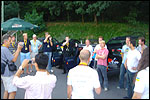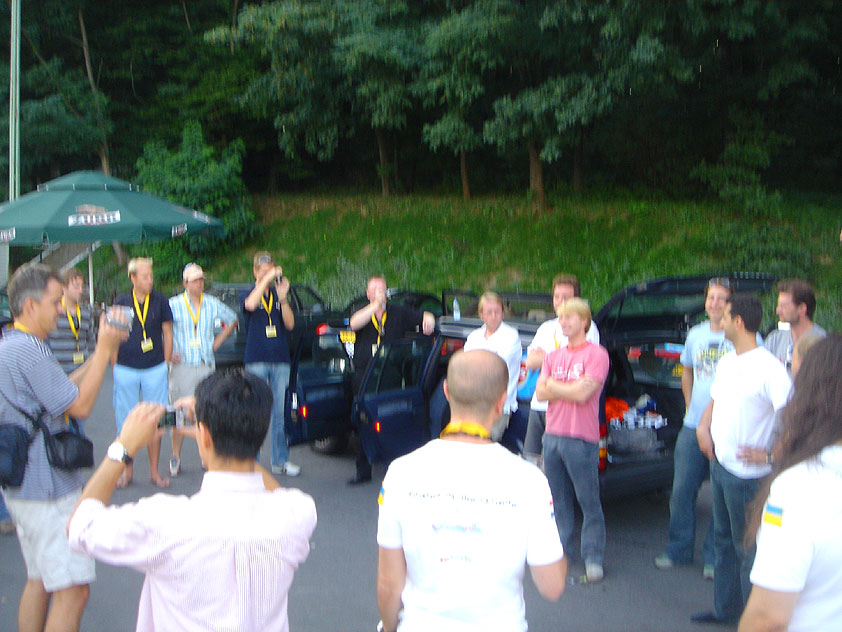 Meanwhile, even before everyone's finished dinner, more or less the same thing happens to the ride to the hotel, that happened to the ride to the restaurant: consul and party set off, and anyone who does not immediatelyh follow, can find out for themselves where the hotel is. Ed and I do follow, but immediately lose them. No matter: the Dnister hotel, it turns out immediately thereafter, is just 'round the corner. Once quartered Aad and Ed, as designated drivers, decide to conspire for the exit reconnaissance. They will therefore check arterial roads leading out of the city on the map, and predrive these. Tom and I happily set out, meanwhile, for the club, Millenium. It turns out to be an enormous affair with two floors and a large dais for the DJ, with a gigantic videoscreen behind it. What also stands out is what appears to be utmostly normal in (former) Russian territories: police-like guards inside the club. This despite the fact that, upon entry, everyone is checked for arms, by means of security gates and optional frisking. Those guards, out of boredom, busy themselves with petty things: they blow a fuse, for instance, when you appear to contemplate stepping onto the dancefloor with a drink in your hand. The ladies, meanwhile, are at times beautiful, here, but decidedly more unapproachable than they were in Prague. This does not prevent Martin Plak (both co-organizer of the rally as well as, as only organizer, not a member of Team 'Bokito', but of Team 'Psycho Riders') from bending them to his will. Martin namely also is a DJ, and has arranged for permission to spin a set as 'DJ M-ART-IN STONE from Amsterdam'. Giant slide behind his head and all. And he does get them dancing, so I shoot brilliant film of this, to our twofold content. Having completed predriving the exit roads, Ed also appears in the club, but he takes off again, when the place closes. I then leave, in select company, for a very shady lapdanceclub in a suburb. Its door policy is hilarious. The joint's about to close, you see. But some kind of translating doorman negotiates for us, with the invisible staff present below, in the cellar. The demands put down by them change every time. "You must buy at least 20 beers, and then lapdances cost 100 hryvnia (the Ukrainian monetary unit, which Ed and I have swiftly and permanently begun to call "greebees") each." "Fine, as long as we can get something to drink." The man disappears below, then returns. "14 beers, and 100 hryvnia per lapdance." "Fine, as long as we can get something to drink." It goes to and fro like this for about four times, and our answer remains the same. Finally, we are shown inside and then find the staff in utter confusion. We are again warned that we will have to buy a minimum quantity of beer. "Fine, as long as we can get something to drink." We eventually do, and by the time we finally return to the Dnister hotel with the last survivors, things have come to pass that I will not describe here. I also vehemently deny that 1 of us stood on the stage naked, with a nude lady hanging from him upside down, let alone that I remember who that was. Meanwhile, I have at least had a very good conversation with the doorman, who turns out not to be that at all, but a Belgian para-cum-pilot, who was actually just about to leave when we arrived, but who is immensely intrigued by our rally story. Day 3 08.26.2007: L'viv-Kiev Back at the hotel the group occupies the outside terrace, for another beer. I partake, but when the partyleague is closed for the day, I split, and go shower and change in our room, then to pack up. On my way to the car, with the first two bags, leaving the hotel not through the lobby on the ground floor, but via the terrace on the first (which is possible, since from there a walkway leads diagonally down to the parking lot. It is closed off by a small fence though, I find out when I end up in front of it. Details, details: I jump the fence, two bags and all), I am stopped short by a hotel guard, apparently under the impression I am attempting to leave without paying. I laugh my head off and try to explain there are many more bags plus an Edwin upstairs, so that is not the case, but he is unrelenting: I am to follow him back into the building, to the reception desk, there to prove to him all is in order. What do I care. Having loaded the bags into the car, I follow him into the lobby. Gives me the opportunity, at least, to look the beautiful receptionist in the eye. All's in order of course, and so I am free to proceed packing. Thereafter, I find myself in the car, waiting for Edwin, for a long time. Later, this turns out to have been the moment of the large group portrait. Yeah, well. Then, at the start, noone gets to leave, because, since someone's left behind an unsettled bill, the hotel staff keeps the parking lot barriers closed. But by then we, and the 'Pirates of the Ukraine', have been gone for quite a while. See, Ed and Aad, last night, parked our cars in such manner that we do not have to pass through the barriers, and directly turn onto the arterial exit road. I fall asleep immediately, as Ed steers the Combo along roads of which he will later state that they are the worst of the whole trip (I, by the way, do upon writing this still not believe that, because I cannot imagine worse roads exist than those in Moldova later on).