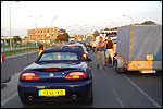 While I sleep, Ed picks a big rock up from this stretch of road, which was lying in the middle of it, and that he intends to present to the rally winner as a trophy, later on. Also, he evades a ticket. For as he, having been caught up with by several other teams by now, approaches a roundabout, Aad roars across it in his Lexus at such great speed that the confounded cops on its far side combust with rage. Aad has no problem with that, he's been and gone by then, and disappeared in the distance (he will later describe this part of the rally as a "boy's boytoy dream" and, among other things, wake Tom by getting airborne with the car). And those cops, they don't take their baffled anger out on Ed. He namely gets confused by the roundabout, steers off of it too early, and so returns to it later. By the time he does, he can drive past 'Always a surprise' who are for it, at that very moment. It will, it turns out later, be the biggest brigandry trick of the race: Pim Landman gets swindled out of €750,-! Some cop got to go take a loooooooooong vacation, I tell ya.