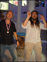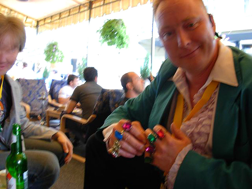 This solved, we set off, back towards the hotel. But that ain't all. For whilst I walk with Vince Blondeel Timmerman (of the Bokito's), we are caught up with by a bewildered Sybolt Boersma (of 'Always a Surprise', again living up to his team's name therefore). "I lost my phone guys!" Vince, to me: "Can you frisk this man?" Me: "Sure.". Sybolt turns out not to wear a phone. Vince, to me: "I knew you could.". Me, flabbergasted, to Vince: "How'd you know that then?" Vince, to me: "You radiate it.". Gee, thanks. Me, to Sybolt: "Did you ask them if they found your phone, yet?" "No." "Well then do, 'cause now is your last chance. Pretty soon, they'll be done cleaning and locked down, then you'll never see it again." Sybolt lurches back and Vince and I happily continue our conversation, while waiting. Sybolt returns. "Haven't been able to find it." "Yes, but did you ask THEM whether they found it?" "No." "Well then do, 'cause now is your last chance. Pretty soon, they'll be done cleaning and locked down, then you'll never see it again." Sybolt lurches back and Vince and I happily continue our conversation, while waiting. Sybolt, however, does not return. Vince and I decide to go size up the situation. Sybolt stands amidst a throng of guards, 1 foreigner besides them, who speaks English and translates.