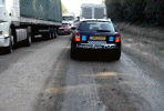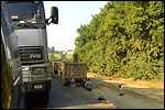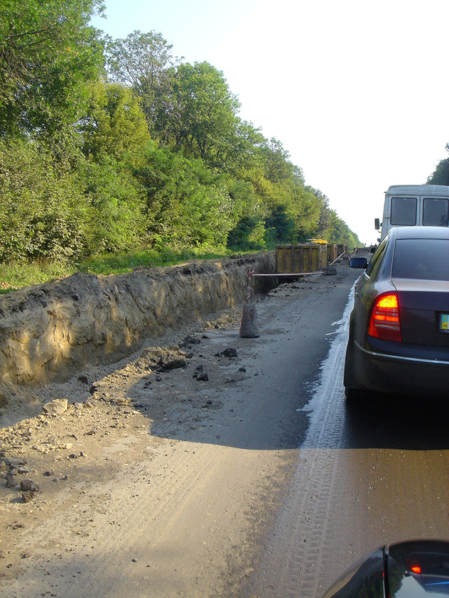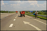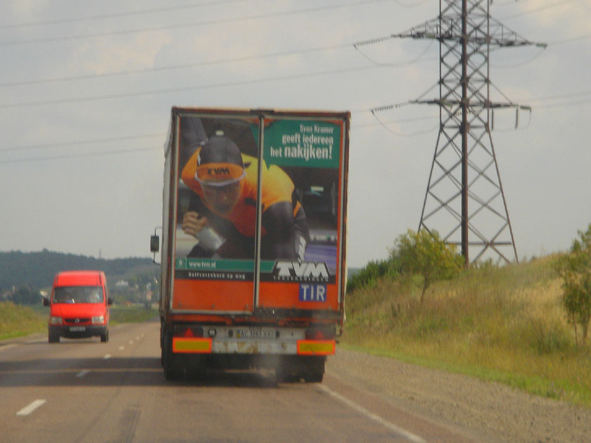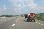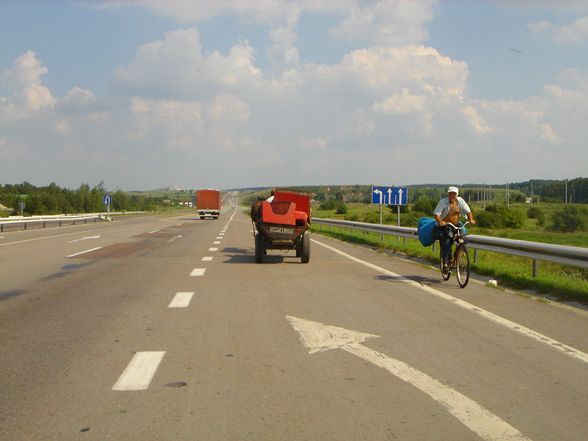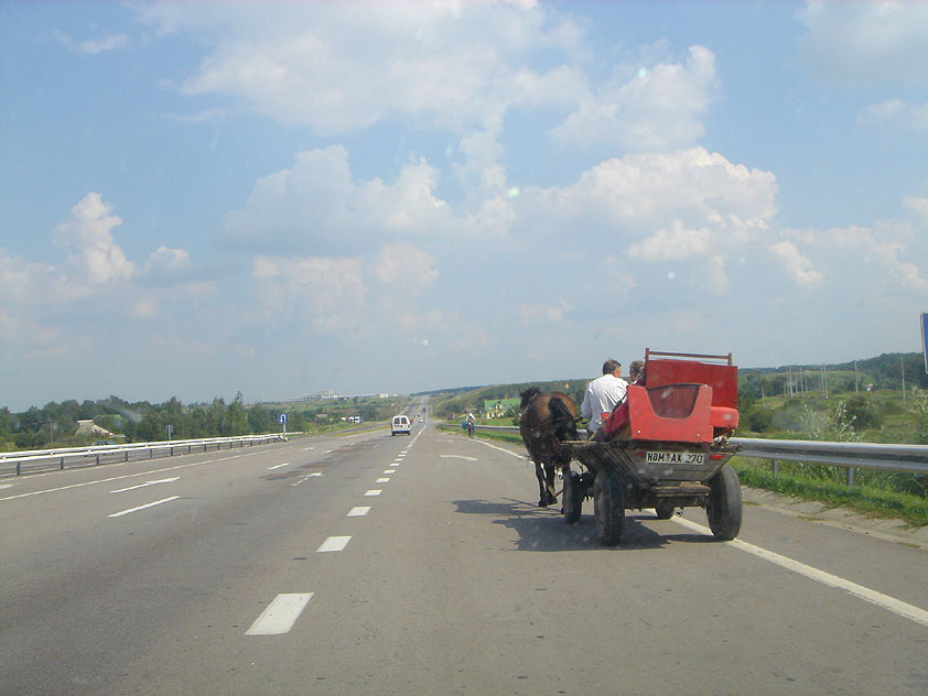 We could now have done this. I think we'd have stood a fair chance had we now pro-actively stopped at that second checkpost and there had said "Say! Your colleague, 12 miles back, donated to our good cause! Do be sports and mimic the gesture?!". But we don't and drive on. Due to the cultureshock, maybe. Cultureshock? Cultureshock. This highway that leads from L'viv to Kiev will stay with me 'til dementia. The highwaymen, you see, are not the worst. This originally beautiful four-lane speedway (two lanes on either side) namely gets interrupted by big holes 3 ft. wide and 1.5 ft deep. Do not drive into them, kills your carter. But that is not the worst. This highway namely also is interrupted by zebra crossings, painted across it in red. "Wouldn't it be cool to stop for one of those?" I later ask Adrianus, in Kiev. "I did, four times!", his answer will be. Hilarious, to grind to a halt, coming down from 168mph, and then kindly give way to one of those old ladies. Never happens normally, of course, so I expect she fell over for shock. Those zebra crossings, by the by, are not the worst. Along this highway, horse- and donkey carriages are normal traffic namely. And they only go 3 to 6 miles per hour, so you need to beware of them when sailing in at 87 (or faster, like the other teams). Not to mention the bicyclists, blandly pedalling along the hard shoulder, against traffic too. It's faster you see, between villages, than the dusty rural roads. But that is not the worst.