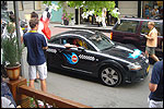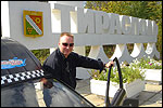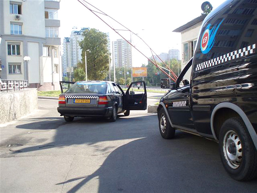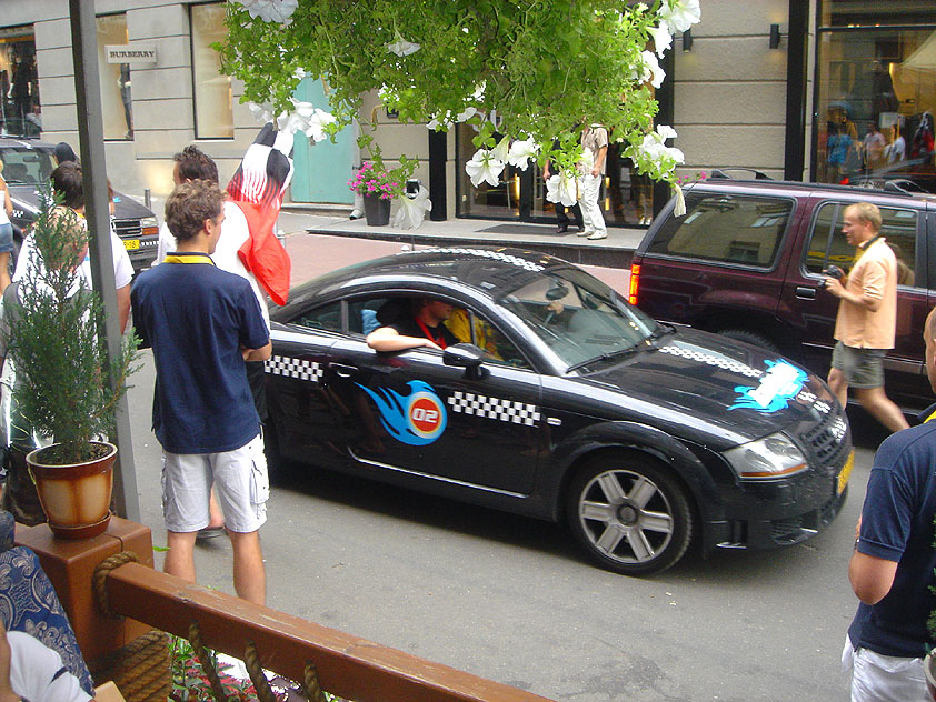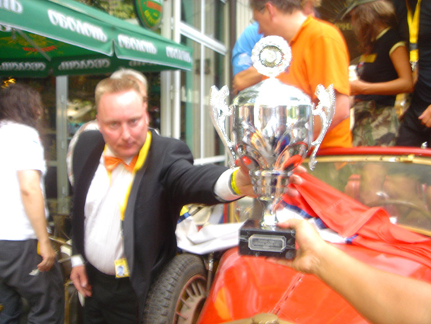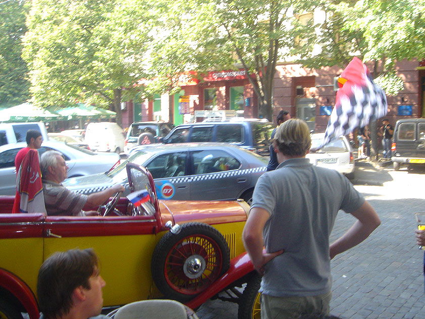 The U-turn, a trick prohibited in the entire EU, isn't just allowed, but is in fact a necessary manoeuvre, here in Ukraine. It really befalls us! En route to Kiev, we run into a sign reading 'For Kiev: make U-turn here'! So you have to steer straight through the hole in the central reservation and crash barrier, and cross the highway as you turn unto the opposite lane, then drive a few yards back, and then take the exit towards where you need to be. Utterly normal, here. Who needs the overpass? So what you get then is a heavy truck combination parked across the roadway, busy undertaking this U-turn, while everyone is pummeling towards it at speeds varying between 0 and 120 mph. A-ma-zing. I shall never forget this. This goes for the finish, in Kiev, too. All of a sudden, the world's back to normal: from this insane highway, just before Kiev, you suddenly end up on roads befitting a metropolis: shiny, new, and wide. Ever slowlier, for increasing traffic, I drive into town. Then the 'Psycho Riders' catch up with us. They realize Ed will come in handy here, since he can decipher cyrillic. So they join us in the search for bar Mokko, today's finish (TomTom's no longer an aid, as we drove off its map at the Polish/Ukrainian border). We quickly run into a dead end, on the edge of an e-nor-mous pedestrian zone. We park the cars, and Martin and Ed proceed on foot, to reconnoiter. Bas and I stay behind, and exchange experiences of the past day. Upon Ed and Martin's return, the Mokko turns out to be situated diagonally to the left, on the far side of the pedestrian boulevard. All that remains is getting there, by car, because it needs to pass under the finish flag, if we are to achieve our just spot on the ranking table. Well, that ain't easy. Crossing the pedestrian zone and getting to the other side is not the problem. But to then find the side street with the Mokko on it, that runs back down to it, turns out to be a drama. For at least an hour we drive around flabbergasted, not getting anywhere (exciting though, because the hill that leads upward from the pedestrian zone is so steep that I can only climb it in first gear, with smoking and screeching tires, even with a sizable run-up). The 'Psycho Riders' eventually give up on following us and disappear down one of those side streets, and from view, as Ed is outside the car, deciphering a sign. "Where'd they go?", he inquires upon return. "They drove thataway, downward here", I answer. "Good! We need to go in the oppposite direction!" No sooner said than done. But even THERE we don't find our vaunted side street. Having driven downhill again too, we find ourselves on the edge of the pedestrian zone, one street too far up. And while I strike up a cheerful conversation with some cabbies hanging about (Ed refuses the easiest solution, namely to ask one of them to show us the way by driving ahead of us), who automagically recognize me as a colleague (very strange, since that's not mentioned anywhere on our car or on me), Ed goes to recce on foot again. He returns out of breath. "Up! It MUST be 1 street back! It HAS to be there!" He says the same thing to Team 'The Wolf', who've come down the same hill beside us. "Follow us!" And so we go. We drive back up, 'The Wolf' in our wake, and hang a right onto the road that runs parallel to the pedestrian zone. At that moment, we are triumphantly overtaken by 'The Wolf', in their Volvo. From the sunroof, a scornful middle finger protrudes. Small thanks. Us and our good behaviour. With friends like that, who needs enemies? But when, thereupon, the majestic gate that is the entrance to the Krechatic, on which the Mokko is, appears on our right hand side, 'The Wolf' is too late to notice this, and drives just past it. Triumphantly, we press past behind them, and under the gate and Reinhard's rolling finish flag. Gotcha! Ed's middle finger scornfully sticks from the window. This royally gets to them, although it doesn't make a difference to the ranking. It namely doesn't concern order of arrival, but time of, which is nearly equal. This does not go for the 'Psycho Riders': they only arrive an hour after us. Poor dudes. by then, we've already spent an hour at the sidewalk café with the Pirates (they gained the stage victory - partly due to Ed's exit reconnaissance-and-predriving-strategy) and the rest, and after we admire a parked Lamborghini (Ed doesn't like it, but I'm breathless, although it is of course a totally impractical car on roads like these, because of its low road-holding) we leave for the Mir hotel.