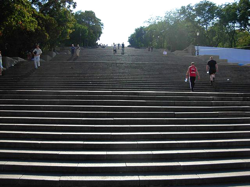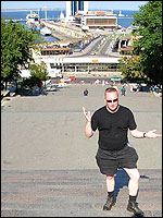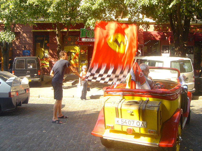 After breakfast, we roam the streets athree, as, having catnapped, Ed does on his own (he, amongst other things, gets a haircut). Lured by large posters depicting objectives, we amble into a gun store, where the knight's harnesses in the hallway prove to be the least unusual article available: they range from fishing tackle, outsized knives included, via handheld guns to sniperrifles-with-telescopic-sight-and-silencer, to AK-47's at €300,- apiece and heavier firearms than the Dutch army brings to conflict zones. Whether I can buy a taser for in my taxi? "No sir, that is an illegal arm in Ukraine." En route to the Potemkin stairs (of movie fame) we descend a different set of stairs (we shall later learn from at least one team that they erroneously held these to be the Potemkin stairs) when Aad suddenly cries eureka. He recalls that, during the first rally drivers meeting preceding the rally, in the Tara's on the Rokin in Amsterdam, flagman Reinhard told him: "Yeah, and it's great, such a rally, because for some reason or other one or more teams finish equal, and then we have a last man standing contest!". Now the coin drops for me too. I was there, and I can remember this indeed. Asked how the equal finish was arranged Reinhard said: "Well, as organizers you can steer things a little eh", I now also remember. Suddenly everything falls into place. The Bokitos must have despaired, that there was such a difference between the Pirates and the other teams, in the ranking. Much harder to organize that last man standing contest after all. And that you'd want to have one, THAT we can imagine, because you then keep your last club party, that after all takes place after the finish, interesting, for everyone. Put into a milder mindset about it all by this discovery, we sprightly descend the fake stairs, at the foot of which, at a small grocery store, I produce a small drawing of stairs leading down to waves. "Ah, the Potemkin stairs!", the punters cry, and 1 corner and 300 yards later we are at the foot of those stairs indeed. But it's a letdown. Their grandeur is namely heavily detrimented by a motorway at its foot, created at a later stage, with, below it, of all things, a car dealer. Striking, also, is that there is no tourist trap, barring one lonesome salesman of old soviet medals. Strange, when you realize this is Odessa's most famous monument.